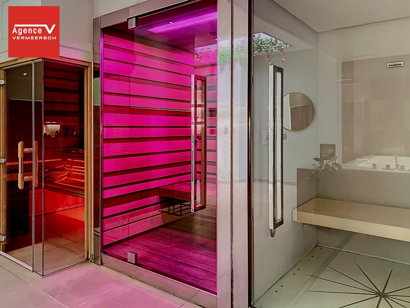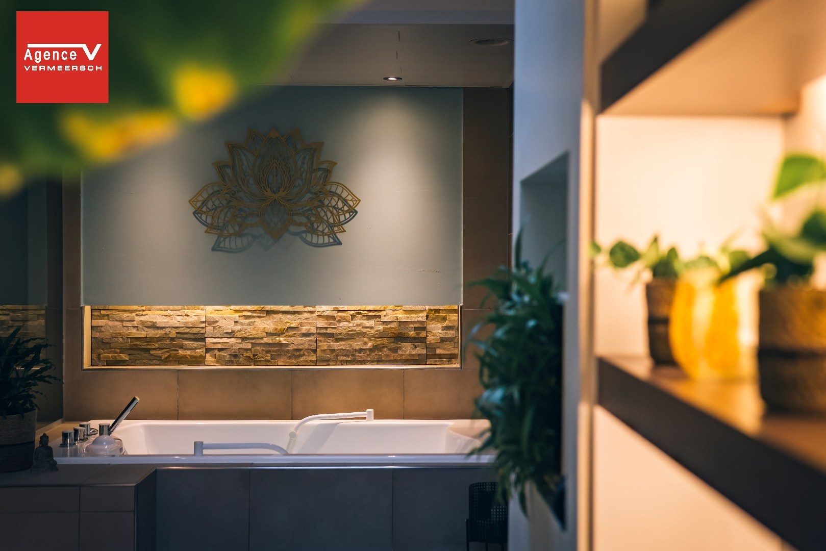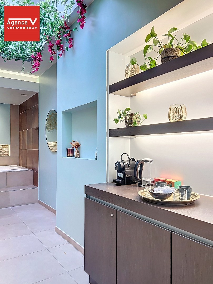 Gelijkvloers: ontvangstruimte – balie – 2 behandelkamers – 2 ruime toiletten – wasplaats – achteraan een luxueus ingerichte Wellness met jacuzzi, inloopdouche, hammam, sauna, infraroodcabine - apart toilet.
