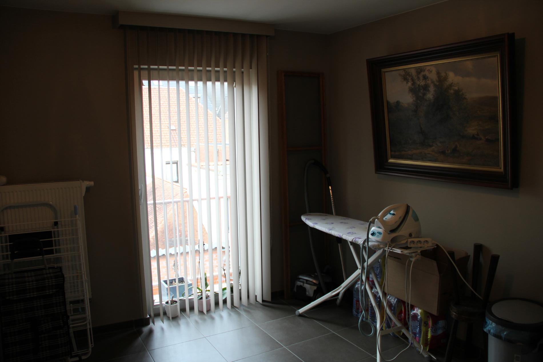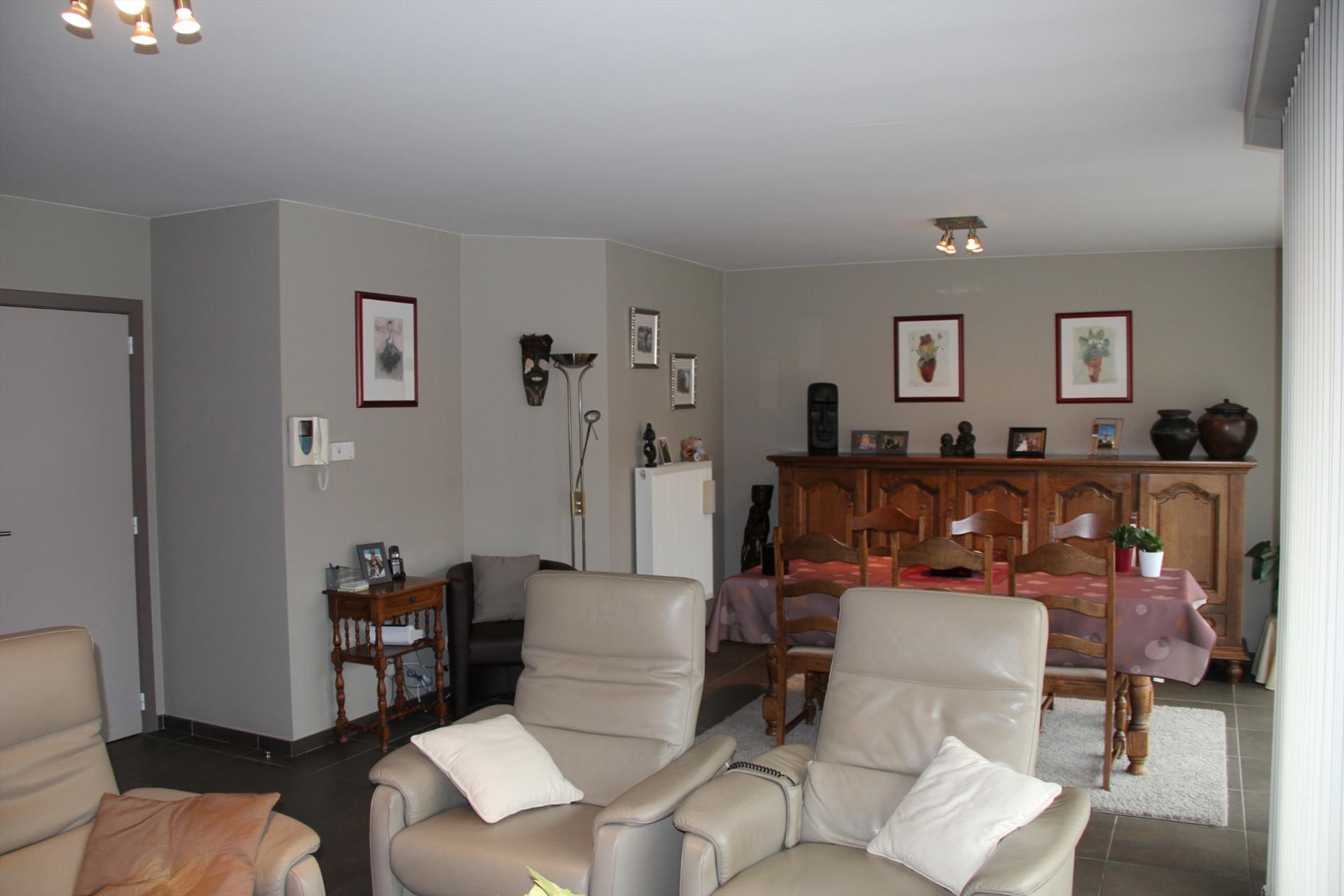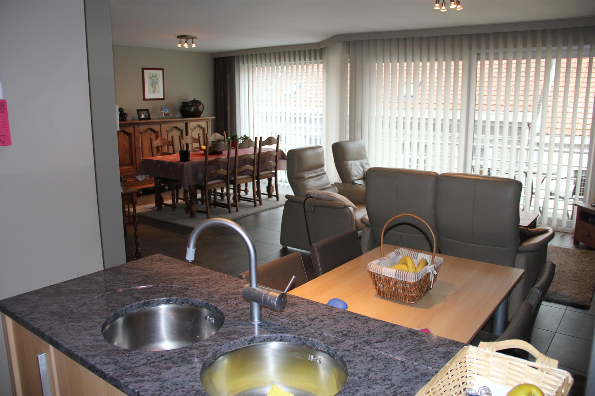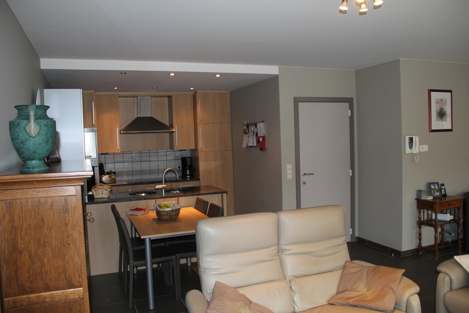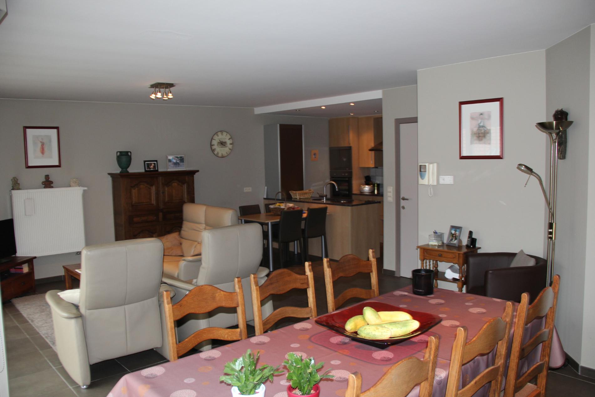 Inkomhal met vestiaire,- stook- & bergplaats met aardgas-wandgenerator (voor centrale verwarming en warmwater-distributie), en aansluiting voor wasautomaat,- toilet met wc en lavabo (mooie faience),- living (ca. 30 m²) met videofoon,- aansluitende open keuken (3,80 x 2,85), met keukenblok voorzien van onder- en bovenkasten + ingebouwde ceramische kookplaat, hangdampkap (inox), heteluchtoven en koelkast ; en 2de keukenblok met onderkasten + ingebouwde vaatwasautomaat en dubbele inox afwasbak,- groot zonneterras (vloer in bangkirai-planken),- grote slaapkamer (3,90 x 3,35) met veluxraam en terras,- 2de slaapkamer (2,85 x 3,65) met ganse wand ingemaakte kasten + toegang naar terras,- ruime badkamer (ca. 6m²) met ligbad en toiletmeubel + ingebouwde lavabo (marmerachtige faience * veluxraam) ;