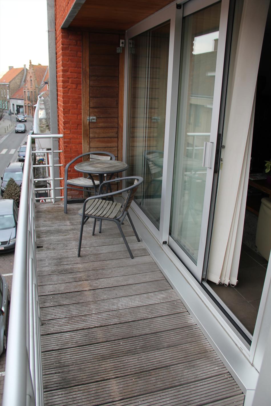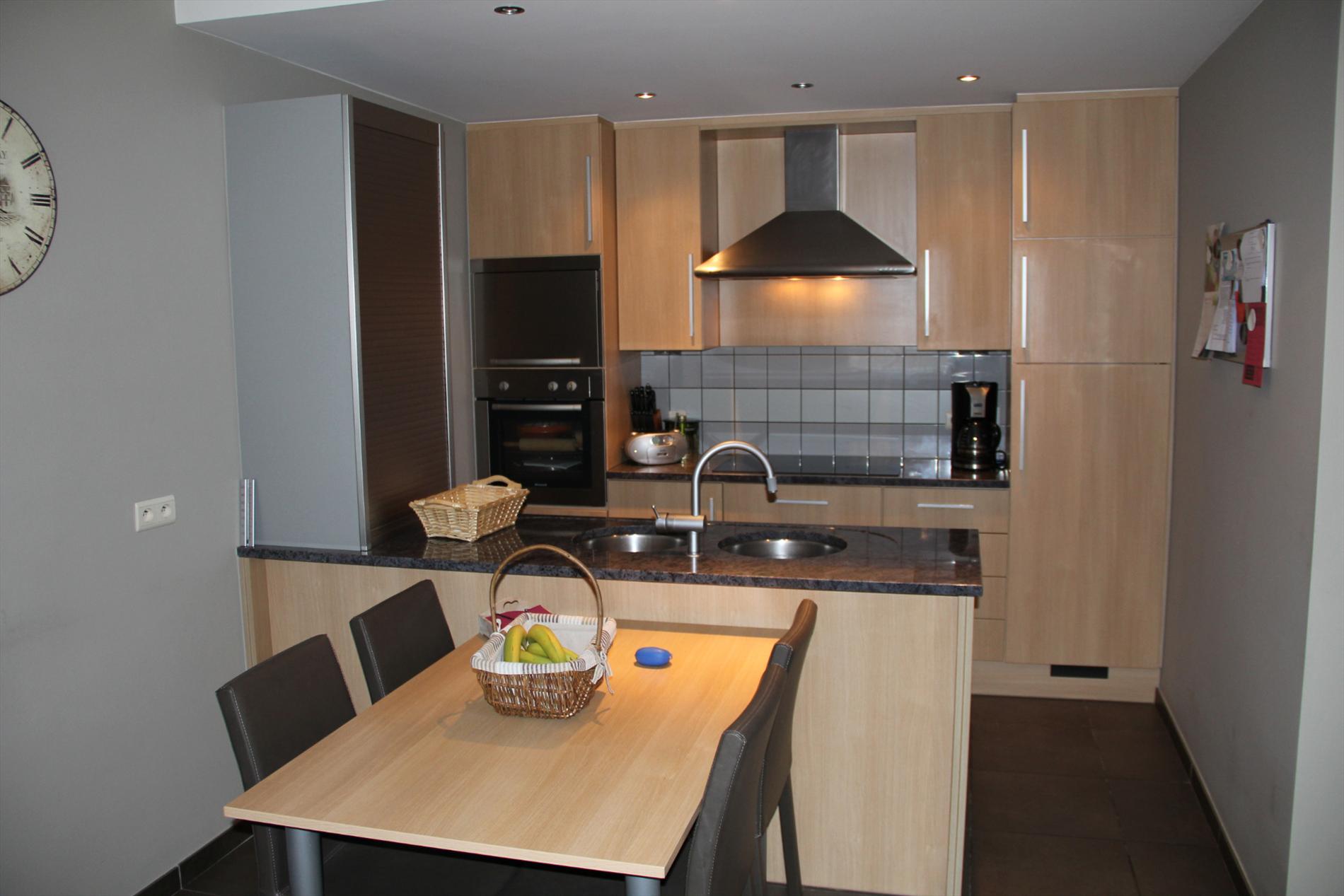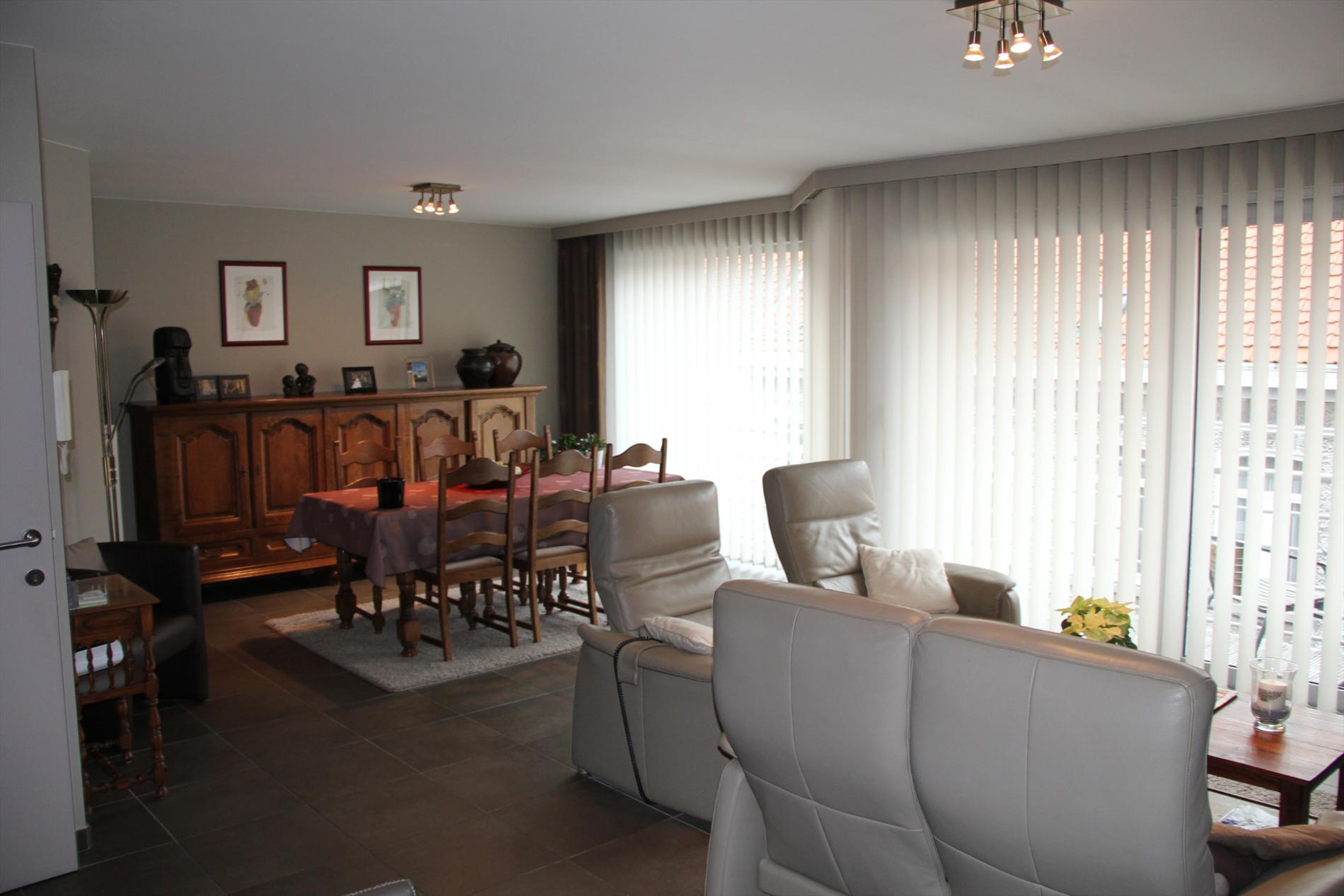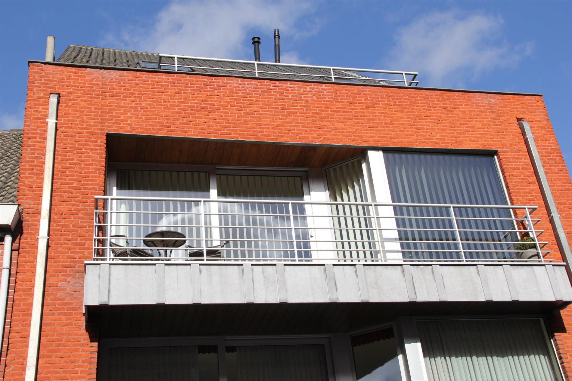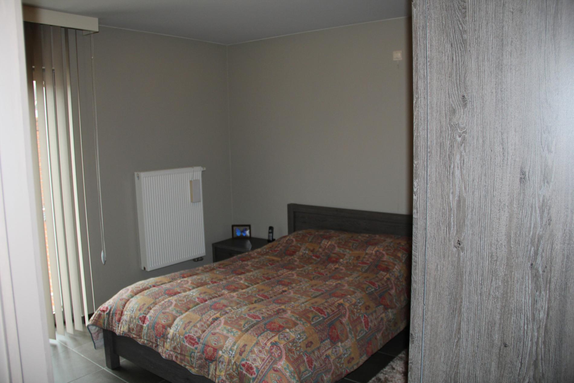 Inkomhal met vestiaire,- stook- & bergplaats met aardgas-wandgenerator (voor centrale verwarming en warmwater-distributie), en aansluiting voor wasautomaat,- toilet met wc en lavabo (mooie faience),- living (ca. 30 m²) met videofoon,- aansluitende open keuken (3,80 x 2,85), met keukenblok voorzien van onder- en bovenkasten + ingebouwde ceramische kookplaat, hangdampkap (inox), heteluchtoven en koelkast ; en 2de keukenblok met onderkasten + ingebouwde vaatwasautomaat en dubbele inox afwasbak,- groot zonneterras (vloer in bangkirai-planken),- grote slaapkamer (3,90 x 3,35) met veluxraam en terras,- 2de slaapkamer (2,85 x 3,65) met ganse wand ingemaakte kasten + toegang naar terras,- ruime badkamer (ca. 6m²) met ligbad en toiletmeubel + ingebouwde lavabo (marmerachtige faience * veluxraam) ;