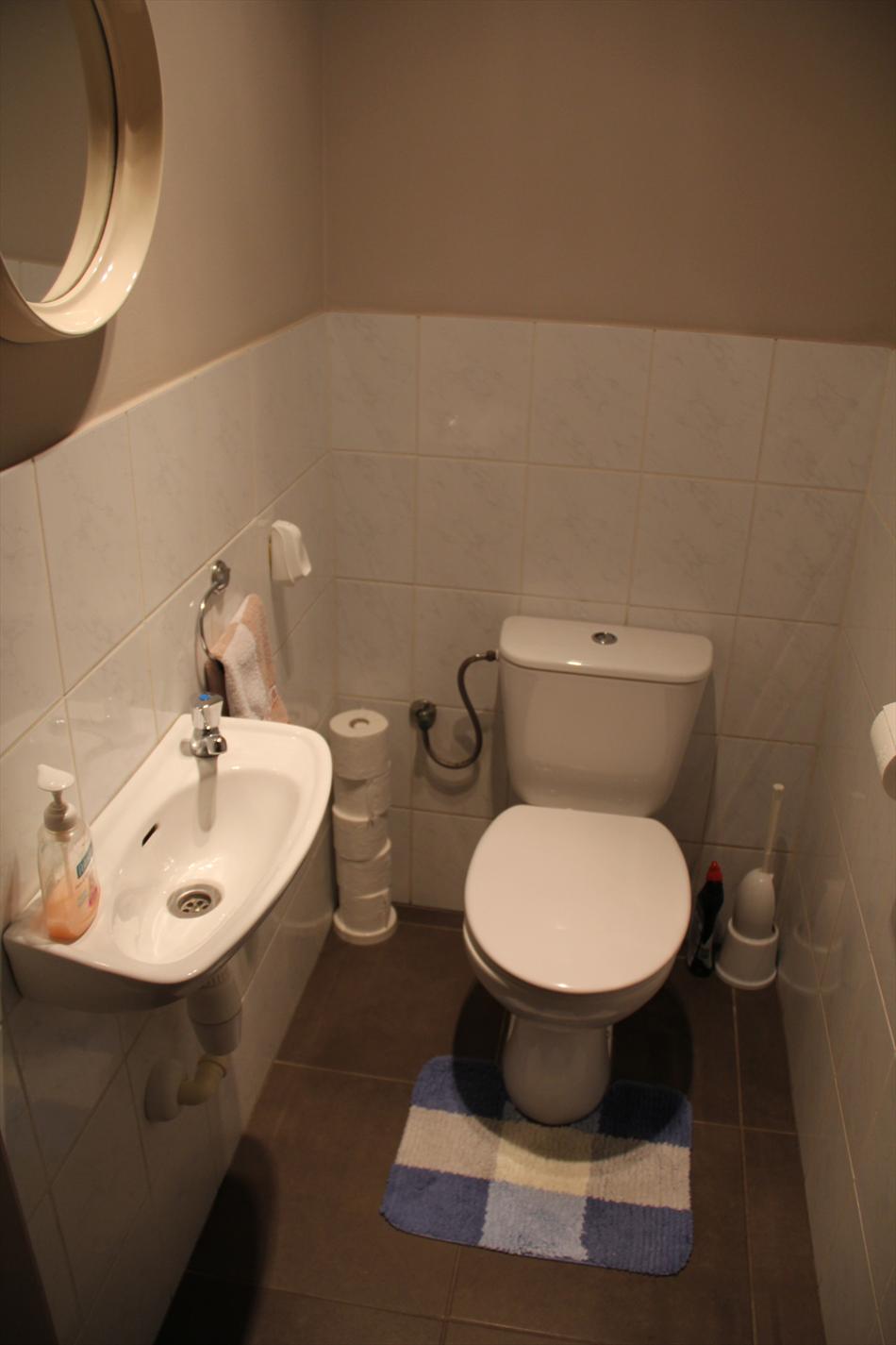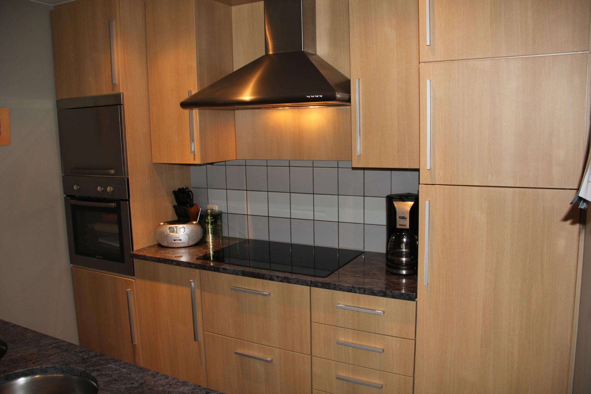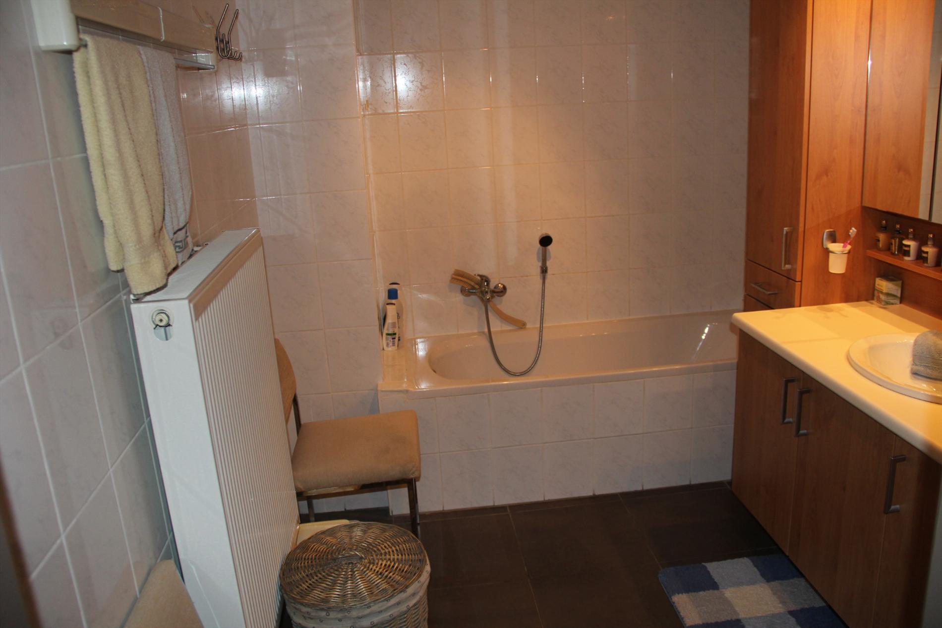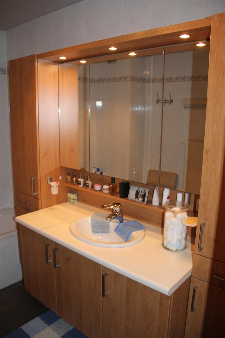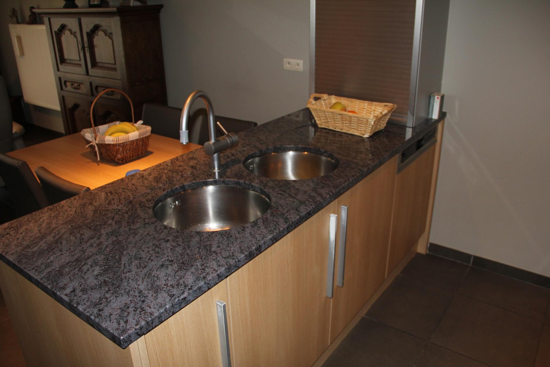 Inkomhal met vestiaire,- stook- & bergplaats met aardgas-wandgenerator (voor centrale verwarming en warmwater-distributie), en aansluiting voor wasautomaat,- toilet met wc en lavabo (mooie faience),- living (ca. 30 m²) met videofoon,- aansluitende open keuken (3,80 x 2,85), met keukenblok voorzien van onder- en bovenkasten + ingebouwde ceramische kookplaat, hangdampkap (inox), heteluchtoven en koelkast ; en 2de keukenblok met onderkasten + ingebouwde vaatwasautomaat en dubbele inox afwasbak,- groot zonneterras (vloer in bangkirai-planken),- grote slaapkamer (3,90 x 3,35) met veluxraam en terras,- 2de slaapkamer (2,85 x 3,65) met ganse wand ingemaakte kasten + toegang naar terras,- ruime badkamer (ca. 6m²) met ligbad en toiletmeubel + ingebouwde lavabo (marmerachtige faience * veluxraam) ;