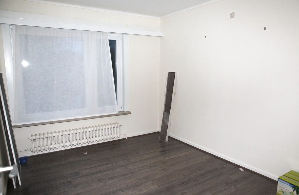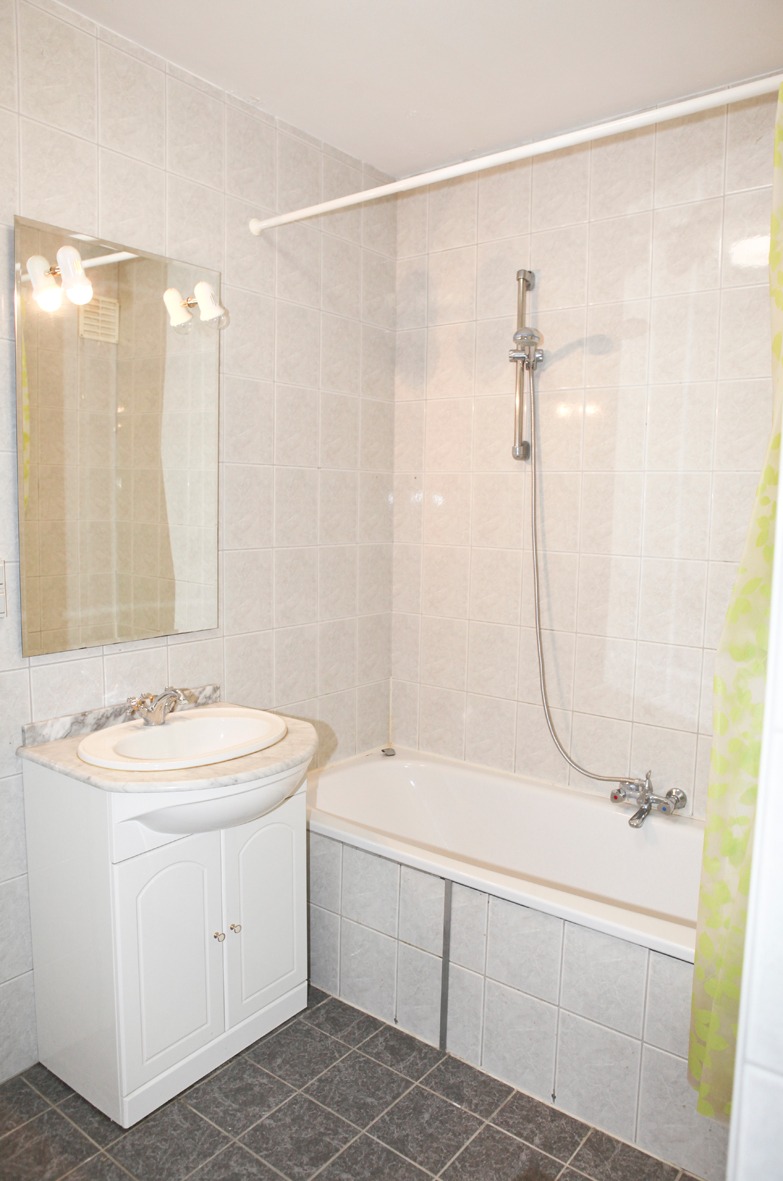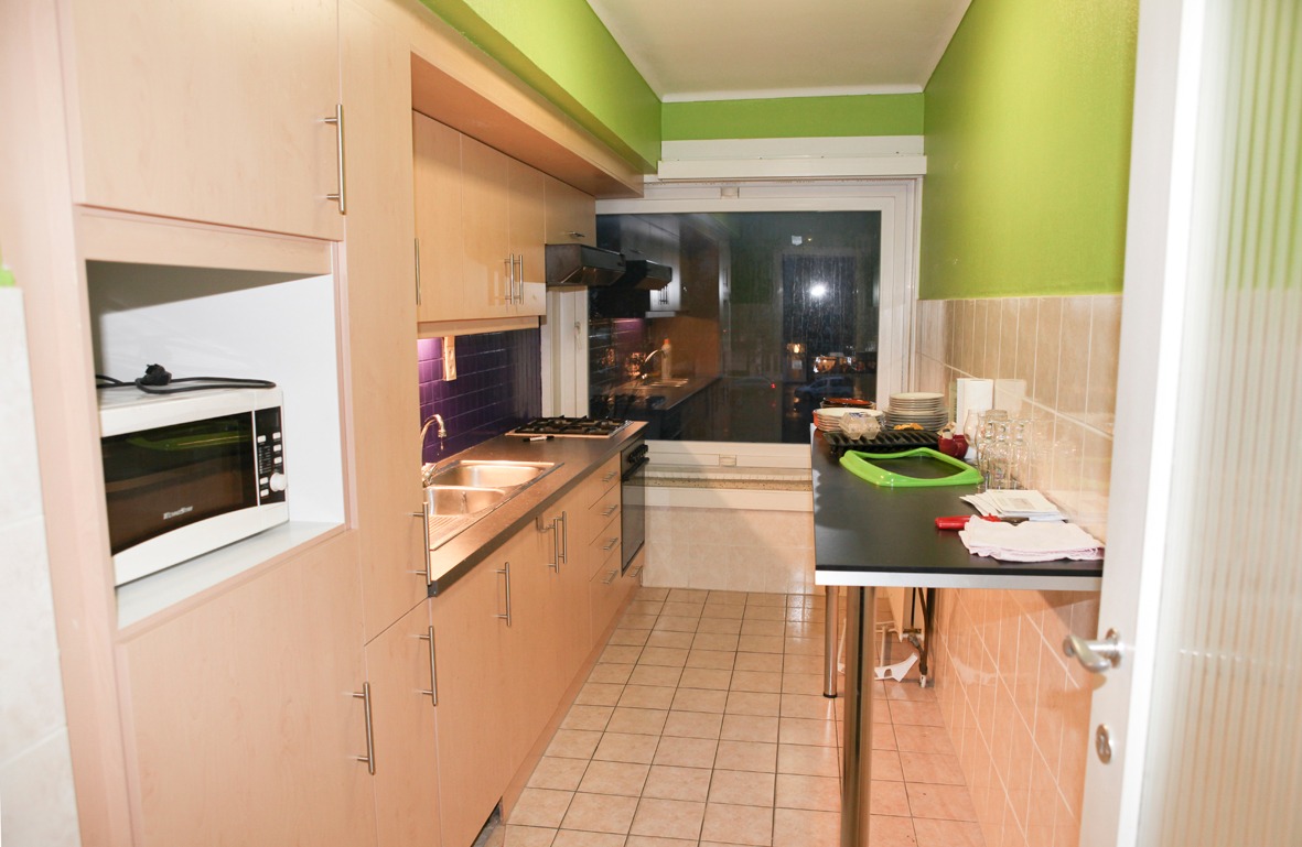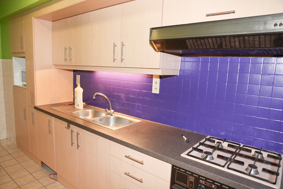 Ruime inkomhall met ingemaakte vestiaire en parlofoon,- hoek-living (8.55 x 3.72),- keuken (4,27 x 1,90) met vaste eettafel en keukenblok voorzien van onder- en bovenkasten + ingebouwde aardgas-kookplaat, oven, dampkap, dubbele inox-afwasbak, koelkast en nis + microgolfoven,- nachthall,- slaapkamer 1 (4,40 x 3,35),- toilet,- slaapkamer 2 ( 3,70 x 3),- badkamer met ligbad, toiletmeubel + ingebouwde lavabo (marmeren tablet),- overdekte koer-berging met elektrische boiler en aansluiting voor was- en droogautomaat,- en achter-slaapkamer (4,12 x 2,15), kelderberging nr. 2.