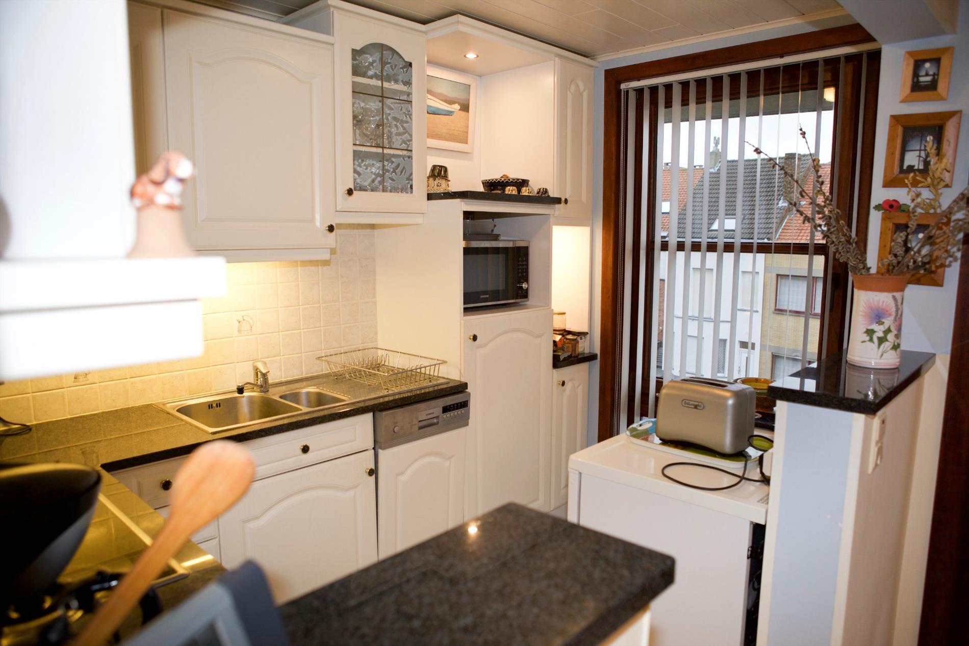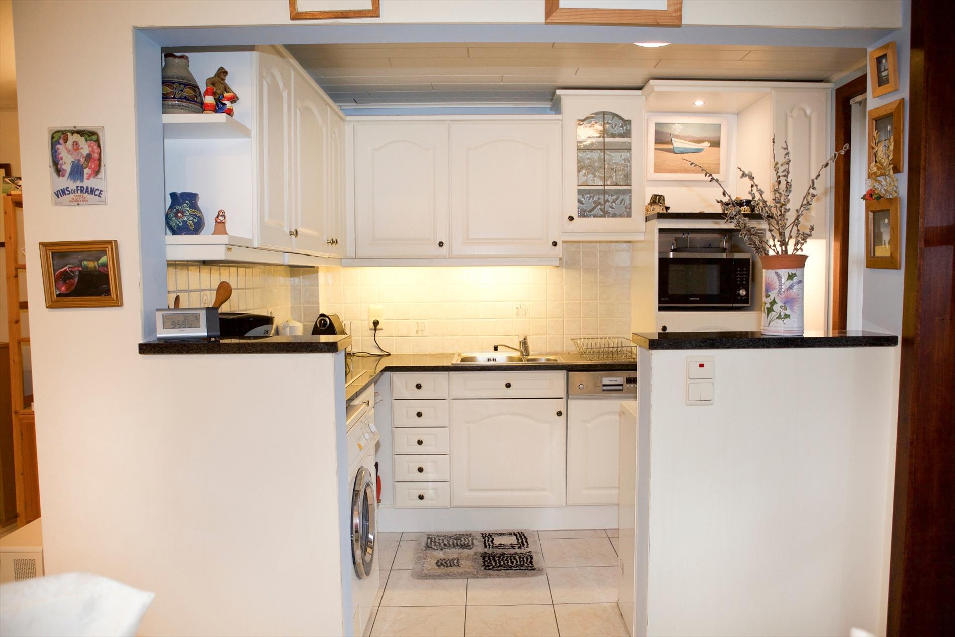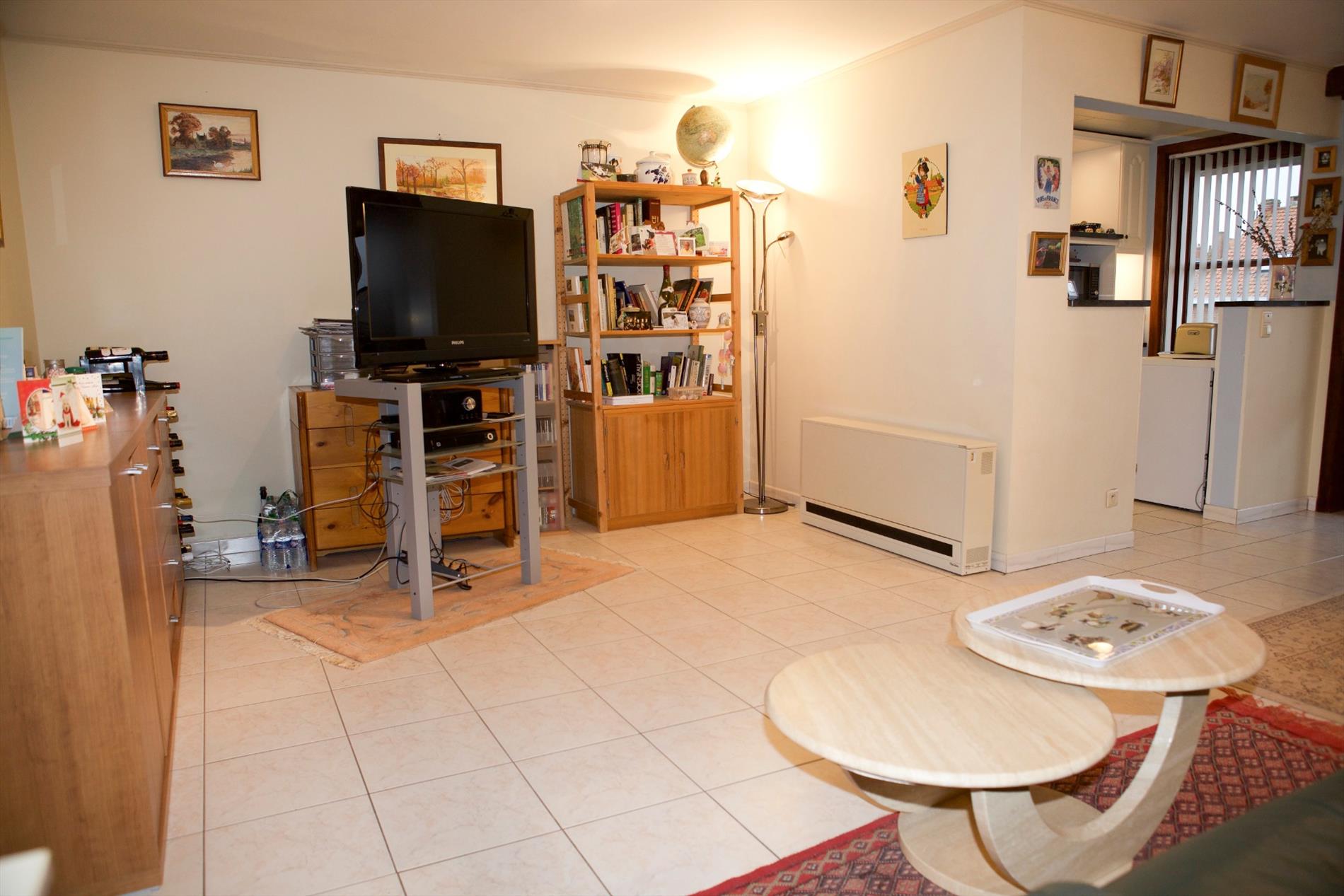 Inkomhal + videofoon (nieuwe voordeur PVC + glaswerk),- toilet met wc + elektrische boiler,- berging + zekeringskast,- prachtige badkamer (1,75 x 1,42 ) met douche en toiletmeubel + ingebouwde lavabo (granieten tablet),- living (27m²) + glazen deur,- zonneterras (3,10 x 1,65),- mooie keuken (2,90 x 2,13) met L-vormige keukenblok (onder- en bovenkasten) + ingebouwde dubbele inox afwasbak, ceramische kookplaat, microgolfoven, dampkap, frigo, vaatwasautomaat, wasmachine, diepvriezer, en droogkast (laminaat-plafond),- en slaapkamer (3,86 x 3,11 * nieuw PVC-raam) ;