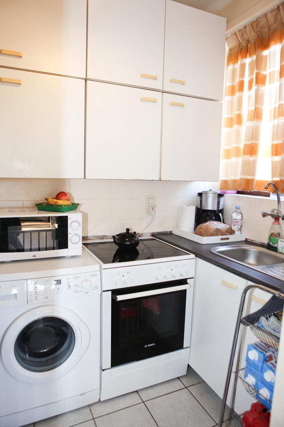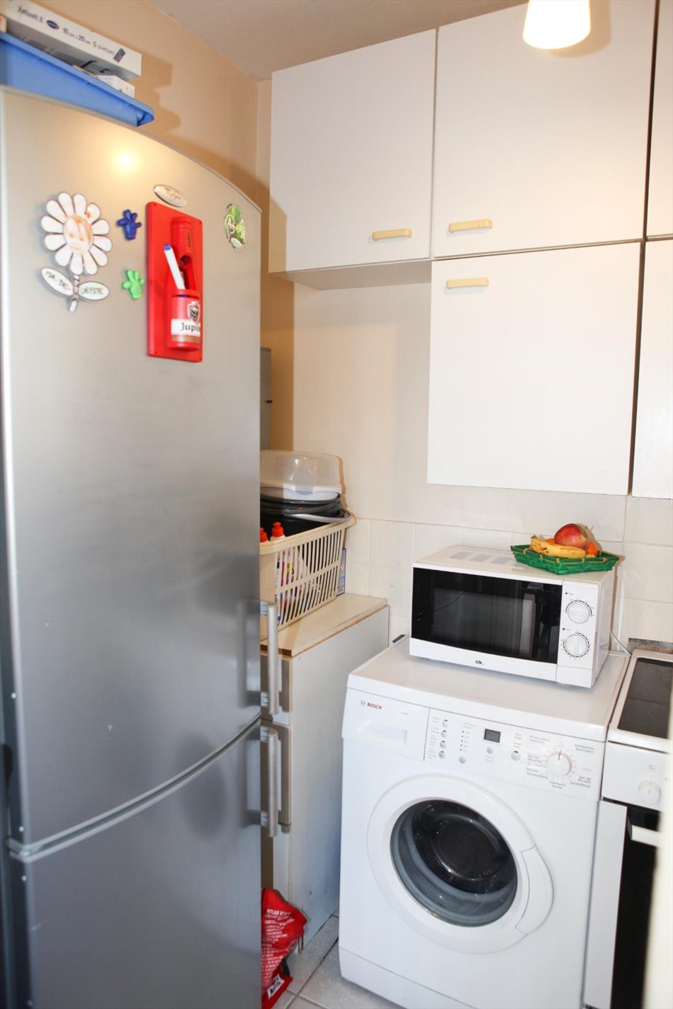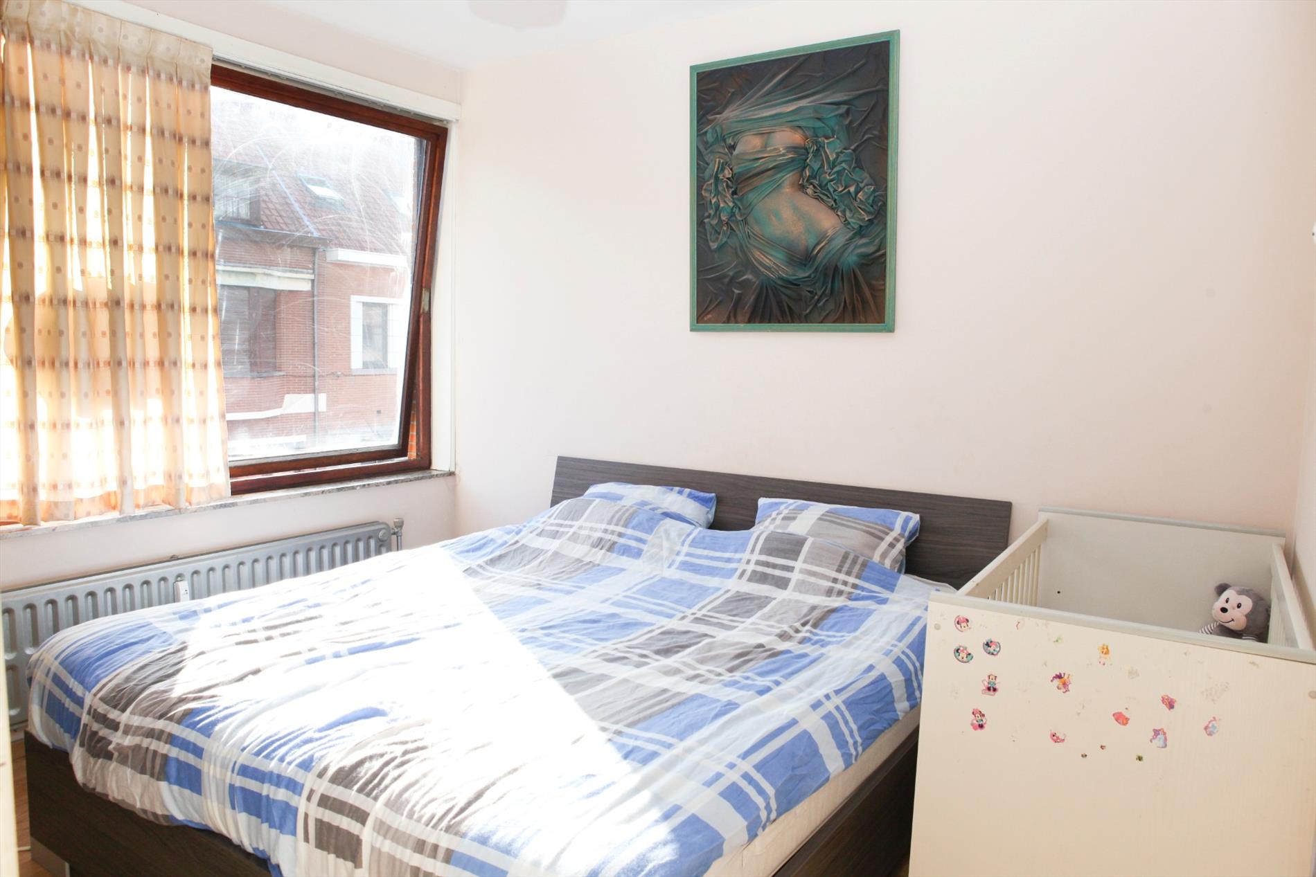 hall, luchtige hoek living (25,50 m²) met groen zicht,- keuken (1,70 x 2,65) voorzien van spoelbak, kunststof werkblad, kasten, kookfornuis en was/vaatwas aansluiting, badkamer met wc + lavabomeubel, ligbad met douchescherm en ventilatie,- twee slaapkamers (1 met ingemaakte kast – 2,80 x 3,50 – 2,62 x 2,85),- kelder (4 m²).