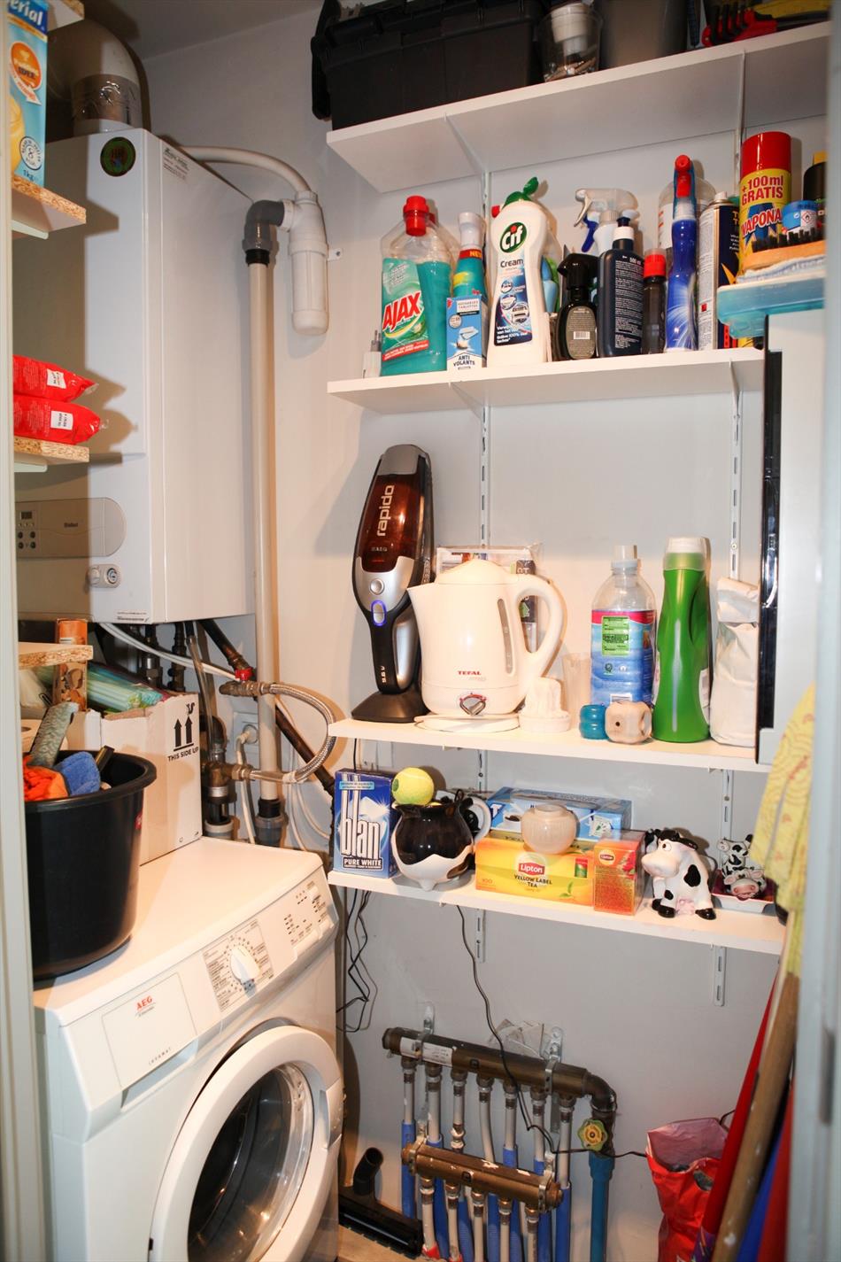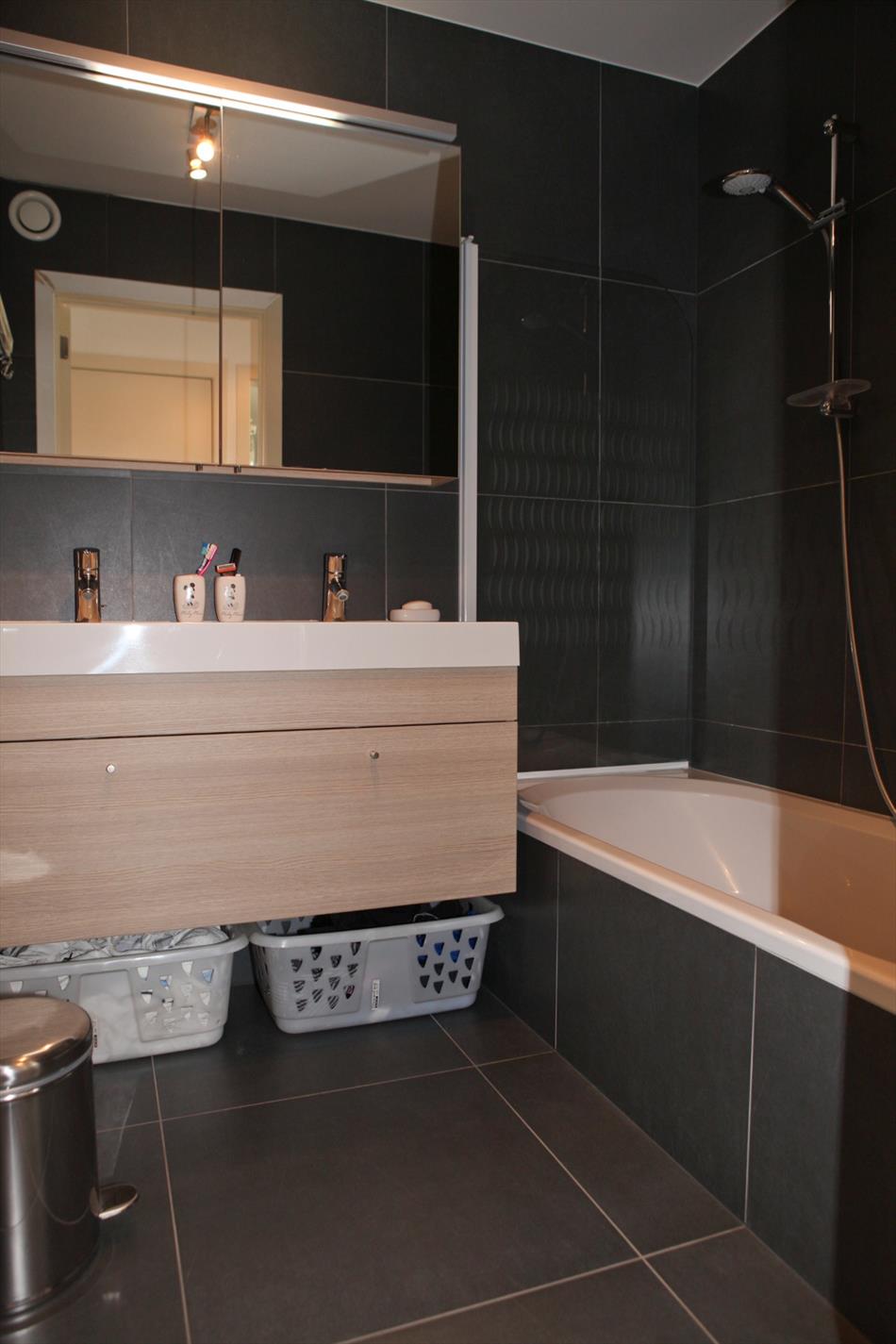 Hall met voordeur + judasoog, videofoon,- woonkamer (5,70 x 5) met terrasschuifraam,- zonneterras (1,52 x 2,33) met bankirai vloerbekleding,- half-open keuken (1,80 x 2,80) met kasten, dubbele spoelbak, keramische kookplaat, dampkap, combi-microgolfoven, koelkast, vaatwasautomaat en faience,- berging met CV en was aansluiting,- nachthall met glazen deur,- toilet met hang-wc en meubel+lavabo,- badkamer (1,90 x 1,70) met ligbad + douche wand, dubbel badkamer meubel en faience,- voor-slaapkamer 1 (4,18 x 2,70),- achter-slaapkamer 2 (9,36 m²) met ingemaakte kast,- kelder (1 x 1,88).