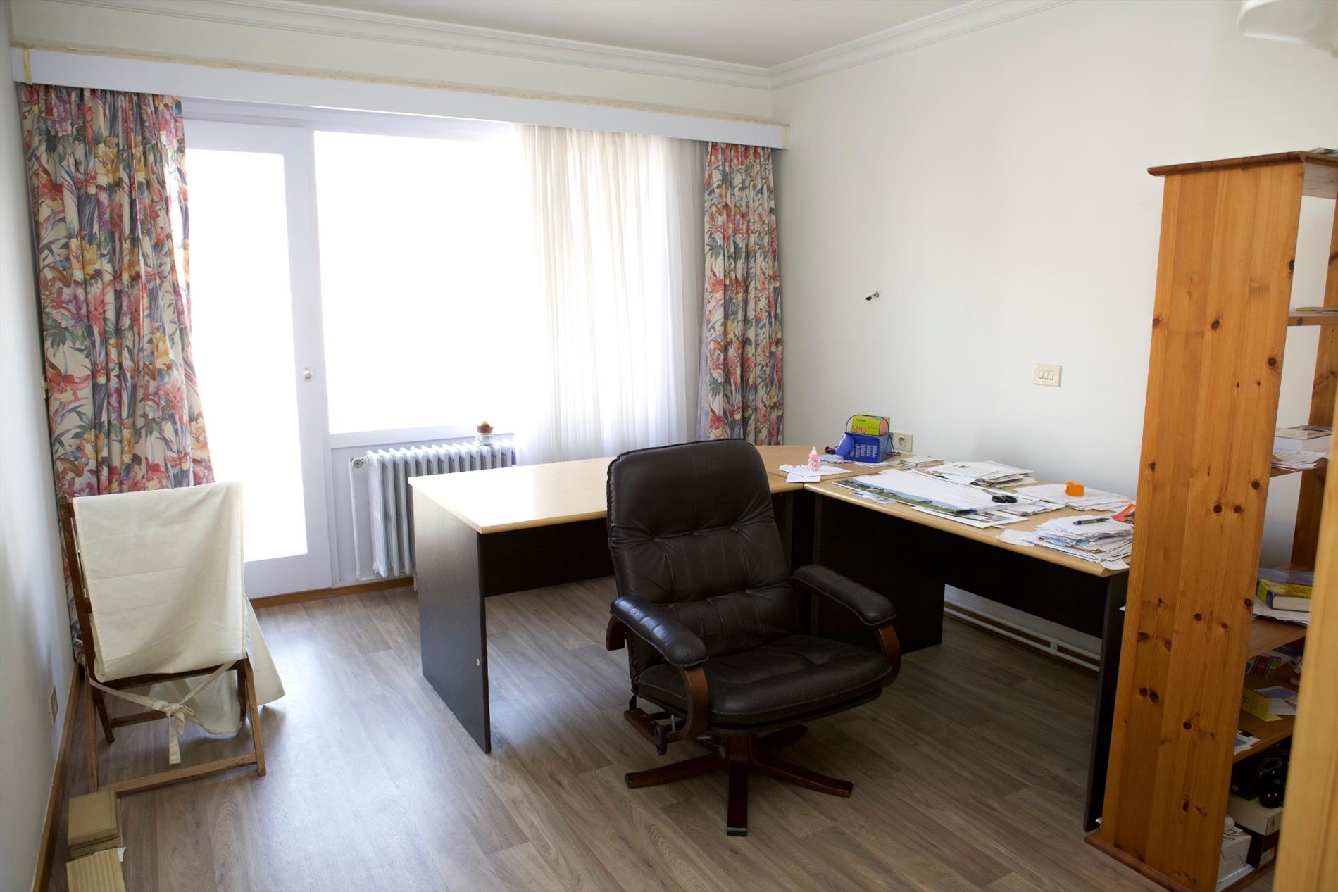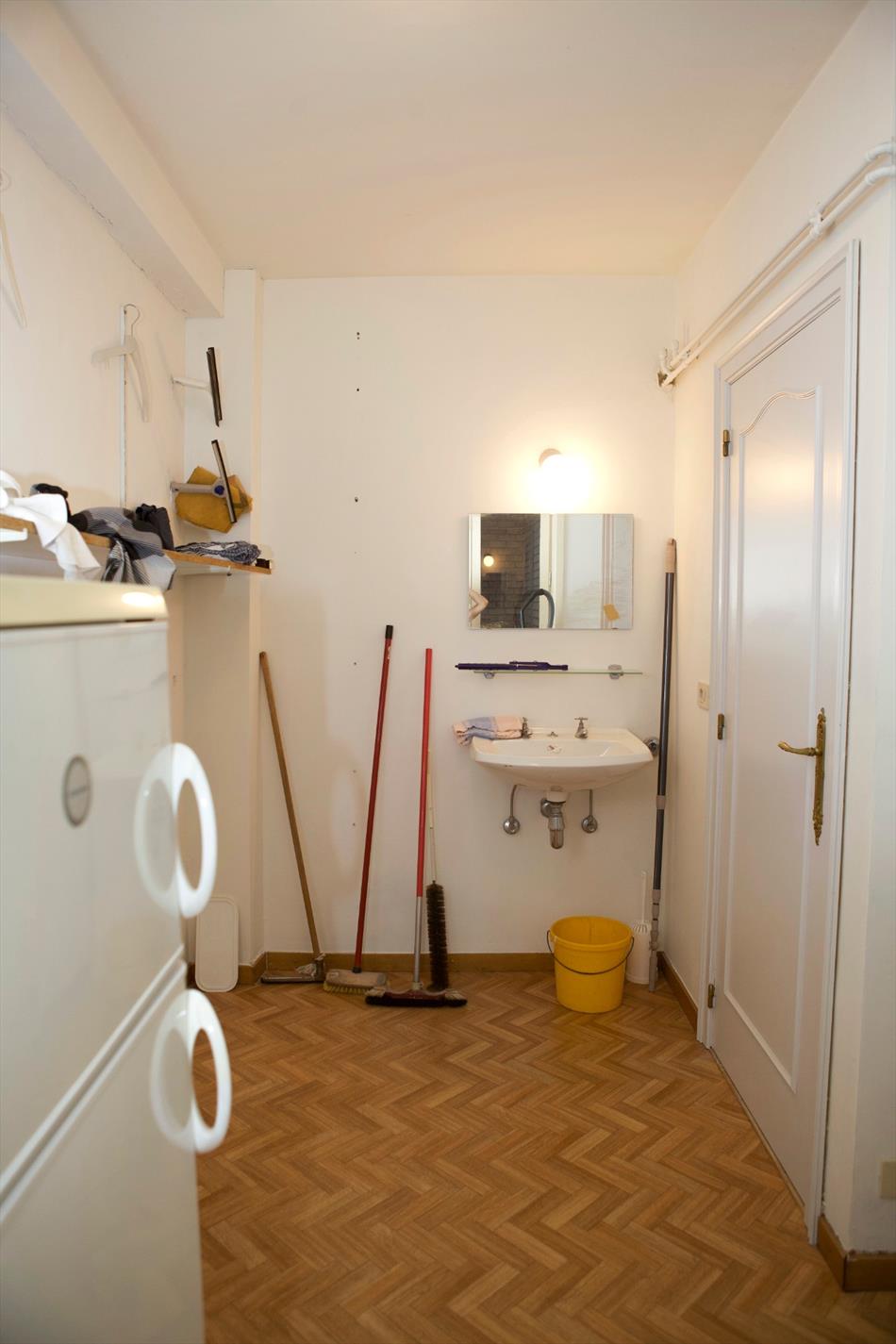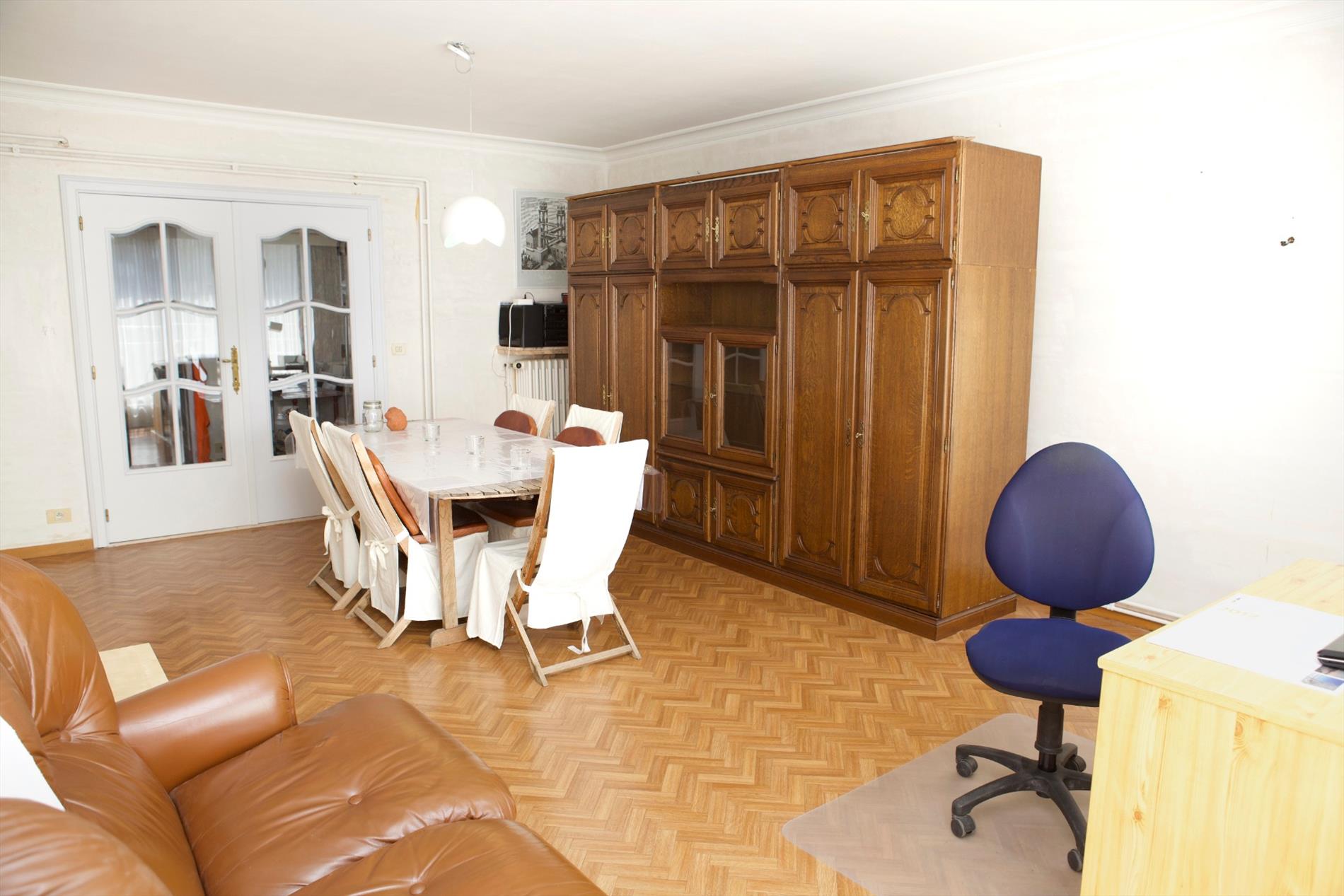 Inkom- & nachthall + ingemaakte vestiairekasten,- zonnige & luchtige living (6,27 x 4,36) + terras-schuifdeur,- keuken (4,42 x 1,90) met keukenblok (onder- en bovenkasten) + ingebouwde dubbele inox afwasbak, elektrisch kookfornuis, dampkap, vaatwasautomaat + ingemaakte keukenkasten,- terras toegankelijk via keuken & living,- toilet met w.c. + lavabo,- badkamer (2,26 x 2,10) met ligbad, dubbele lavabo, bidet, en spiegelkast,- slaapkamer (3,68 x 2,59),- 2 achter-slaapkamers (4,18 x 3,40 en 4,8 x 2,80),- achter-terras + débarras,- en kelderberging nr. 5 (3,34 x 1,41).