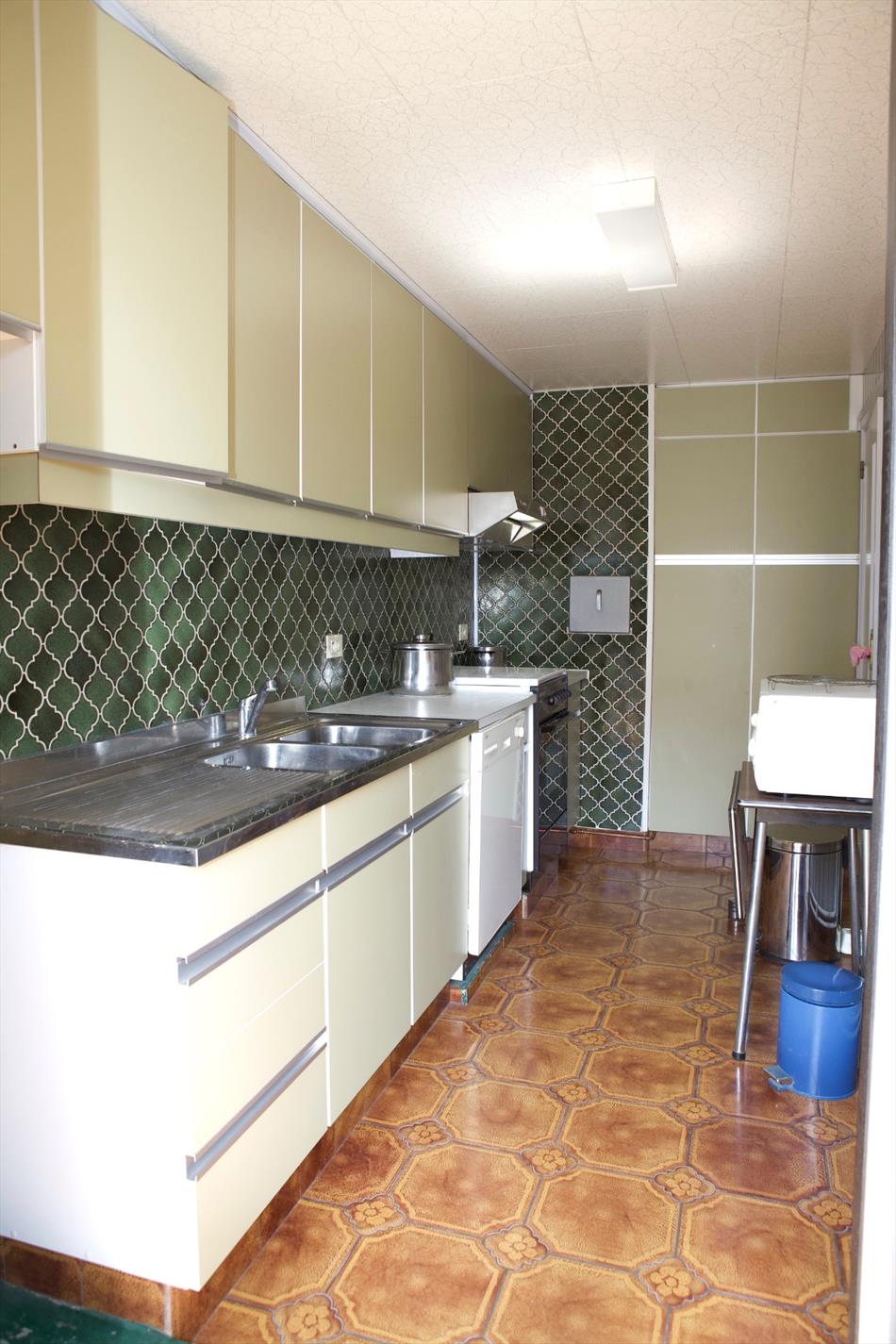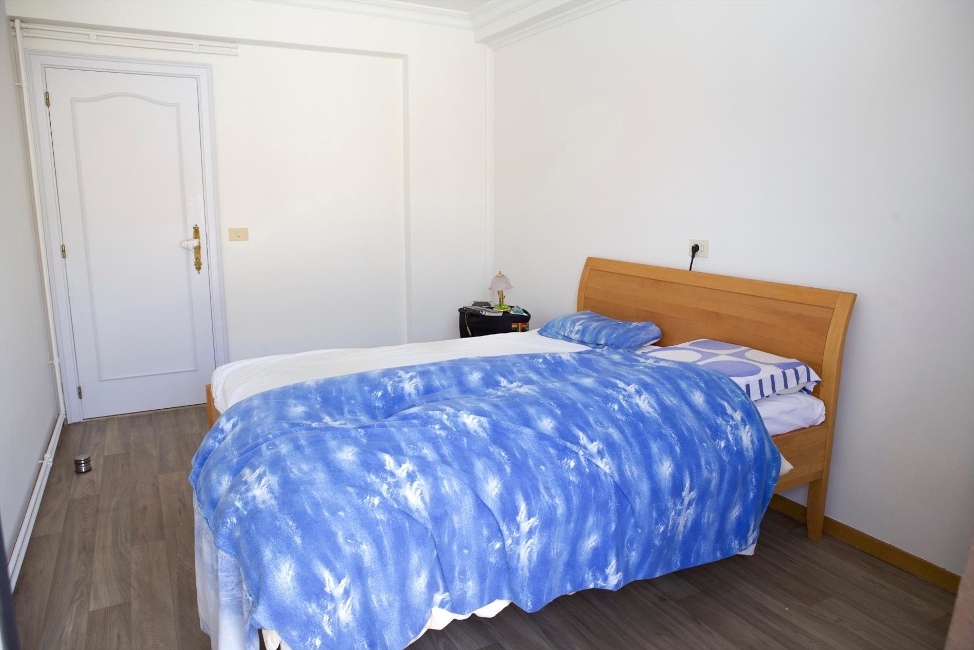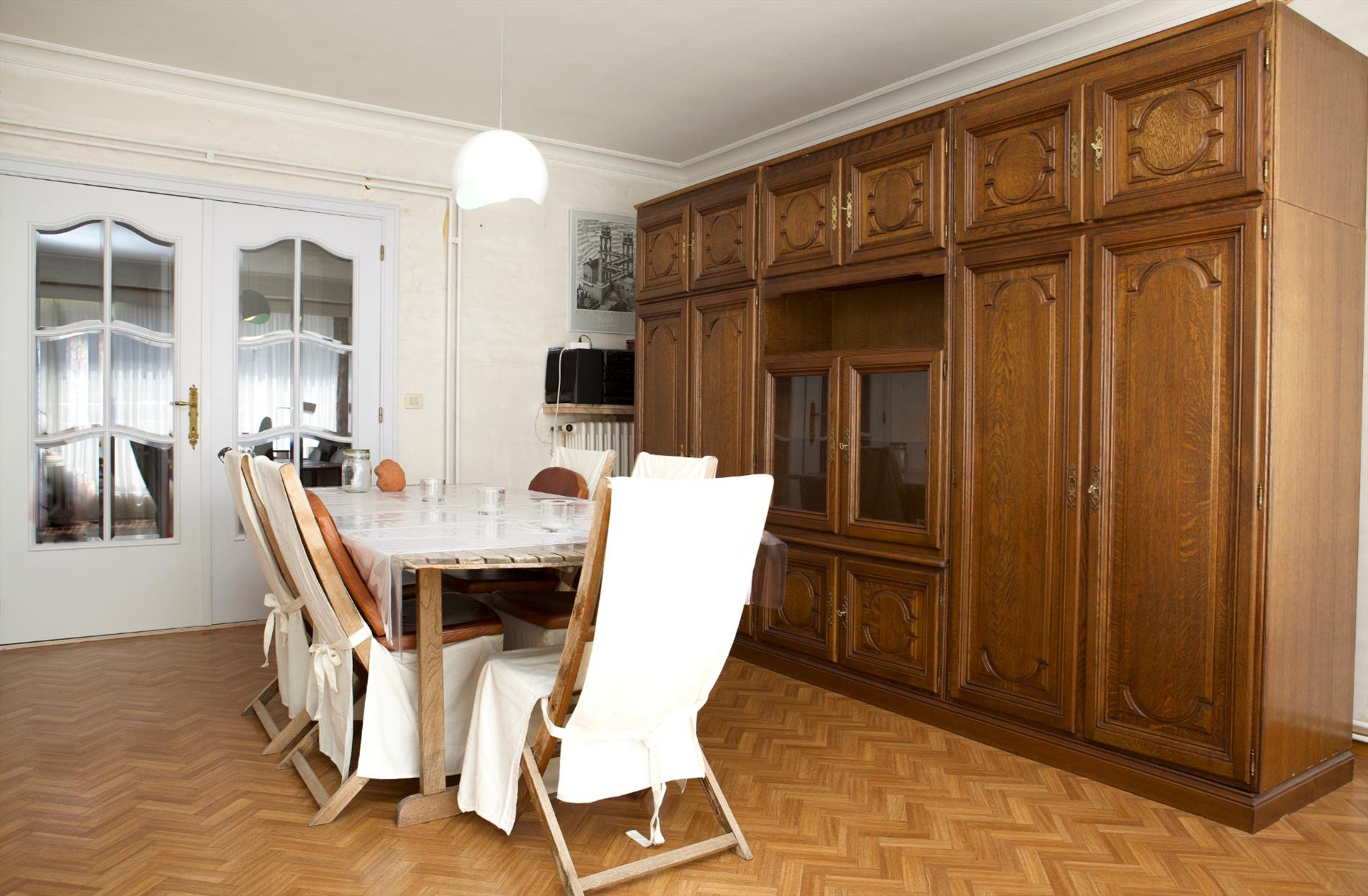 Inkom- & nachthall + ingemaakte vestiairekasten,- zonnige & luchtige living (6,27 x 4,36) + terras-schuifdeur,- keuken (4,42 x 1,90) met keukenblok (onder- en bovenkasten) + ingebouwde dubbele inox afwasbak, elektrisch kookfornuis, dampkap, vaatwasautomaat + ingemaakte keukenkasten,- terras toegankelijk via keuken & living,- toilet met w.c. + lavabo,- badkamer (2,26 x 2,10) met ligbad, dubbele lavabo, bidet, en spiegelkast,- slaapkamer (3,68 x 2,59),- 2 achter-slaapkamers (4,18 x 3,40 en 4,8 x 2,80),- achter-terras + débarras,- en kelderberging nr. 5 (3,34 x 1,41).