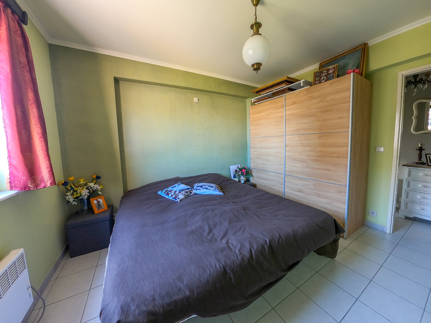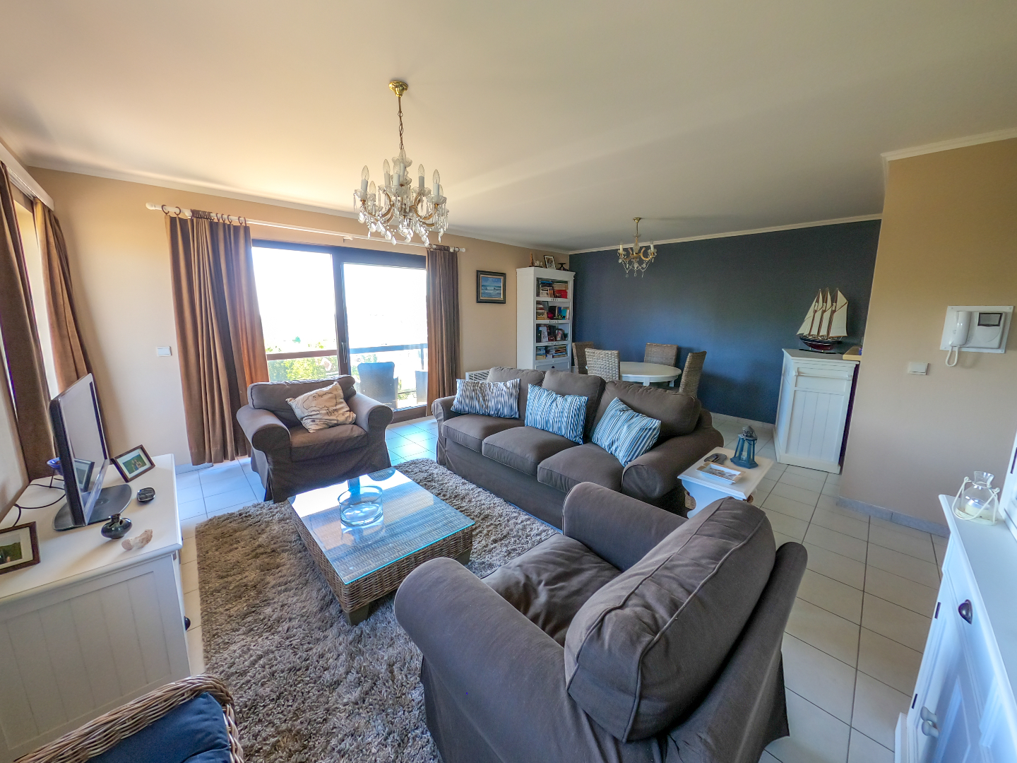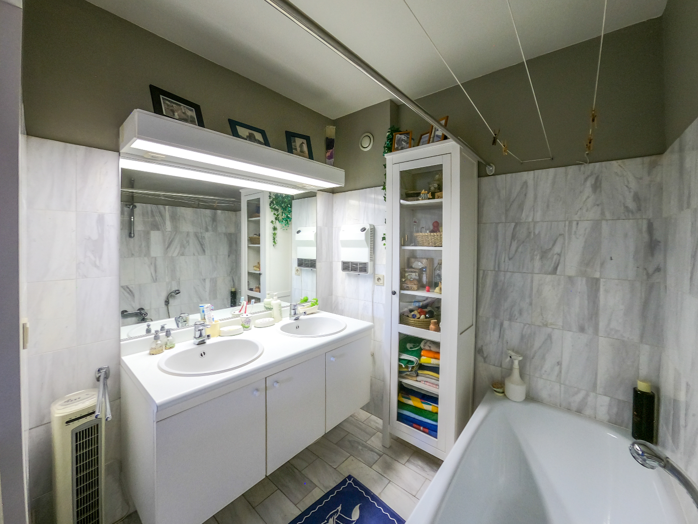 Living (30 m²) + videofoon,- hoek-terrassen (16 m²) + alu-balustrade + gefumeerd glas,- half-open keuken (2,40 x 1,80) met L-vormige keukenblok + ingebouwde inox afwasbak, frigo, oven, elektrische kookplaat, en dampkap (marmeren faience),- inkomhal,- berging + elektrische boiler en aansluiting wasautomaat,- toilet (marmeren faience),- badkamer met ligbad en toiletmeubel + 2 ingebouwde lavabo’s (marmeren faience),- en 2 slaapkamers (elk 3,60 x 3) met TV-aansluiting.
