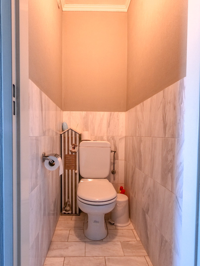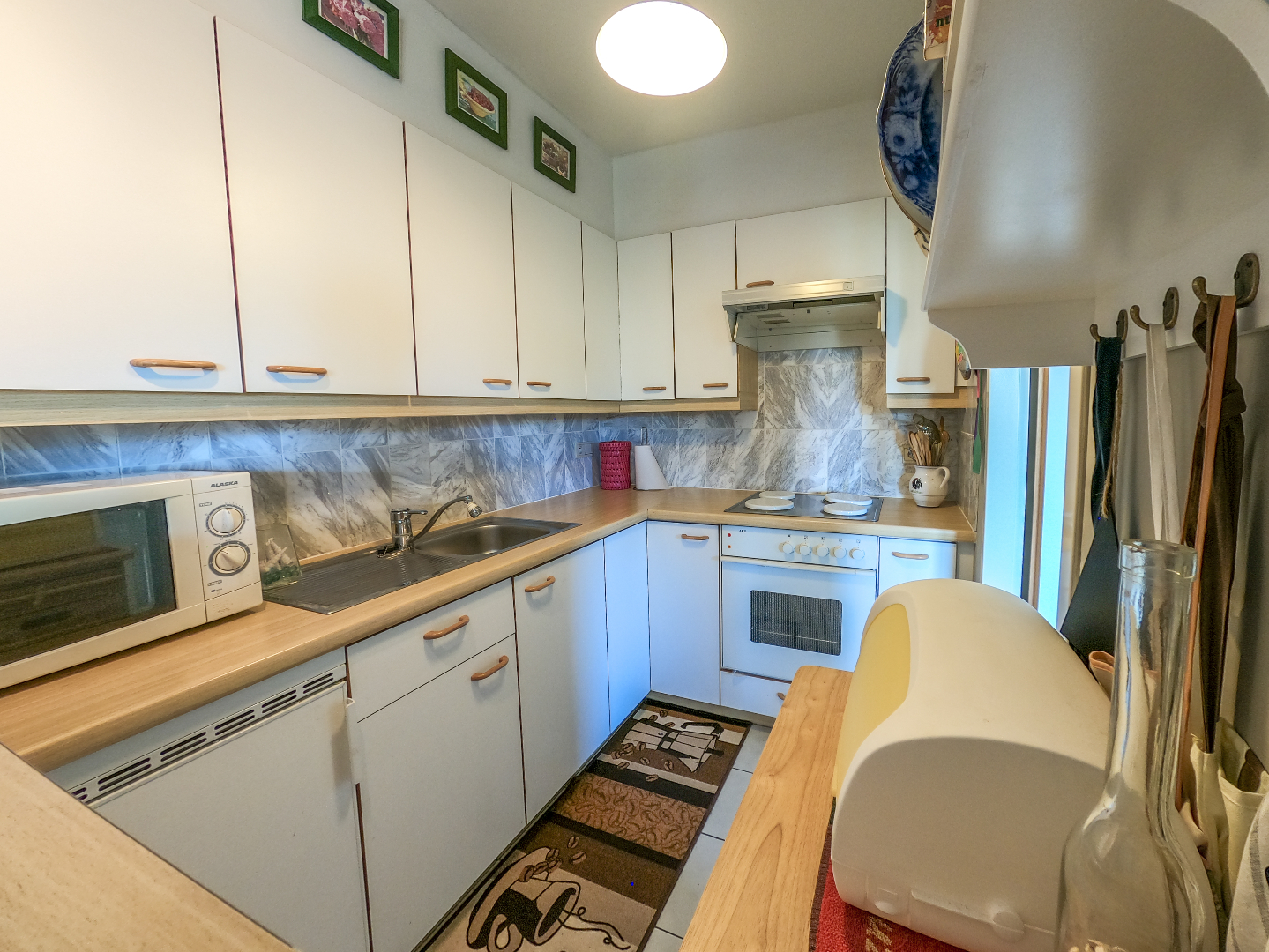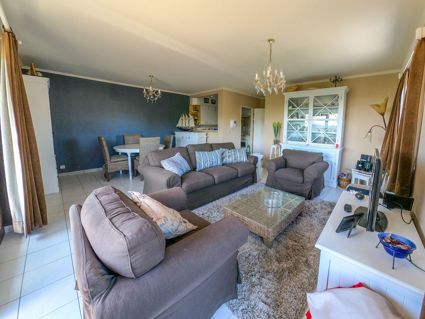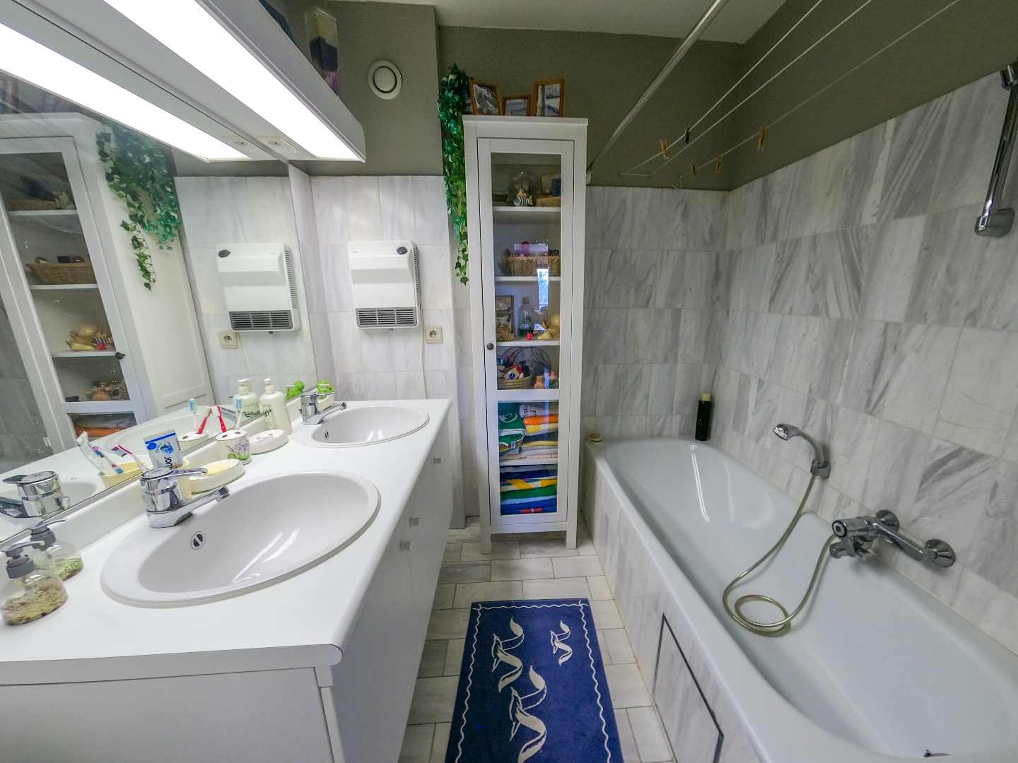 Living (30 m²) + videofoon,- hoek-terrassen (16 m²) + alu-balustrade + gefumeerd glas,- half-open keuken (2,40 x 1,80) met L-vormige keukenblok + ingebouwde inox afwasbak, frigo, oven, elektrische kookplaat, en dampkap (marmeren faience),- inkomhal,- berging + elektrische boiler en aansluiting wasautomaat,- toilet (marmeren faience),- badkamer met ligbad en toiletmeubel + 2 ingebouwde lavabo’s (marmeren faience),- en 2 slaapkamers (elk 3,60 x 3) met TV-aansluiting.