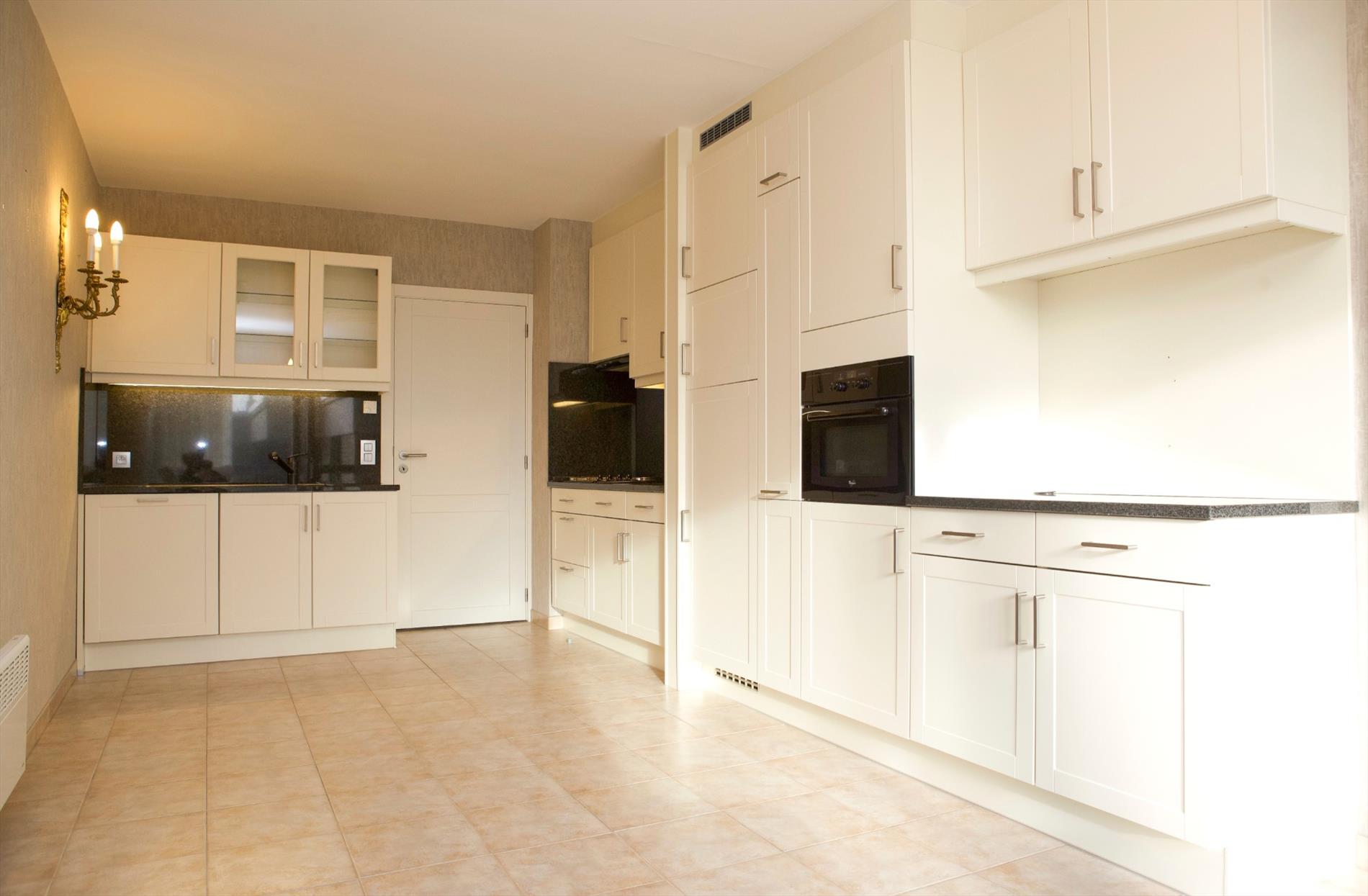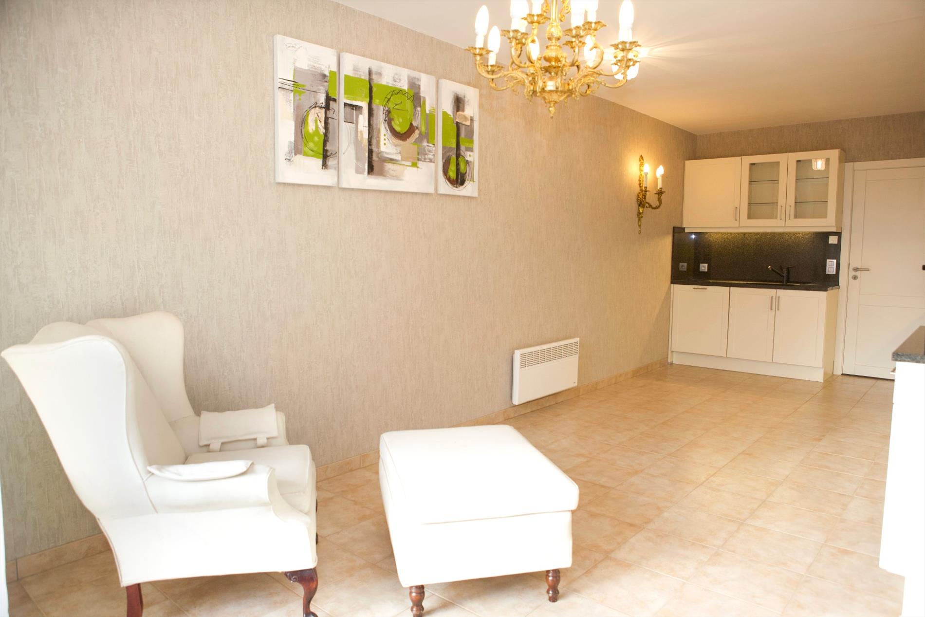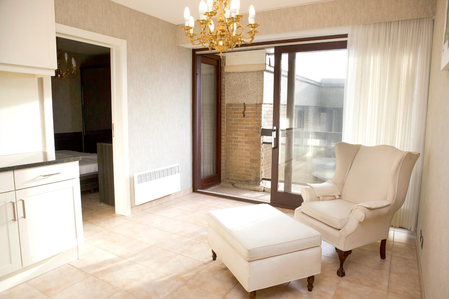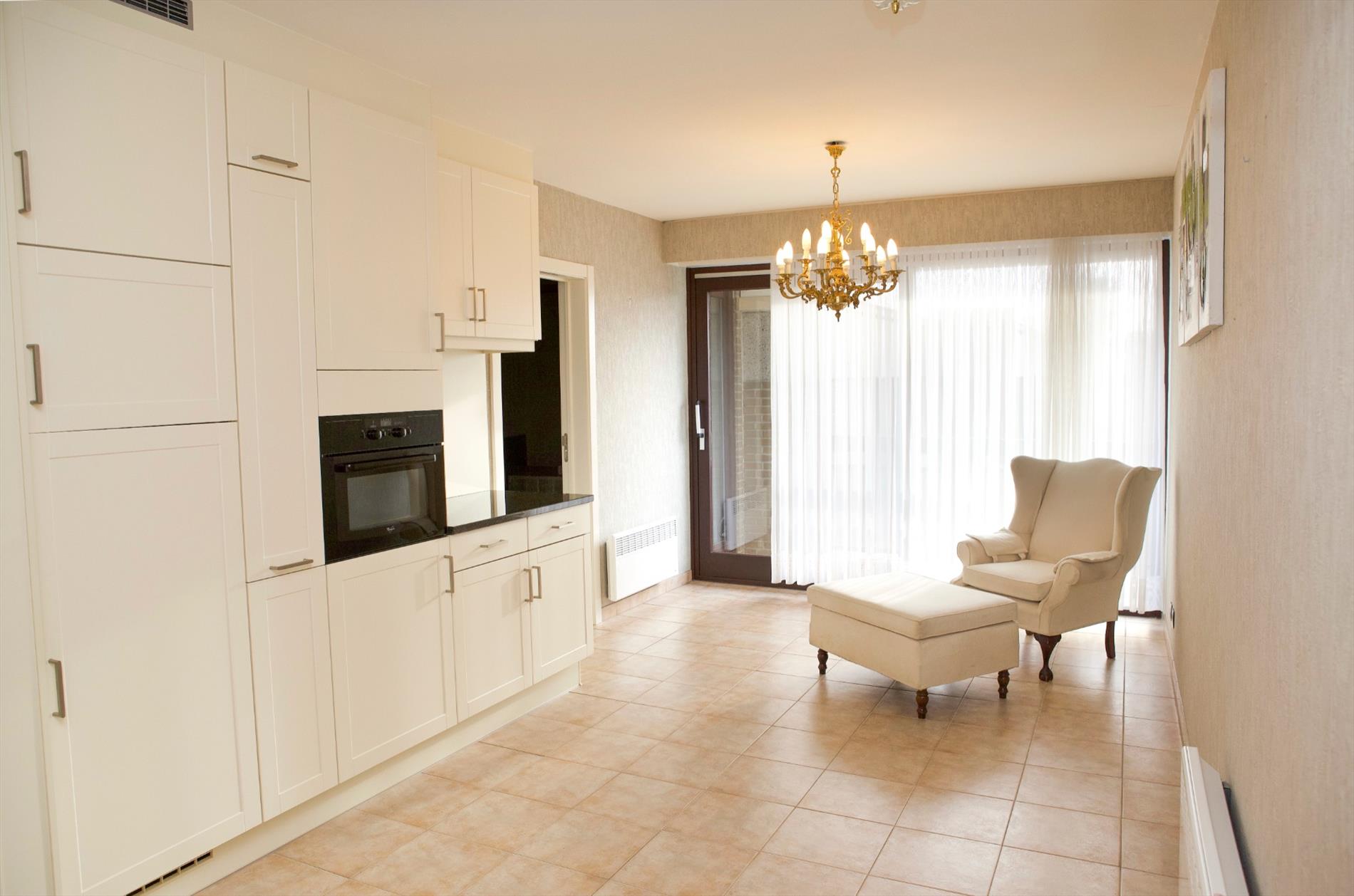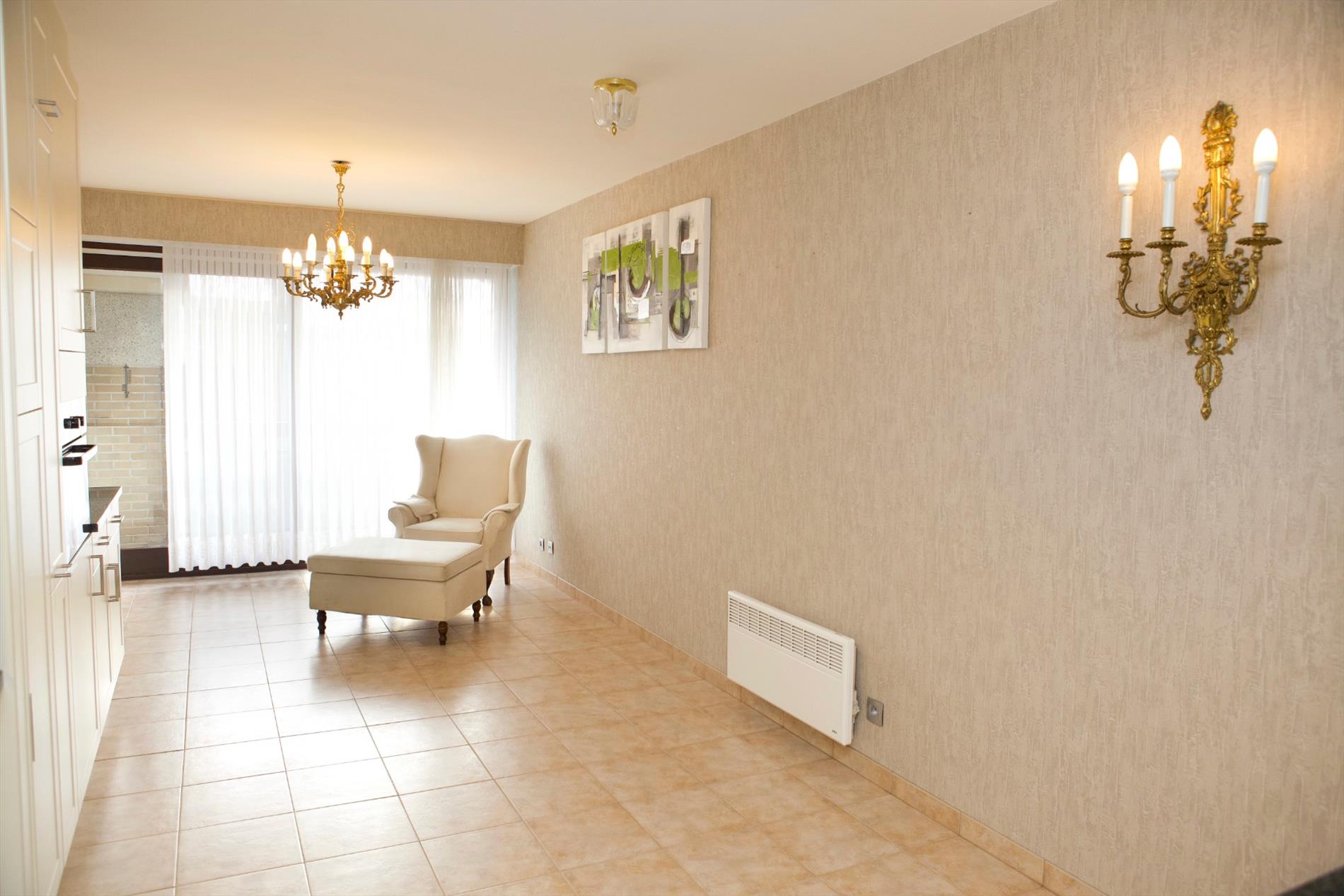 inkomhal met nieuwe ingemaakte vestiairekasten (+ zekeringkast & elektrische boiler),- zonnige woonkamer (7,10 x 3,10) uitgevend op de binnenkoer, met parlofoon, 2 elektrische convectoren, luster, plafonnier & wandarmatuur, én met open keuken + ingebouwde afwasautomaat, frigo, diepvriezer, dubbele inox afwasbak, elektrische kookplaat, dampkap, en oven,- zonneterras (3,19 x 0,90) in silexsteen + metalen balustrade + glaswerk,- en ruime slaapkamer (4 x 3,06) met dubbel bed, kleerkast + spiegel-schuifdeuren, commodekast + spiegel, mooie luster, en elektrische convector,- en vernieuwde badkamer met in-loop-douche, lavabo, ligbad, hang-w.c., spiegelkast, linnenkast, en elektrische straalradiator (sierlijke faience) ;