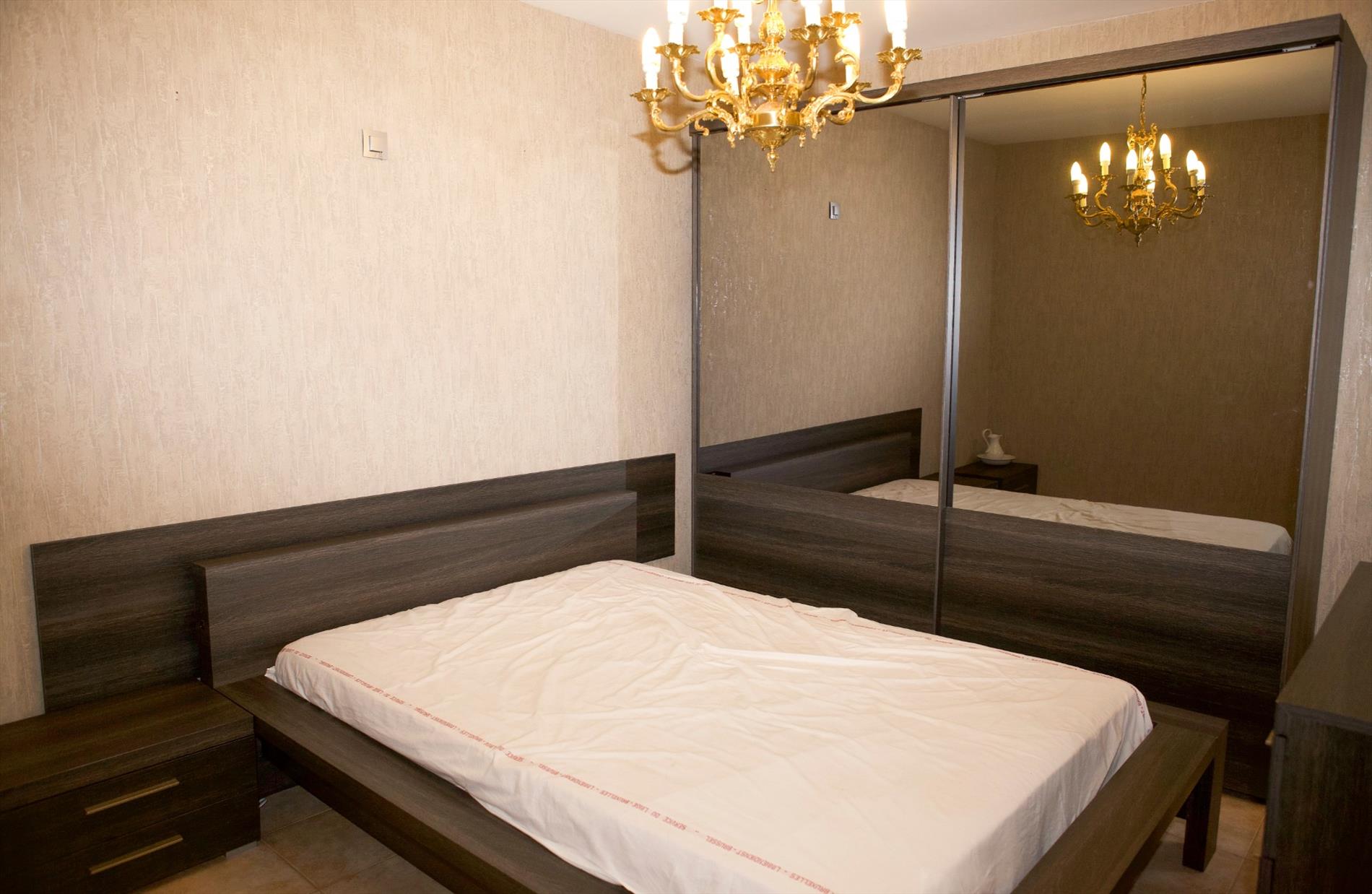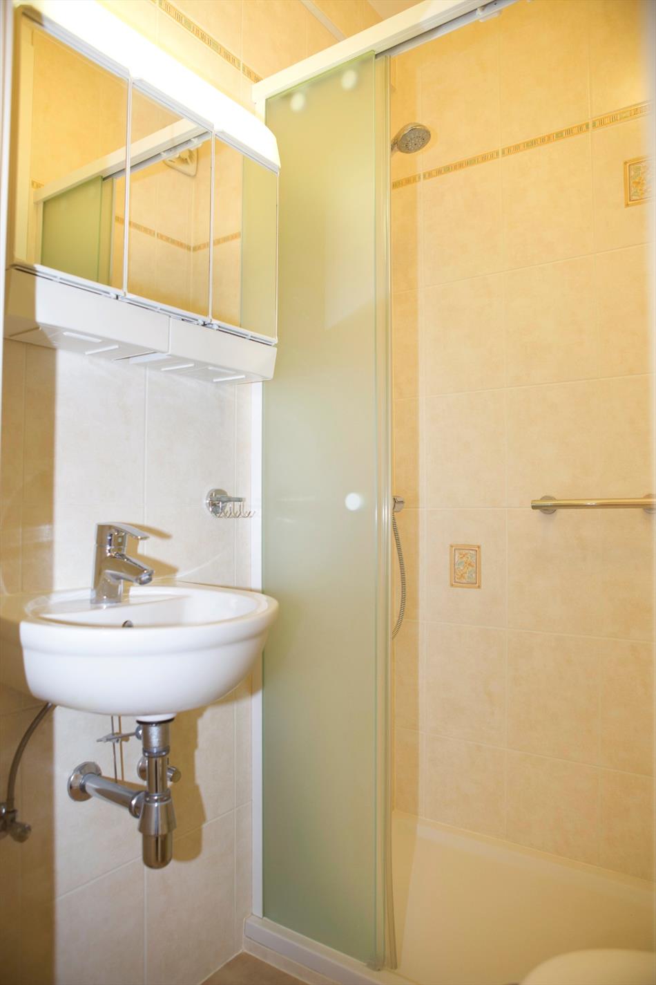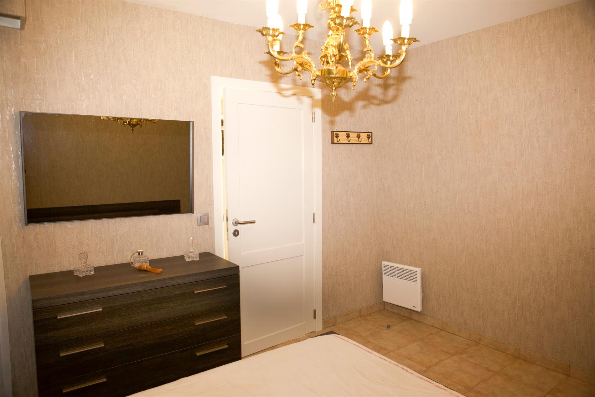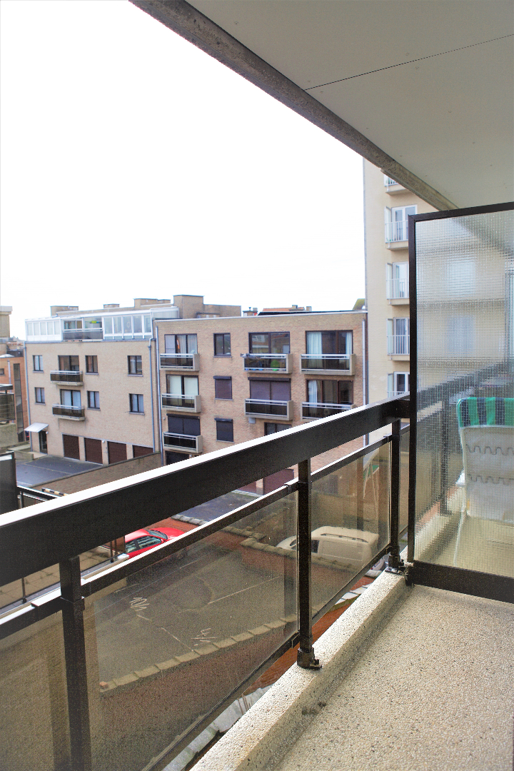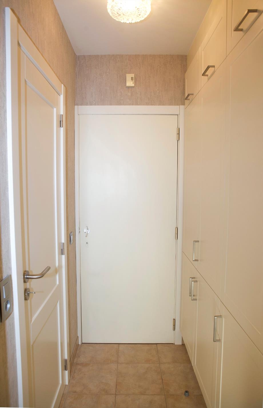 inkomhal met nieuwe ingemaakte vestiairekasten (+ zekeringkast & elektrische boiler),- zonnige woonkamer (7,10 x 3,10) uitgevend op de binnenkoer, met parlofoon, 2 elektrische convectoren, luster, plafonnier & wandarmatuur, én met open keuken + ingebouwde afwasautomaat, frigo, diepvriezer, dubbele inox afwasbak, elektrische kookplaat, dampkap, en oven,- zonneterras (3,19 x 0,90) in silexsteen + metalen balustrade + glaswerk,- en ruime slaapkamer (4 x 3,06) met dubbel bed, kleerkast + spiegel-schuifdeuren, commodekast + spiegel, mooie luster, en elektrische convector,- en vernieuwde badkamer met in-loop-douche, lavabo, ligbad, hang-w.c., spiegelkast, linnenkast, en elektrische straalradiator (sierlijke faience) ;