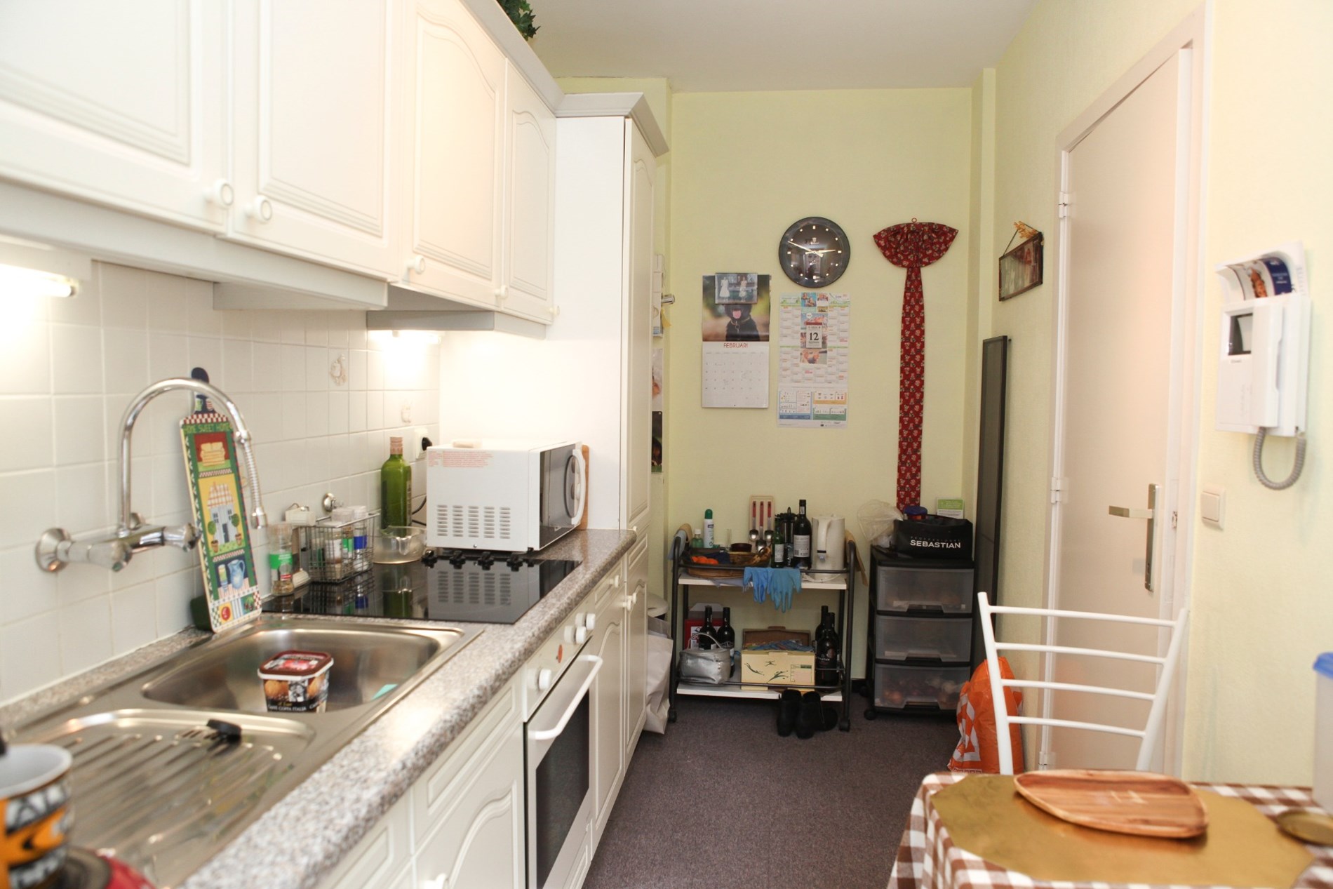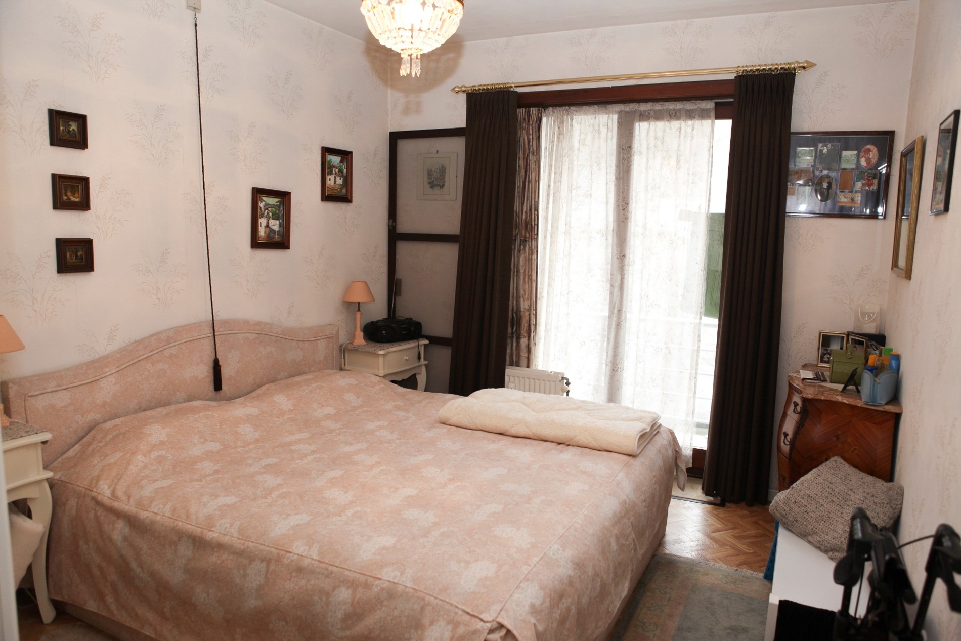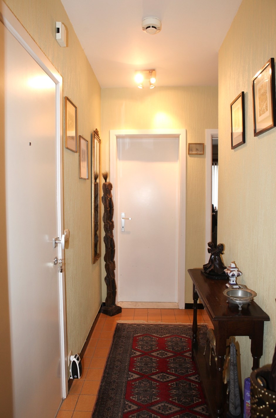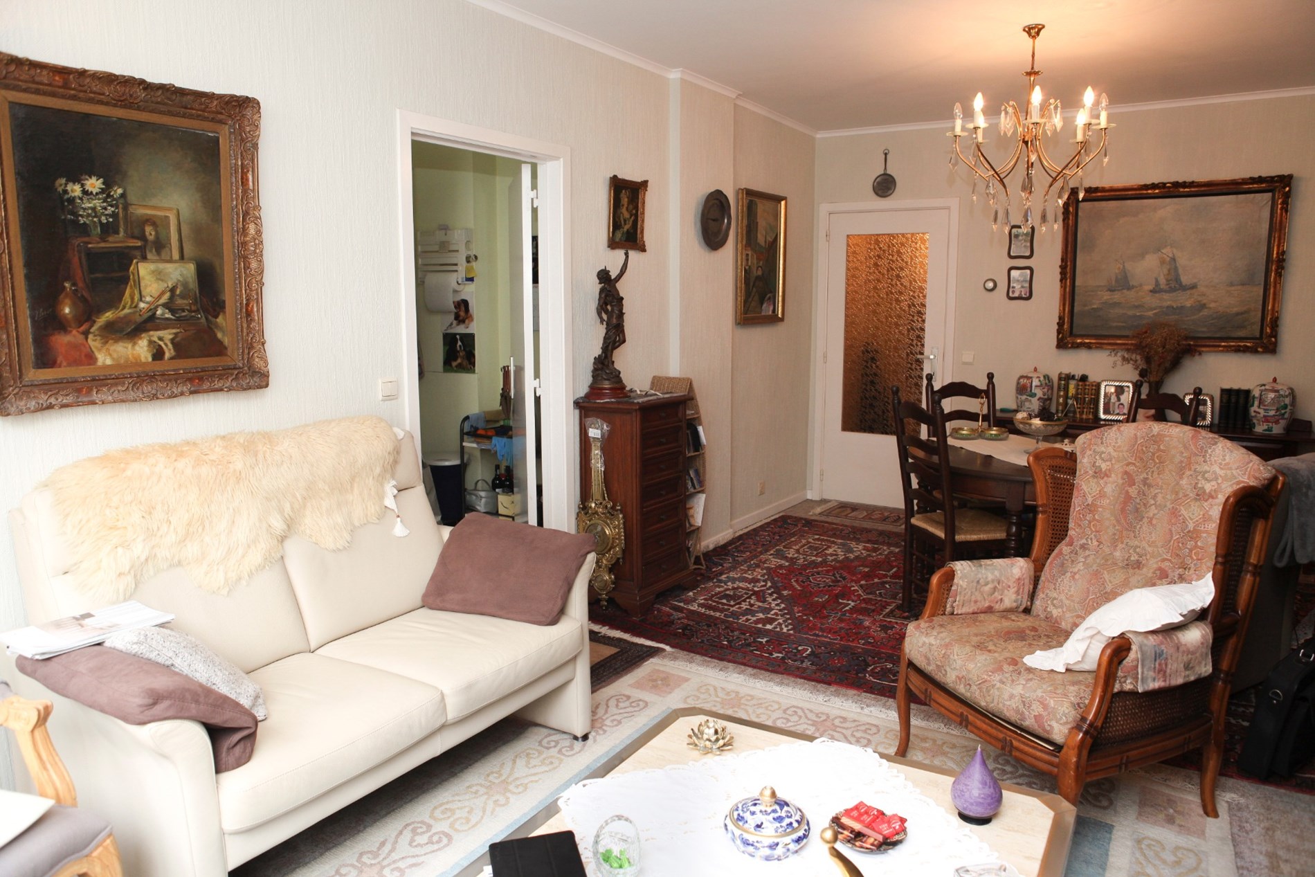 Inkomhal,- woonkamer + loggia (6,80 x 3,46),- keuken (4,35 x 1,90) met videofoon, en sierlijke keukenblok met onder- en bovenkasten (in witte meubelplaat) + ingebouwde keramische kookplaat, dampkap, oven, frigo, en inox-afwasbak (witte faience),- badkamer met ligbad en toiletmeubel + ingebouwde lavabo,- toilet met w.c.,- slaapkamer (3,92 x 3,02) met terrasdeur,- logeerkamer (3,90 x 2,35),- vernieuwde zonneterras (3,22 x 1,02) met nis voor kuisgerief (aluminium ballustrade + plankenvloer in hardhout)- en kelderberging nr. 2 ;