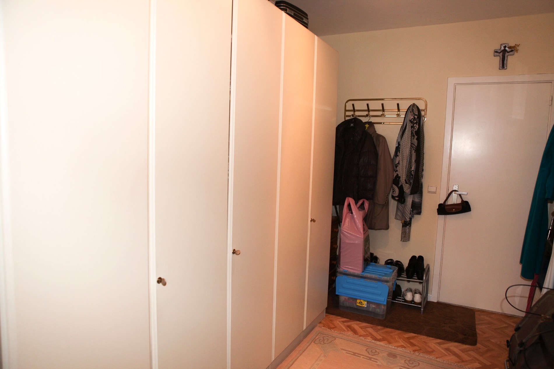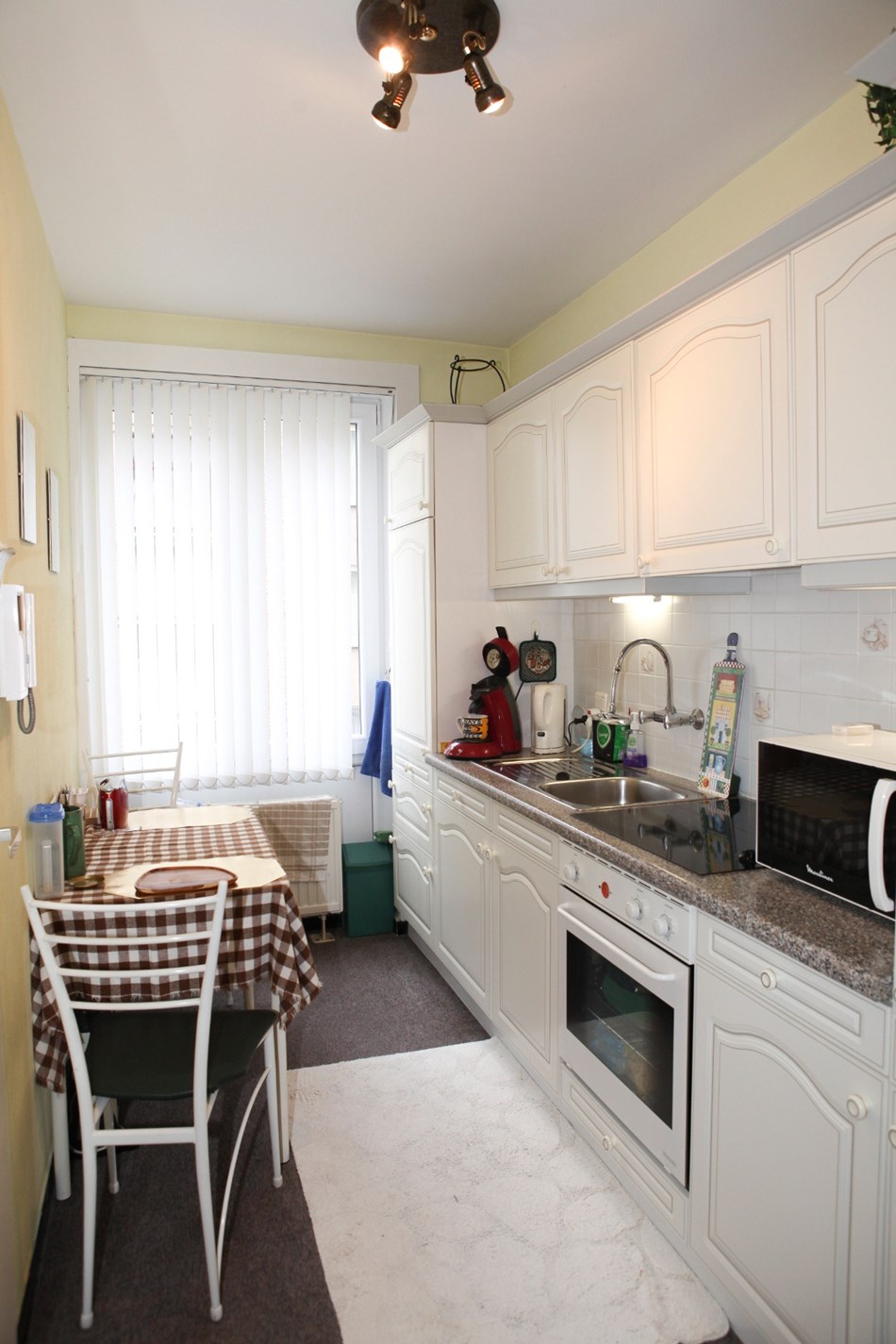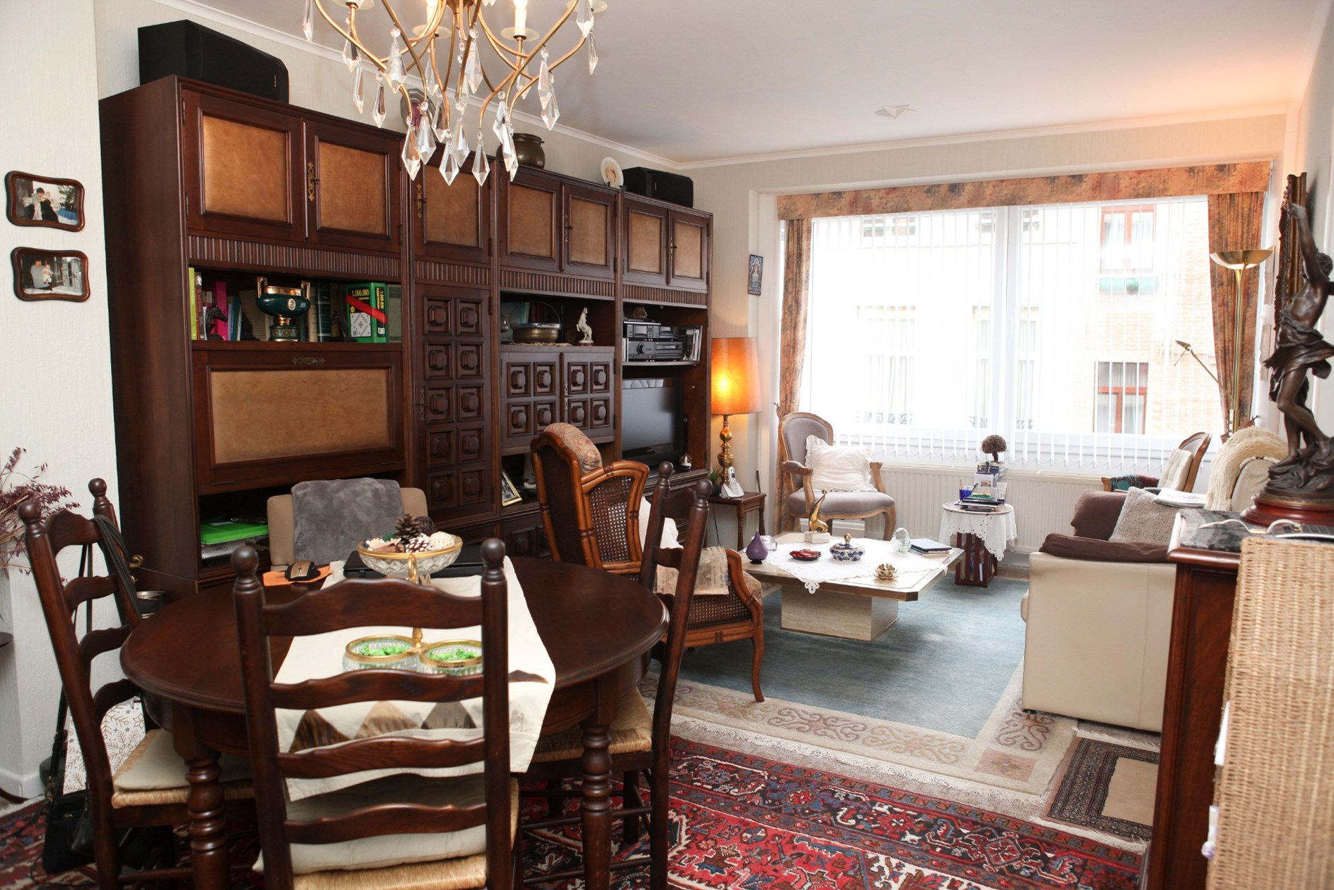 Inkomhal,- woonkamer + loggia (6,80 x 3,46),- keuken (4,35 x 1,90) met videofoon, en sierlijke keukenblok met onder- en bovenkasten (in witte meubelplaat) + ingebouwde keramische kookplaat, dampkap, oven, frigo, en inox-afwasbak (witte faience),- badkamer met ligbad en toiletmeubel + ingebouwde lavabo,- toilet met w.c.,- slaapkamer (3,92 x 3,02) met terrasdeur,- logeerkamer (3,90 x 2,35),- vernieuwde zonneterras (3,22 x 1,02) met nis voor kuisgerief (aluminium ballustrade + plankenvloer in hardhout)- en kelderberging nr. 2 ;
