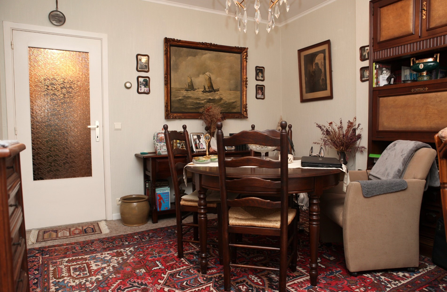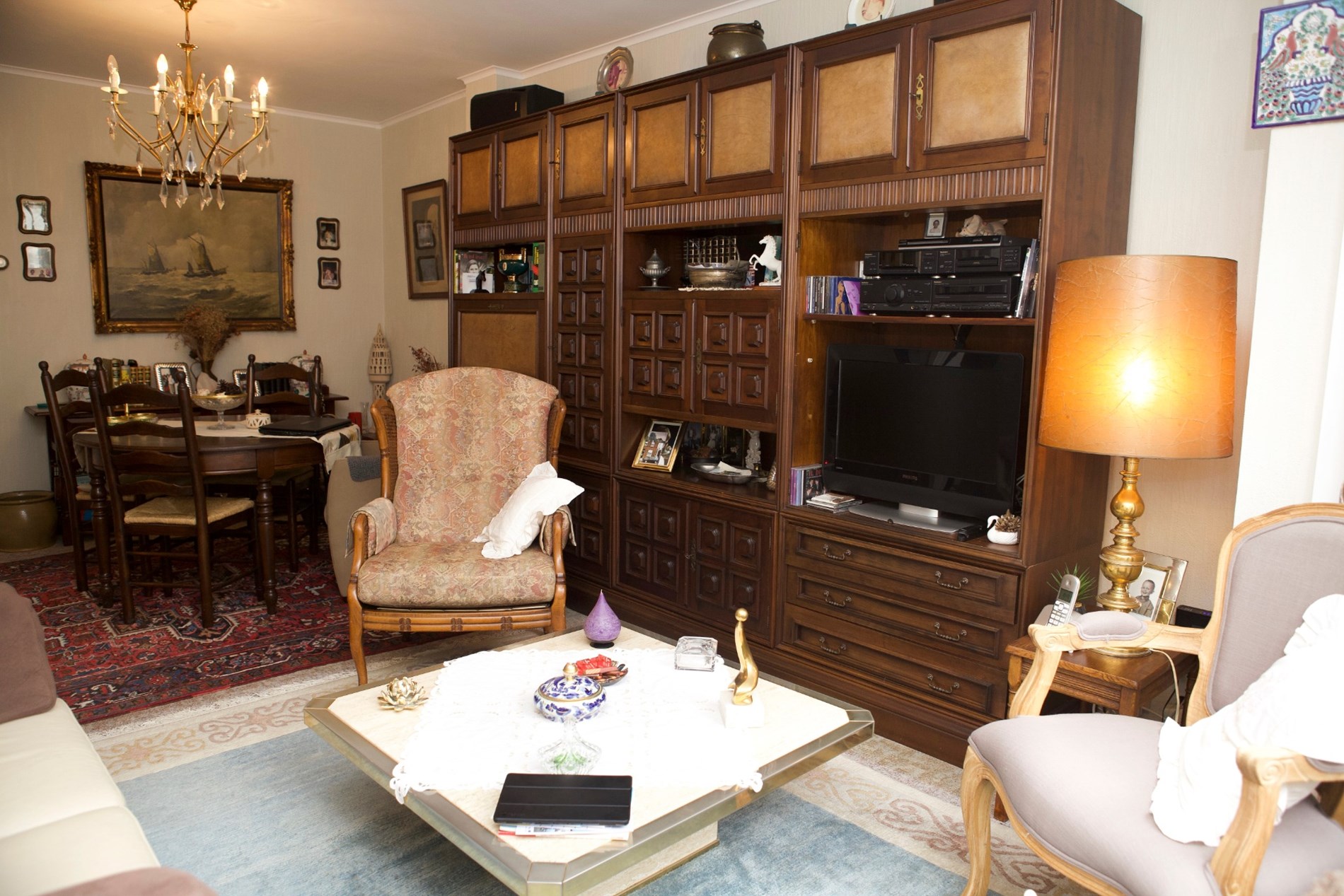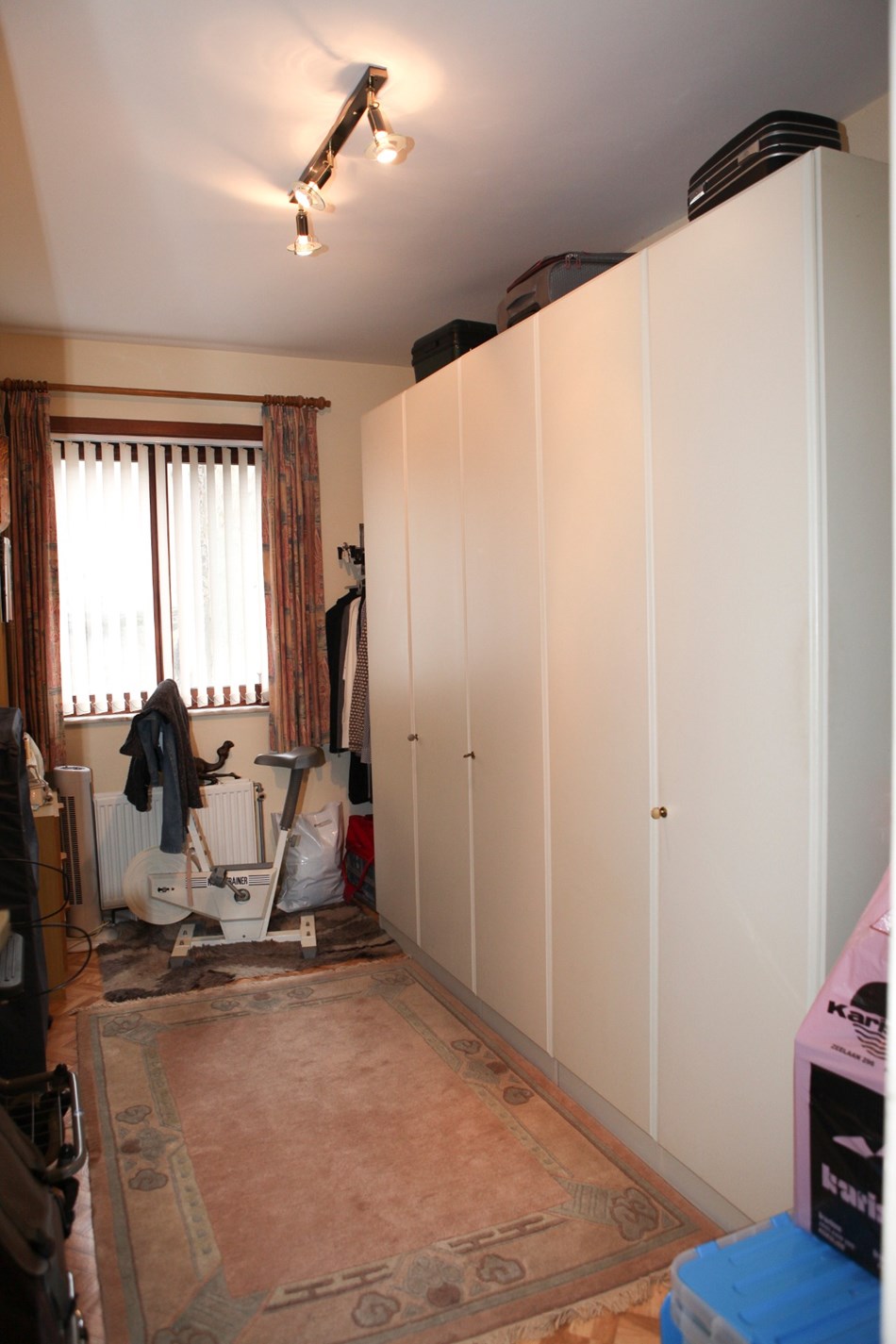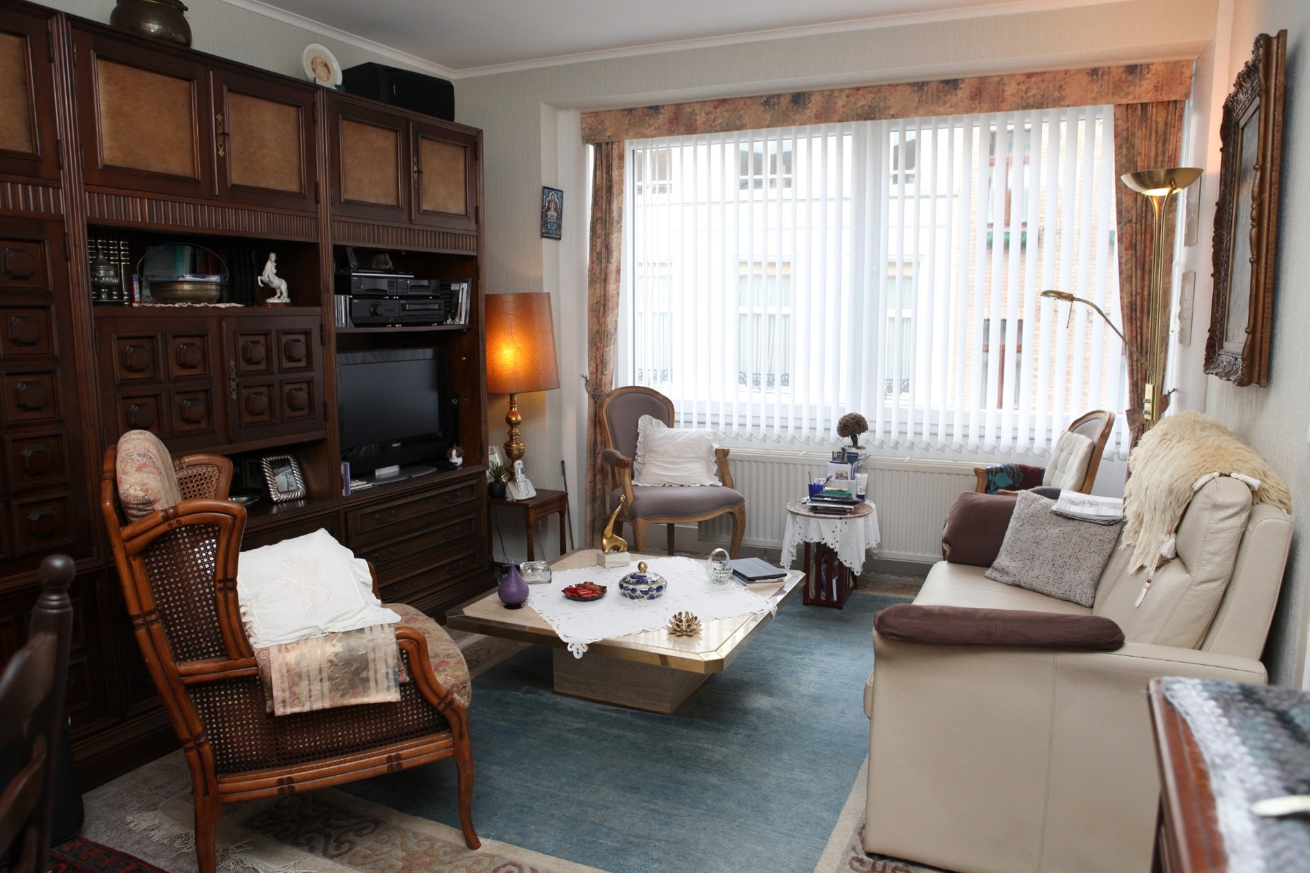 Inkomhal,- woonkamer + loggia (6,80 x 3,46),- keuken (4,35 x 1,90) met videofoon, en sierlijke keukenblok met onder- en bovenkasten (in witte meubelplaat) + ingebouwde keramische kookplaat, dampkap, oven, frigo, en inox-afwasbak (witte faience),- badkamer met ligbad en toiletmeubel + ingebouwde lavabo,- toilet met w.c.,- slaapkamer (3,92 x 3,02) met terrasdeur,- logeerkamer (3,90 x 2,35),- vernieuwde zonneterras (3,22 x 1,02) met nis voor kuisgerief (aluminium ballustrade + plankenvloer in hardhout)- en kelderberging nr. 2 ;