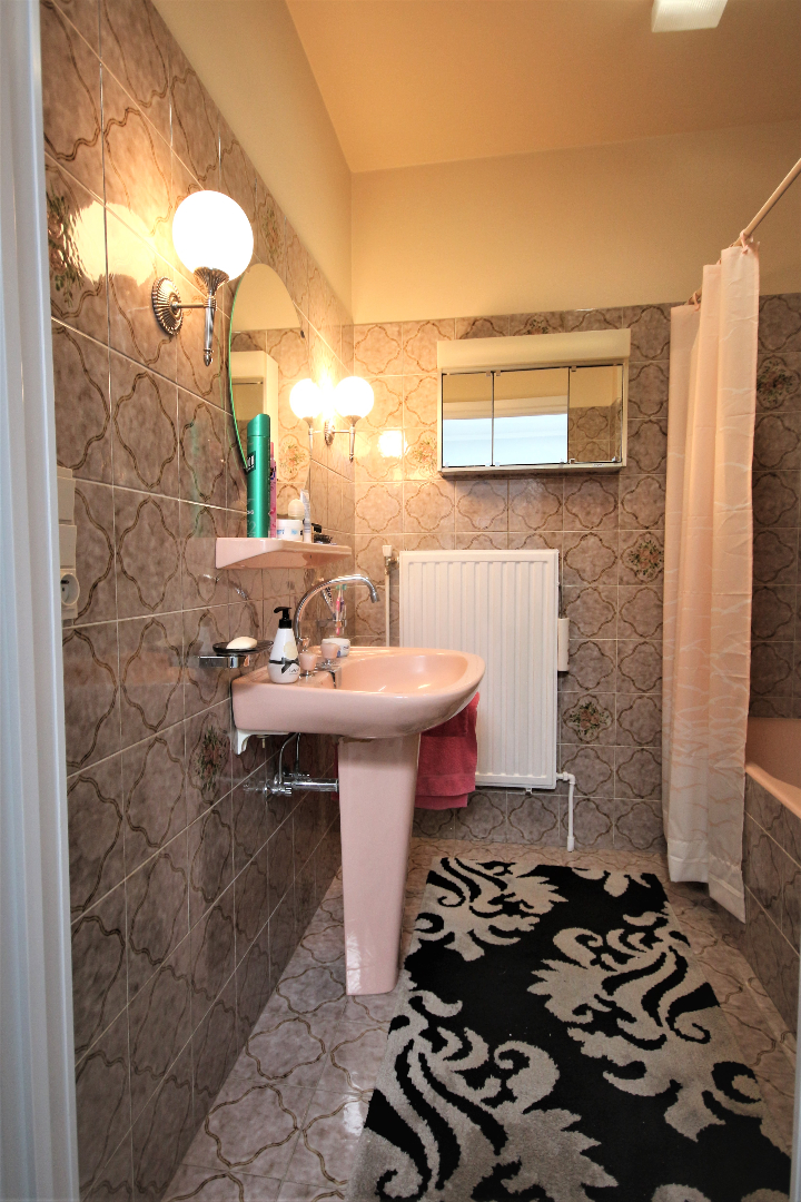 Inkomhal met voordeur, parlofoon, en ingemaakte vestiairekast (+ lichtkoepel),- berging met elektrische boiler & zekeringskast,- toilet met w.c. & lavabo (mooie faience & tegelvloer),- luchtige living + loggia (41 m²) + rustieke sierschouw (in Franse witsteen, getooid met eiken balk) & inbouw-pellethaard,- keuken (2,70 x 2,66) met L-vormige keukenblok (vol-eiken onder- & bovenkasten) + ingebouwde elektrische kookplaat, dampkap, 2 ronde inox afwasbakken, en frigo,- nachthal,- badkamer (2 x 1,90) met ligbad, en lavabo + zuil (mooie faience & tegelvloer),- slaapkamer (3 x 2,60),- masterbedroom (3,80 x 3) + terrasdeur,- zuid-west-gerichte L-vormig zonneterras (4,30 m²) + alu-balustrade ; * en in mede-eigendom en gedwongen onverdeeldheid: 370/1.000-sten van de gemene delen van het gebouw waaronder de grond.