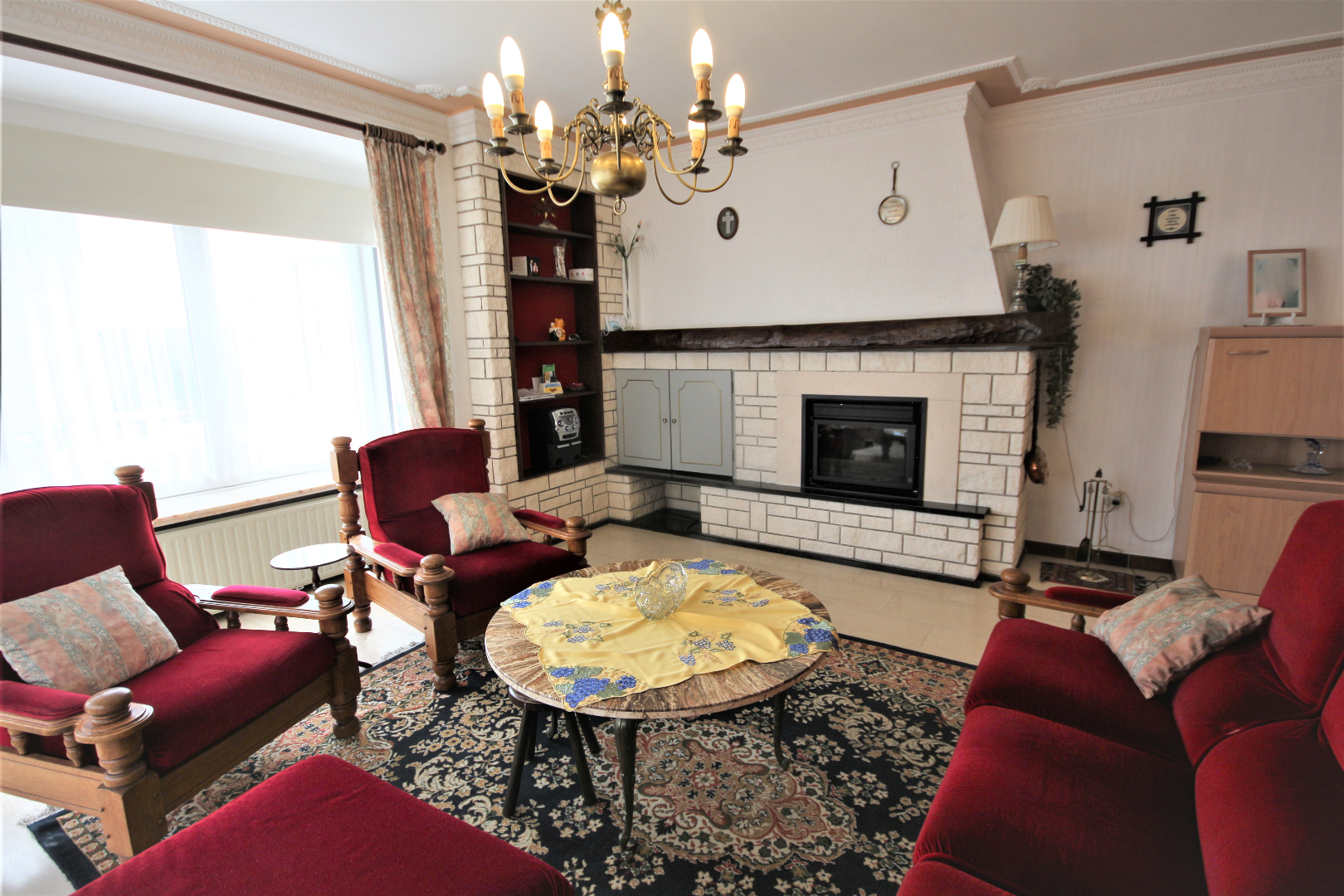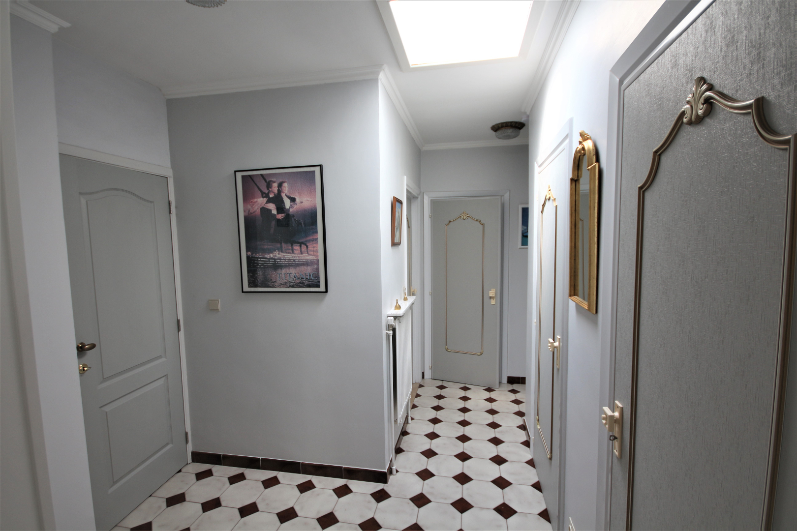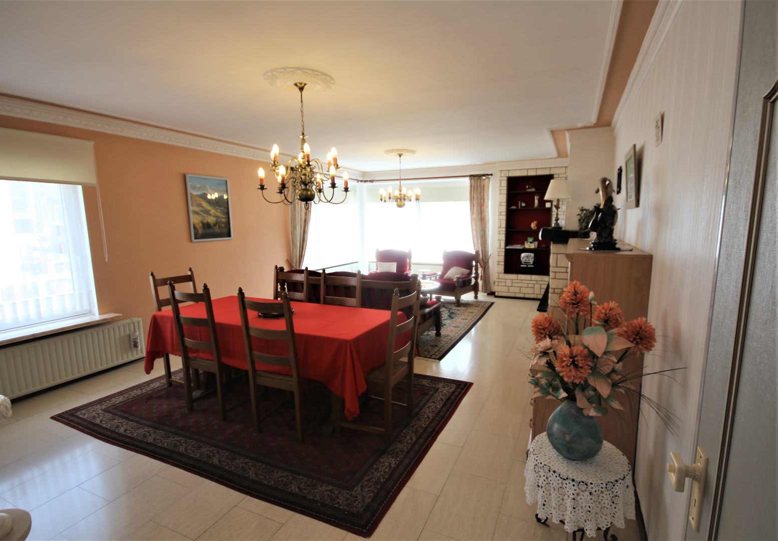 Inkomhal met voordeur, parlofoon, en ingemaakte vestiairekast (+ lichtkoepel),- berging met elektrische boiler & zekeringskast,- toilet met w.c. & lavabo (mooie faience & tegelvloer),- luchtige living + loggia (41 m²) + rustieke sierschouw (in Franse witsteen, getooid met eiken balk) & inbouw-pellethaard,- keuken (2,70 x 2,66) met L-vormige keukenblok (vol-eiken onder- & bovenkasten) + ingebouwde elektrische kookplaat, dampkap, 2 ronde inox afwasbakken, en frigo,- nachthal,- badkamer (2 x 1,90) met ligbad, en lavabo + zuil (mooie faience & tegelvloer),- slaapkamer (3 x 2,60),- masterbedroom (3,80 x 3) + terrasdeur,- zuid-west-gerichte L-vormig zonneterras (4,30 m²) + alu-balustrade,- en garage nr. 2 (6,05 x 2,70) met PVC-rolluik (met water & elektriciteit) ; * en in mede-eigendom en gedwongen onverdeeldheid: 400/1.000-sten van de gemene delen van het gebouw waaronder de grond.