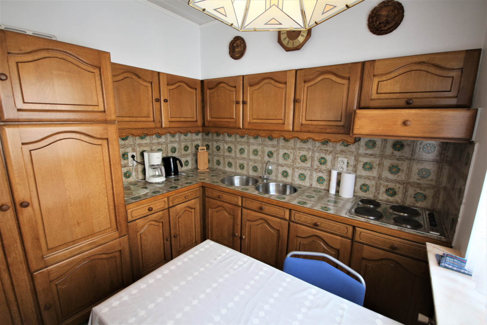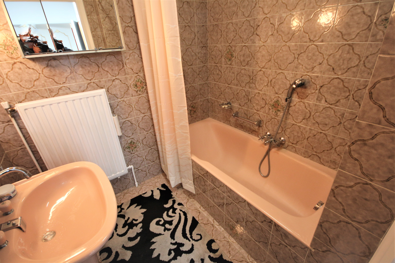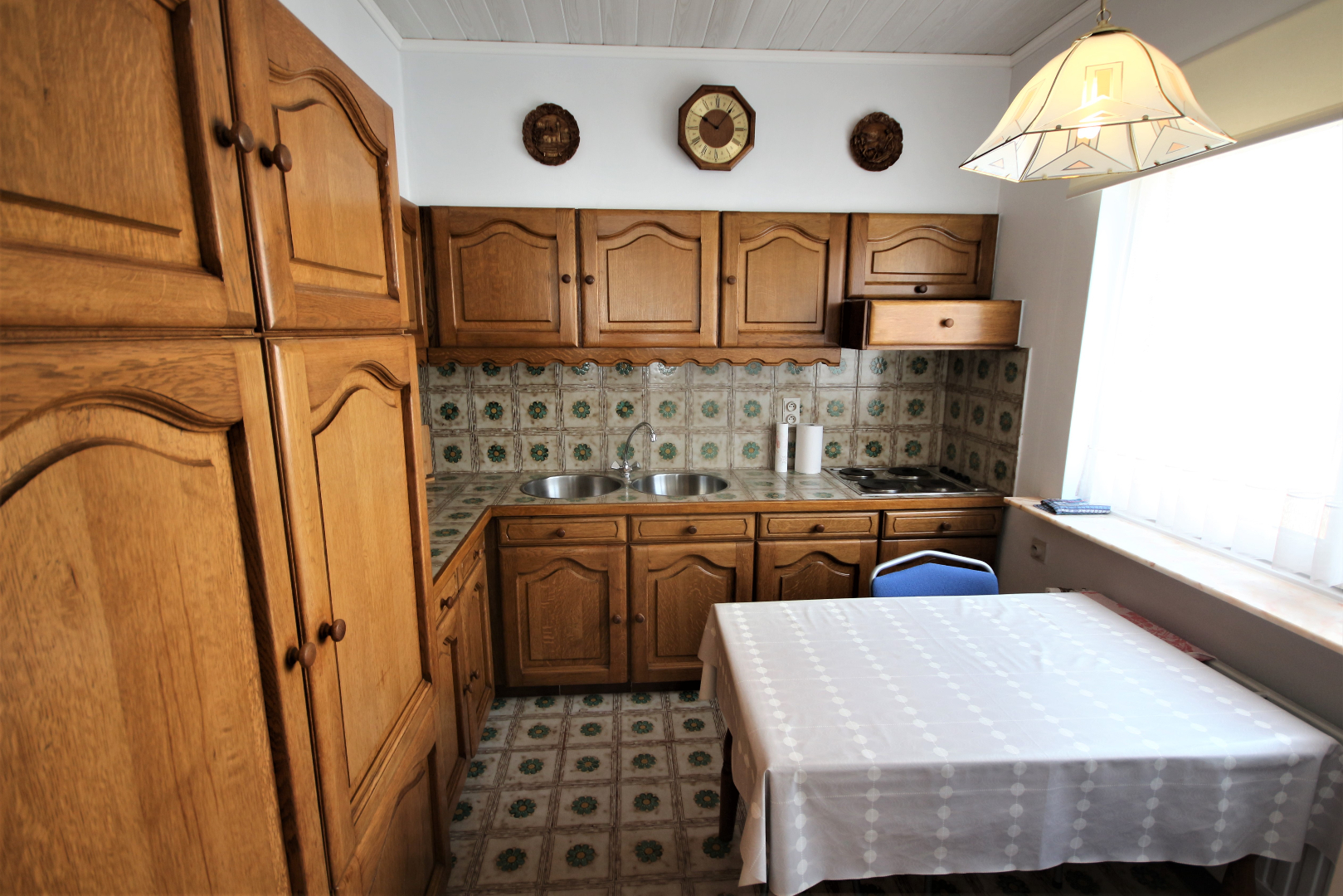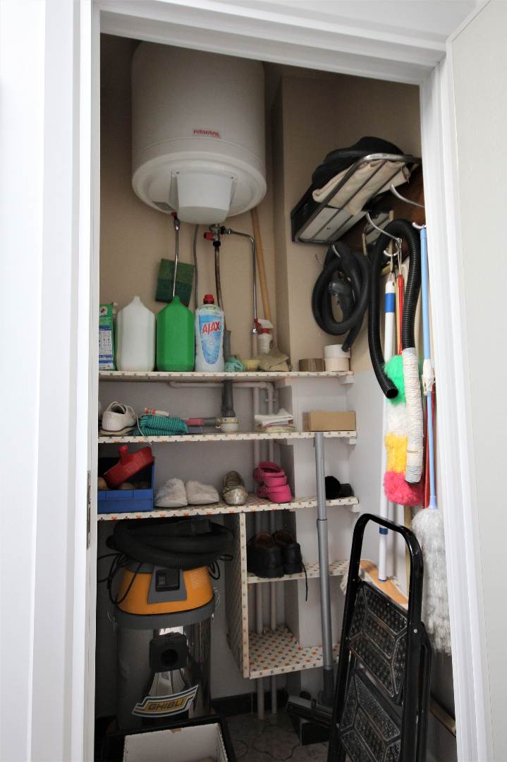 Inkomhal met voordeur, parlofoon, en ingemaakte vestiairekast (+ lichtkoepel),- berging met elektrische boiler & zekeringskast,- toilet met w.c. & lavabo (mooie faience & tegelvloer),- luchtige living + loggia (41 m²) + rustieke sierschouw (in Franse witsteen, getooid met eiken balk) & inbouw-pellethaard,- keuken (2,70 x 2,66) met L-vormige keukenblok (vol-eiken onder- & bovenkasten) + ingebouwde elektrische kookplaat, dampkap, 2 ronde inox afwasbakken, en frigo,- nachthal,- badkamer (2 x 1,90) met ligbad, en lavabo + zuil (mooie faience & tegelvloer),- slaapkamer (3 x 2,60),- masterbedroom (3,80 x 3) + terrasdeur,- zuid-west-gerichte L-vormig zonneterras (4,30 m²) + alu-balustrade,- en garage nr. 2 (6,05 x 2,70) met PVC-rolluik (met water & elektriciteit) ; * en in mede-eigendom en gedwongen onverdeeldheid: 400/1.000-sten van de gemene delen van het gebouw waaronder de grond.