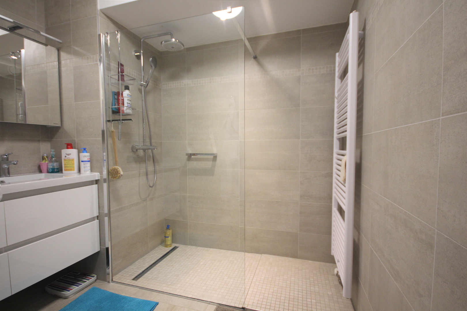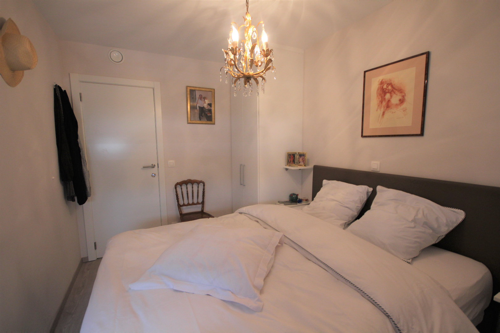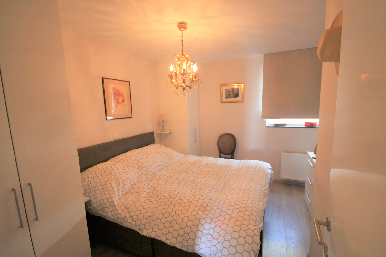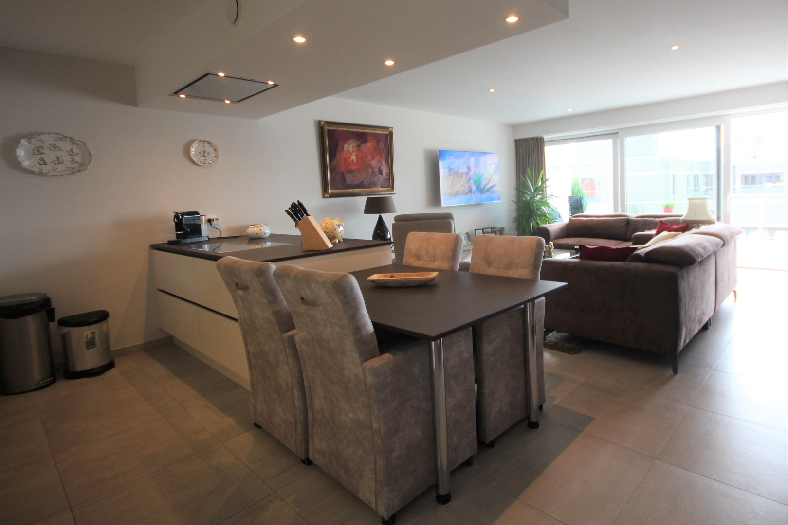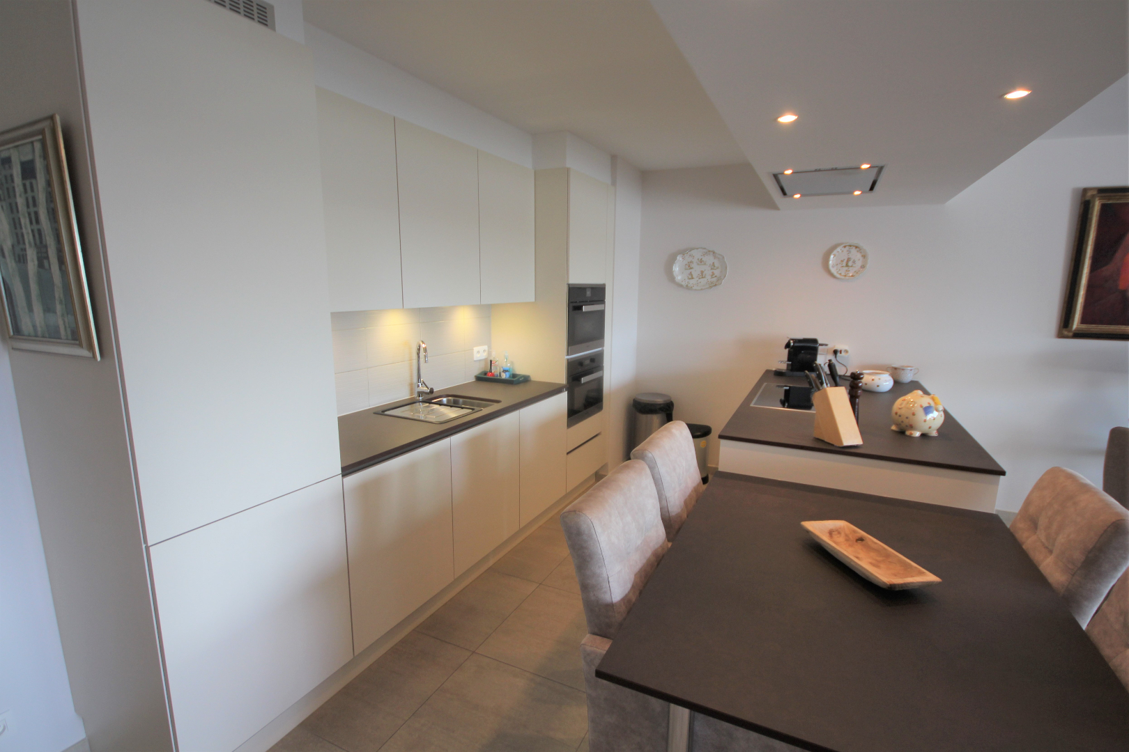 Omvattende: hal + vestiairekasten & veiligheidsdeur,- berging (2 x 1,25) met Vaillant-H.R.+ aardgas-wandgenerator, zekeringskast, verluchtingssysteem, en aansluiting was- & droogautomaat,- luchtige woonkamer (39 m²) met living + comfortabele keuken met keukenblok + ingebouwde frigo, diepvriezer, micro-combi-oven, stoomoven, vaatwasautomaat, en inox-afwasbak * + kookeiland met hemel + inbouwspotjes & dampkap, inductie-kookplaat, en aanbouwtafel + 4 fauteuils (werkbladen in natuursteen),- zonneterras (4,69 x 1,95),- toilet met hang-w.c. & lavabo,- badkamer met inloopdouche + glazen wand, handdoekradiator, toiletmeubel + 2 lavabo’s, en spiegelkast,- slaapkamer (10,24 m²) + 2 aanbouwkasten,- en 2de slaapkamer (9,90 m²) + inbouwkasten.
