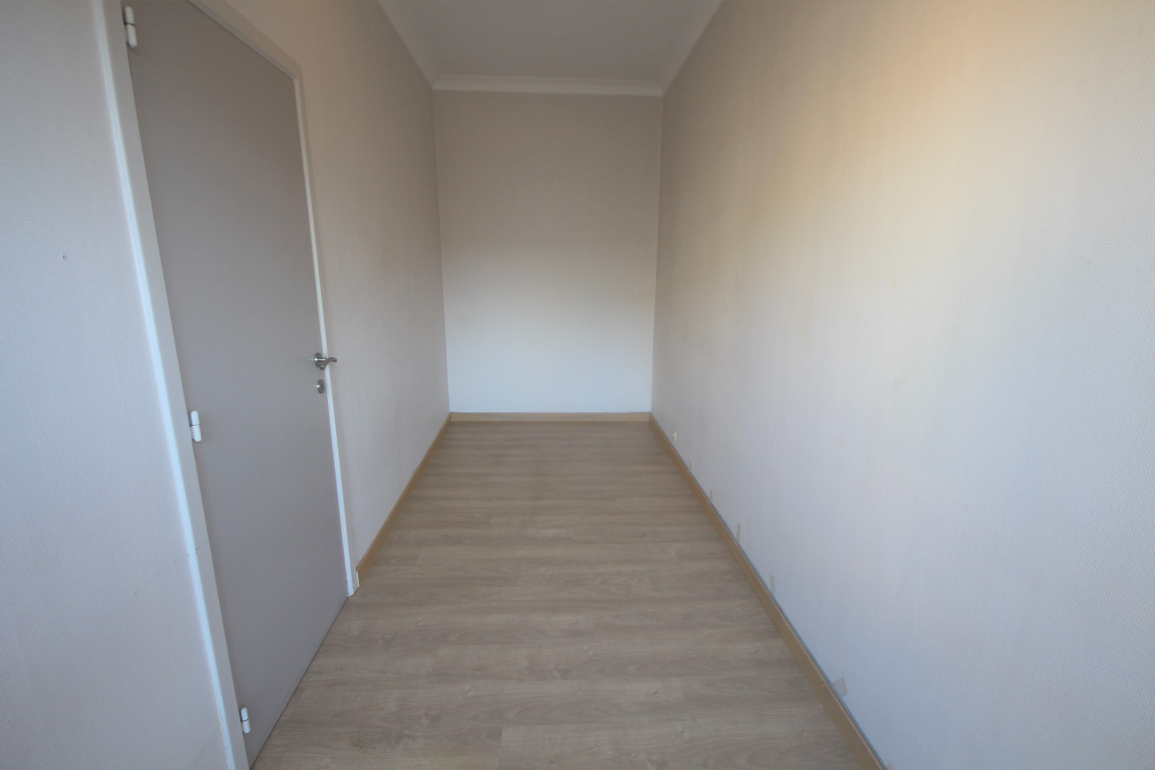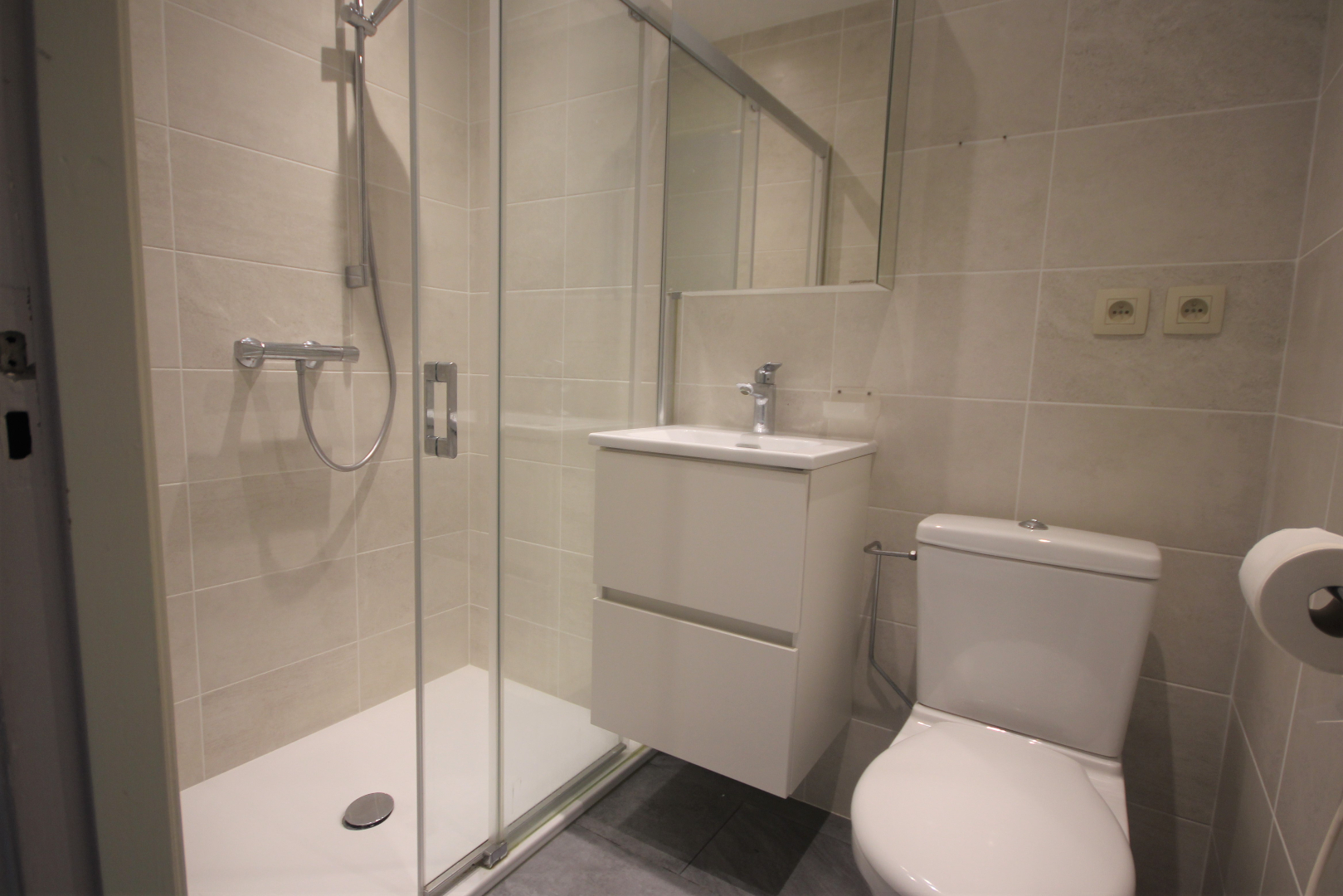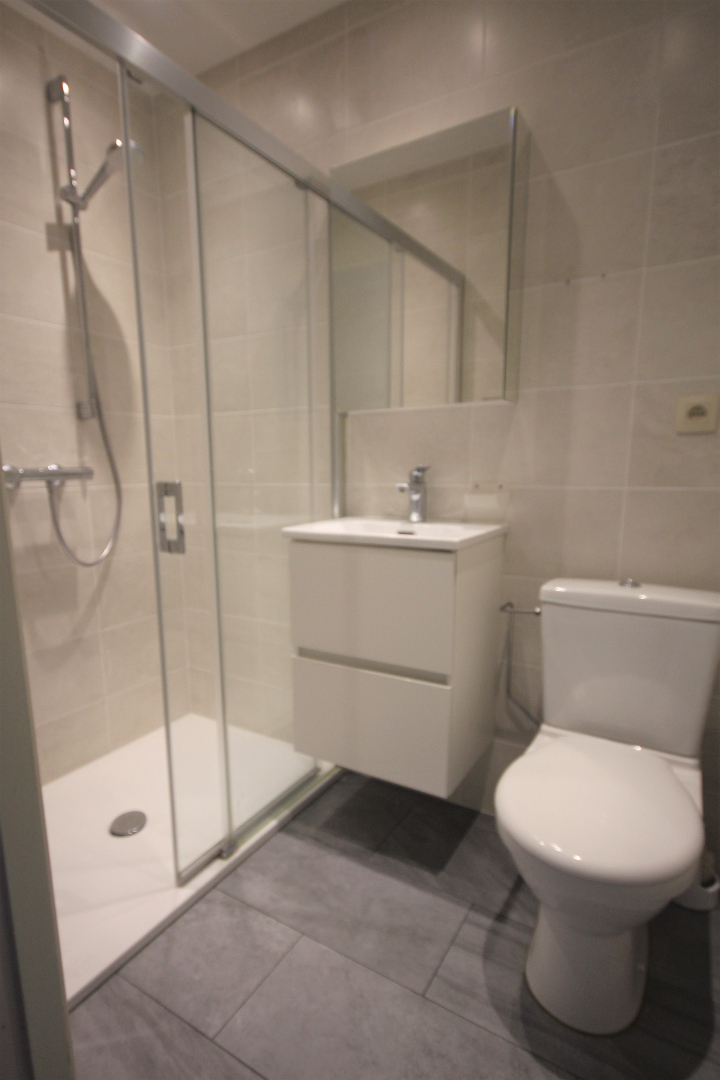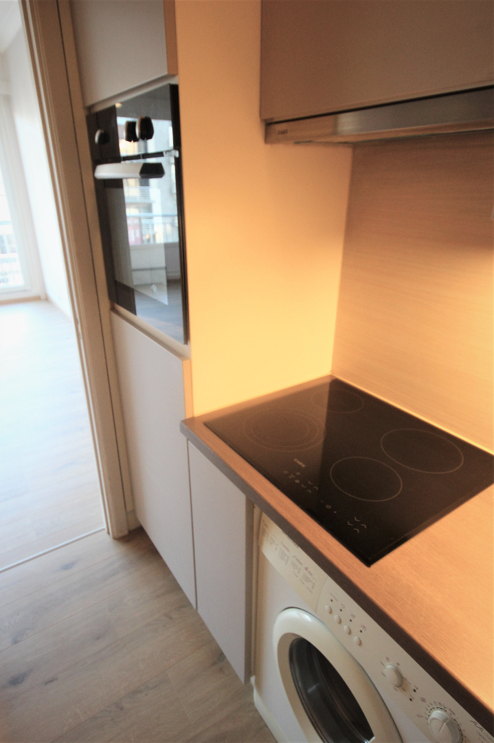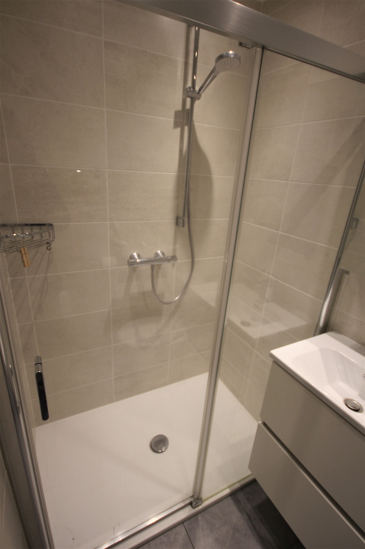 gepantserde inkomdeur + judasoog (tussen de trap hall en de private inkomsas),- inkomhall (4,01 x 0,96) + videofoon),- lichtrijke woonkamer (5,35 x 4) met toegang naar het terras),- keuken (2,39 x 1,40) met L-vormige keukenblok (onder- en bovenkasten in grijze meubelplaat) + ingebouwde dubbel inox-afwasbak, koelkast, keramische kookplaat, dampkap, oven en wasautomaat * elektrische boiler, en nis met legplanken + zekeringskast),- terras (5,04 x 1,03),- slaapkamer (5,27 x 1,75),- badkamer (1,97 x 1,30) met toiletmeubel + ingebouwde lavabo, w.c. en in-loop-douche (nieuwe keramische tegelvloer en faience),- en op de vierde verdieping de berging nummer 284 (1,34 x 1,27).