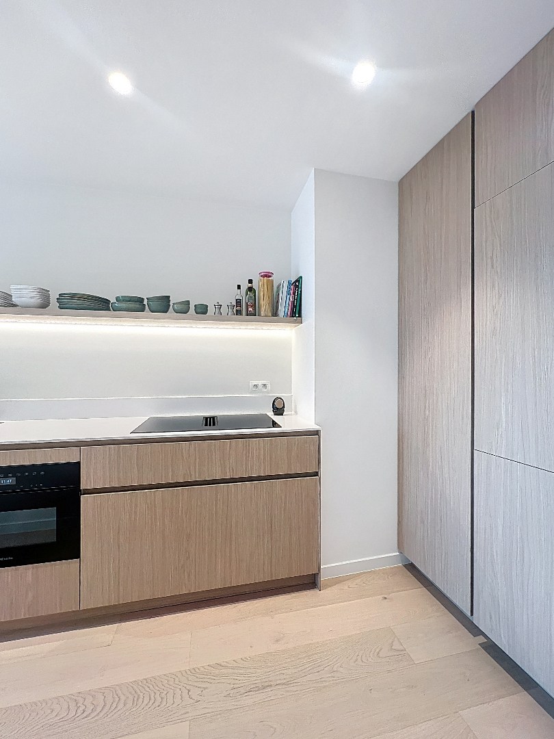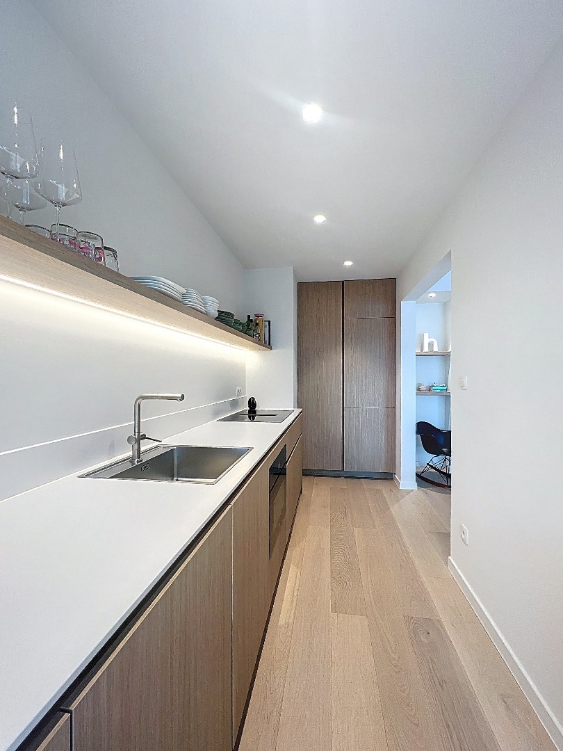 De indeling van het appartement is als volgt: ruime inkom voorzien van volledige wand met inmaakkasten - extra berging met plaats voor was en droogkast - ruime lichtrijke woonkamer met toegang naar een semi /halfopen keuken dewelke volledig is ingericht met Miele toestellen (vaatwasser - inductie - combi-oven; .. ), de keuken heeft aansluiting tot een aangenaam Z-W gericht terras vanwaar u een prachtig zicht geniet - apart toilet - badkamer met ruime inloopdouche - 1ste ruime slaapkamer met aansluiting naar terras ( °kasten op foto zijn niet voorzien, lichtpunten wel) - 2 slaapkamers volledig voorzien van maatwerk kasten en bureau, deze muur kan in de toekomst heel vlot worden weggehaald zodanig er tussen de kasten een full size bed kan worden voorzien. Wat mogelijkheden biedt in de toekomst;