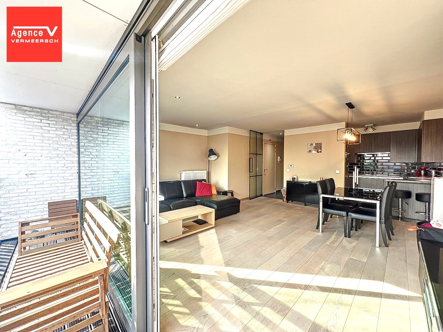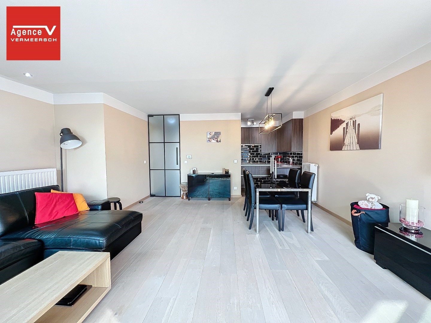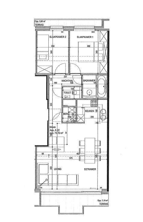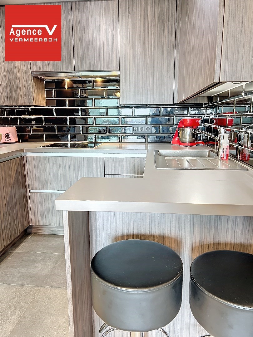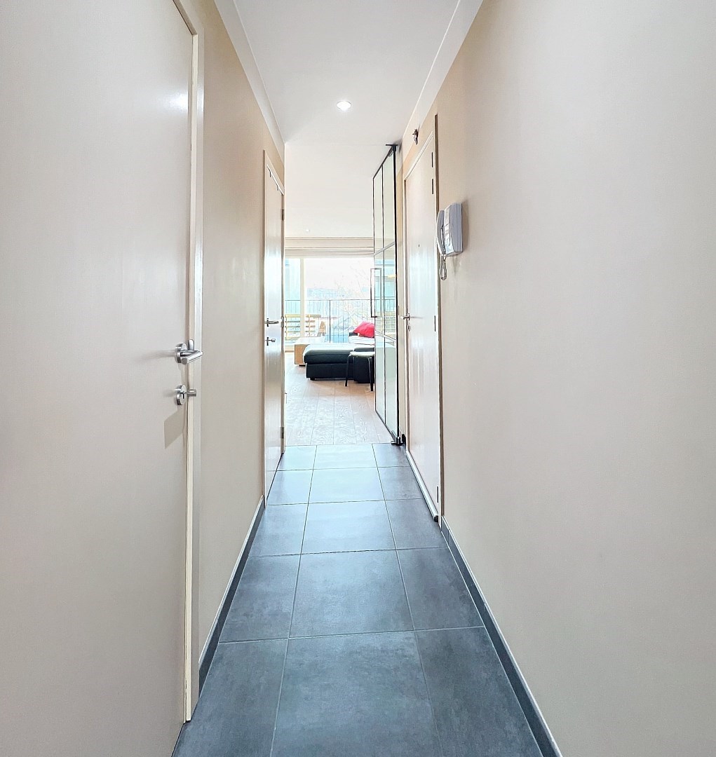 Het appartement is opgebouwd uit hoogwaardige materialen en is ingedeeld als volgt: inkomhal – lichtrijke eetkamer met aansluitend de zithoek met kamerbrede schuiframen vanwaar u toegang krijgt tot een aangenaam terras. Mooie hoogwaardige keuken met eetbar ontworpen door Diapal, de keuken is volledig ingericht met toestellen - vaatwas – combi-oven – frigo. Woonkamer is voorzien van massief parket.