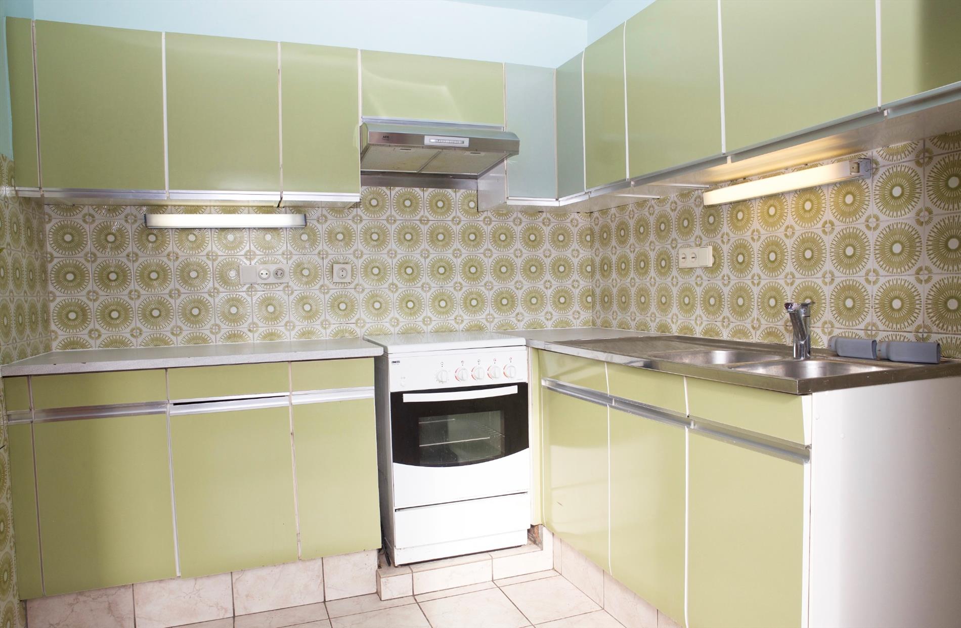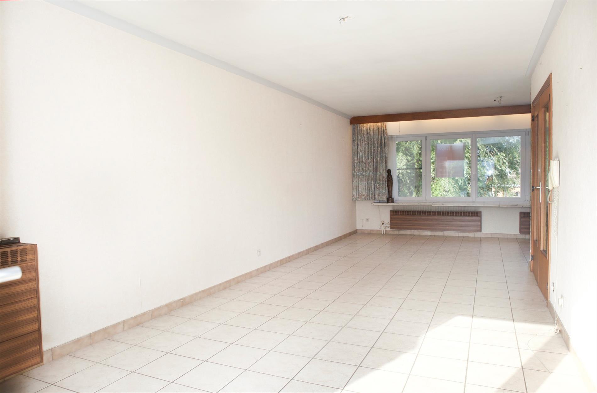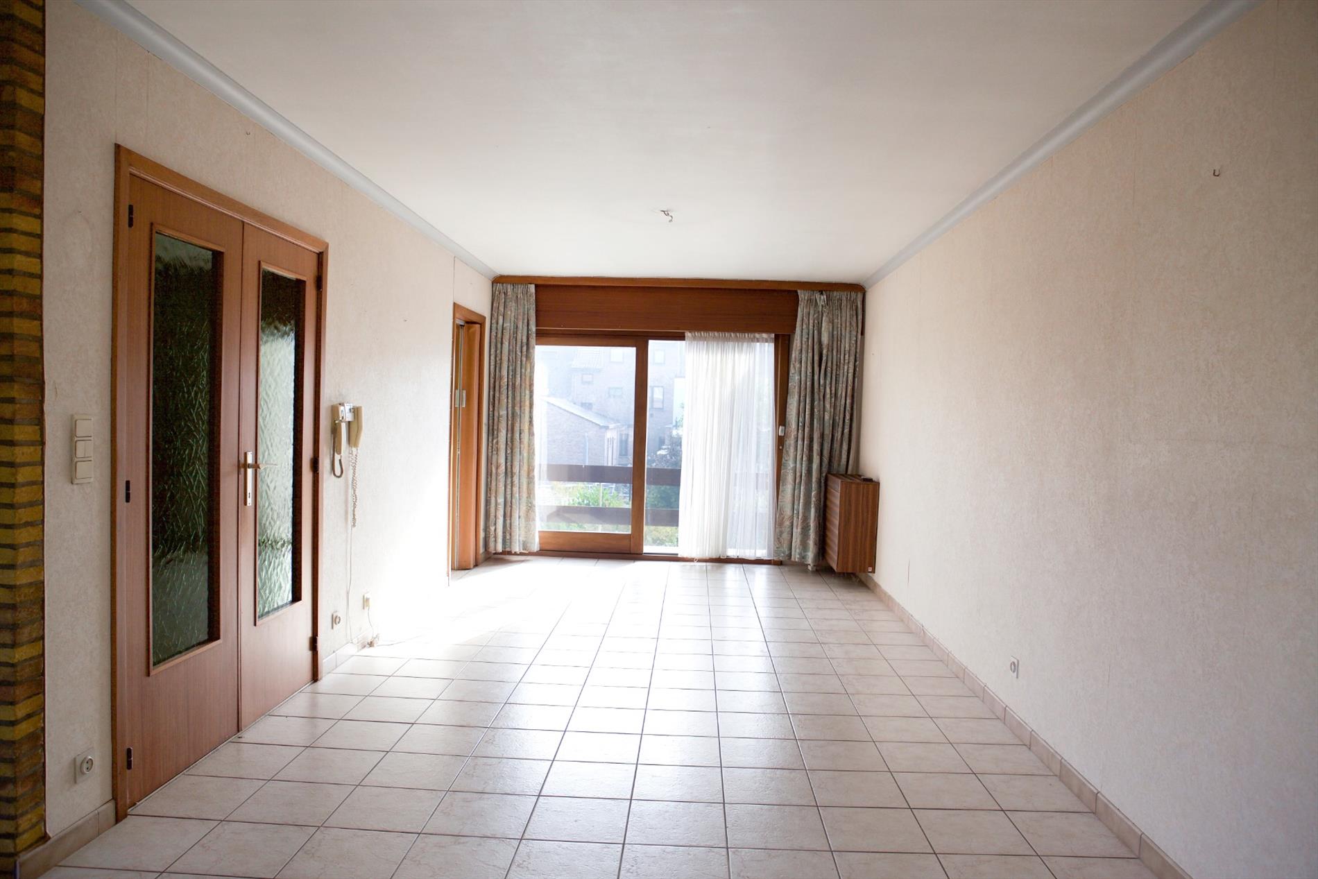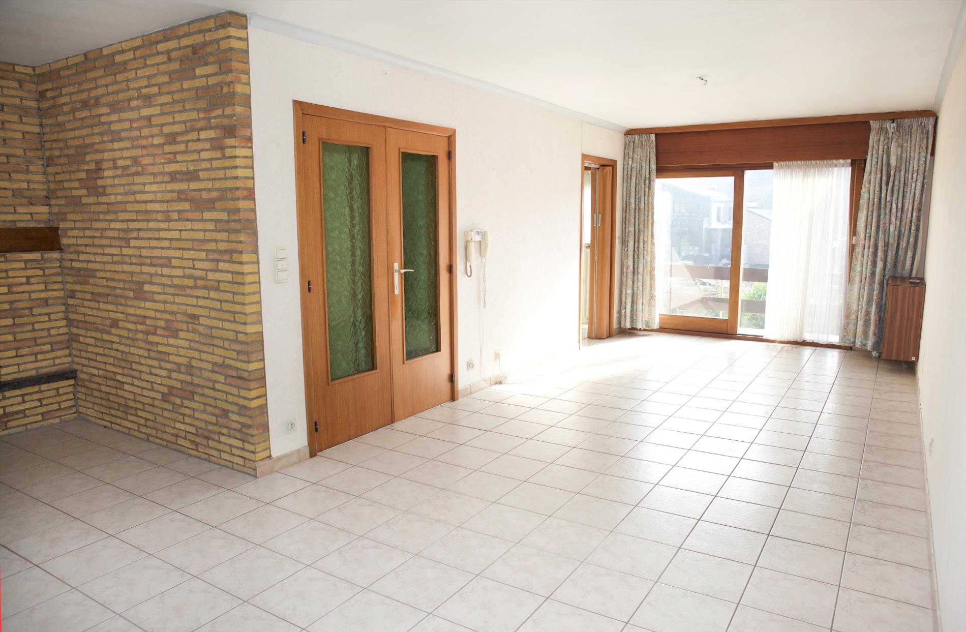 Eerste verdieping: overloop,- toilet met wc + lavabo,- L-vormige living (35 m²) met sierschouw-openhaard (in rustiek metselwerk), terrasschuifraam en parlofoon (geen vis-à-vis),- keuken (2,50 x 2,40) met L-vormige keukenblok + ingebouwde dubbele inox afwasbak, aardgas kookfornuis, en dampkap,- en vernieuwd terras (in granietsteendallen) + 2 bergkasten (aan de beide zijkanten) ;