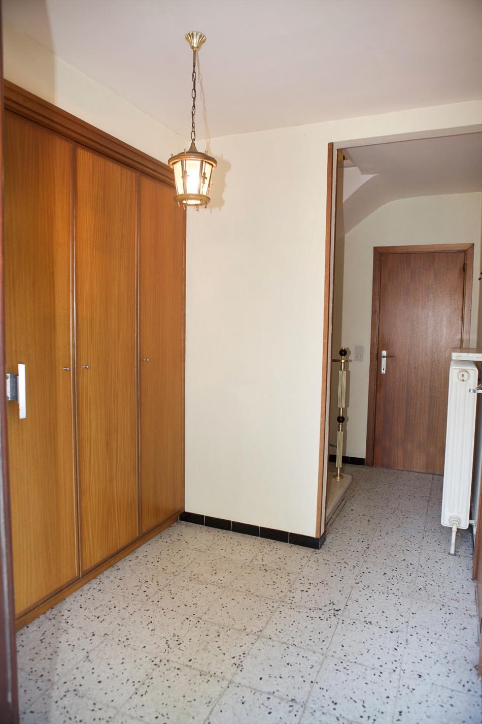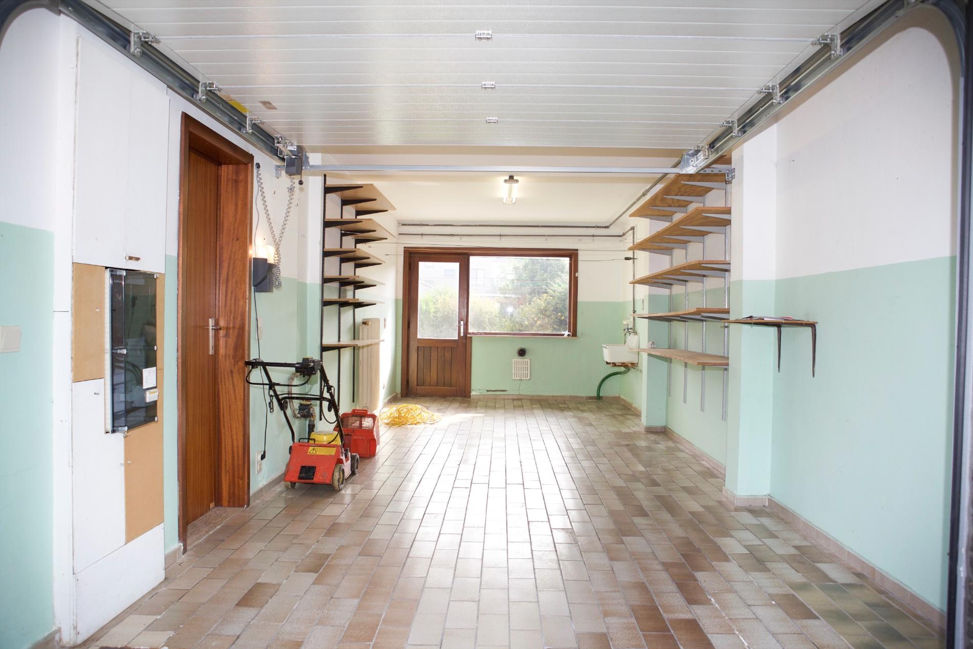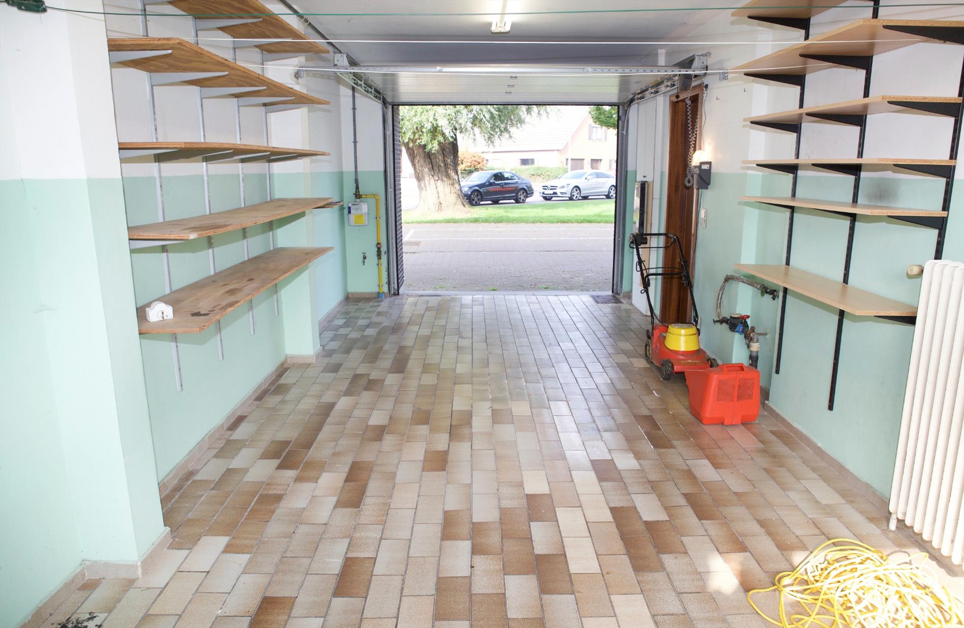 Gelijkvloers: portaal (4,80 x 1,10),- inkom- & traphal (2,40 x 2,30) + ingemaakte kasten (trap en vloer in granitosteen + smeedijzeren balustrade,- koele berging (1,20 x 0,85),- was- & stookplaats (2,80 x 2,40) met c.v.-aardgasgenerator + boiler (met reservaat), afgietbak, en hydrofoor,- ruime garage (7,70 x 3,20) met elektrisch bediende sectionale poort, afgietbak, tellers van aardgas, stadswater, en elektriciteit, en verdeelkasten,- koer-zonneterras (5,80 x 5),- en zonnige tuin (8 x 6) ;
