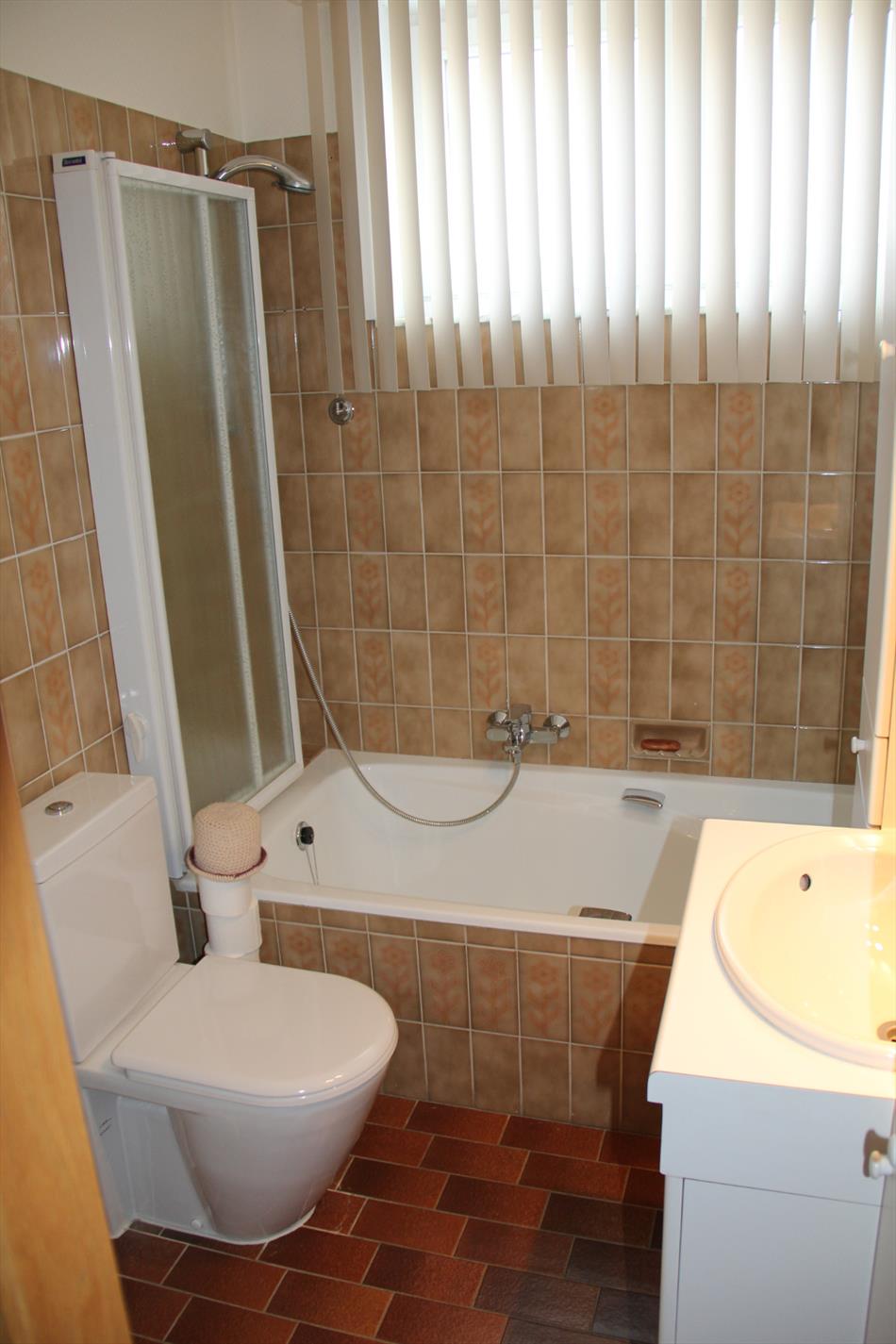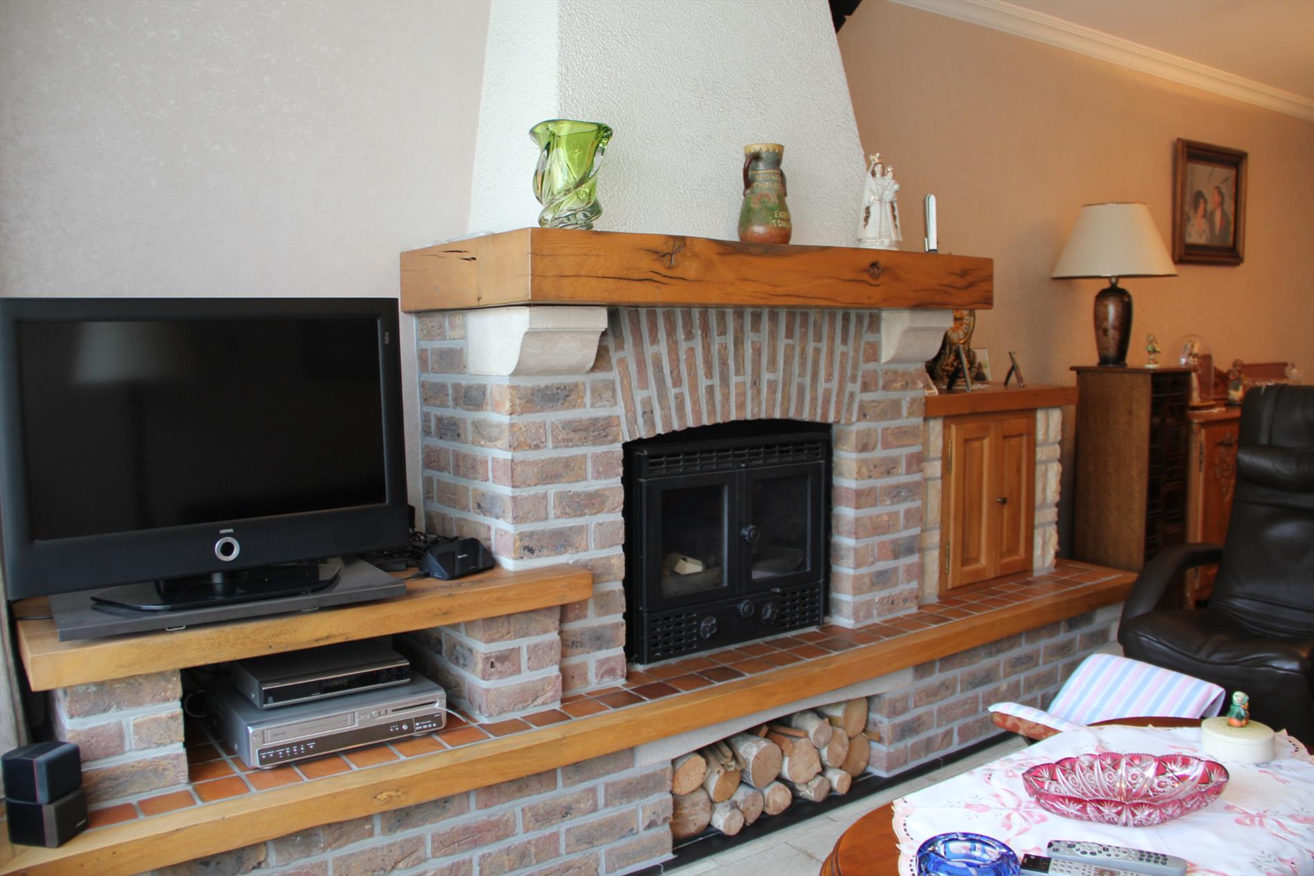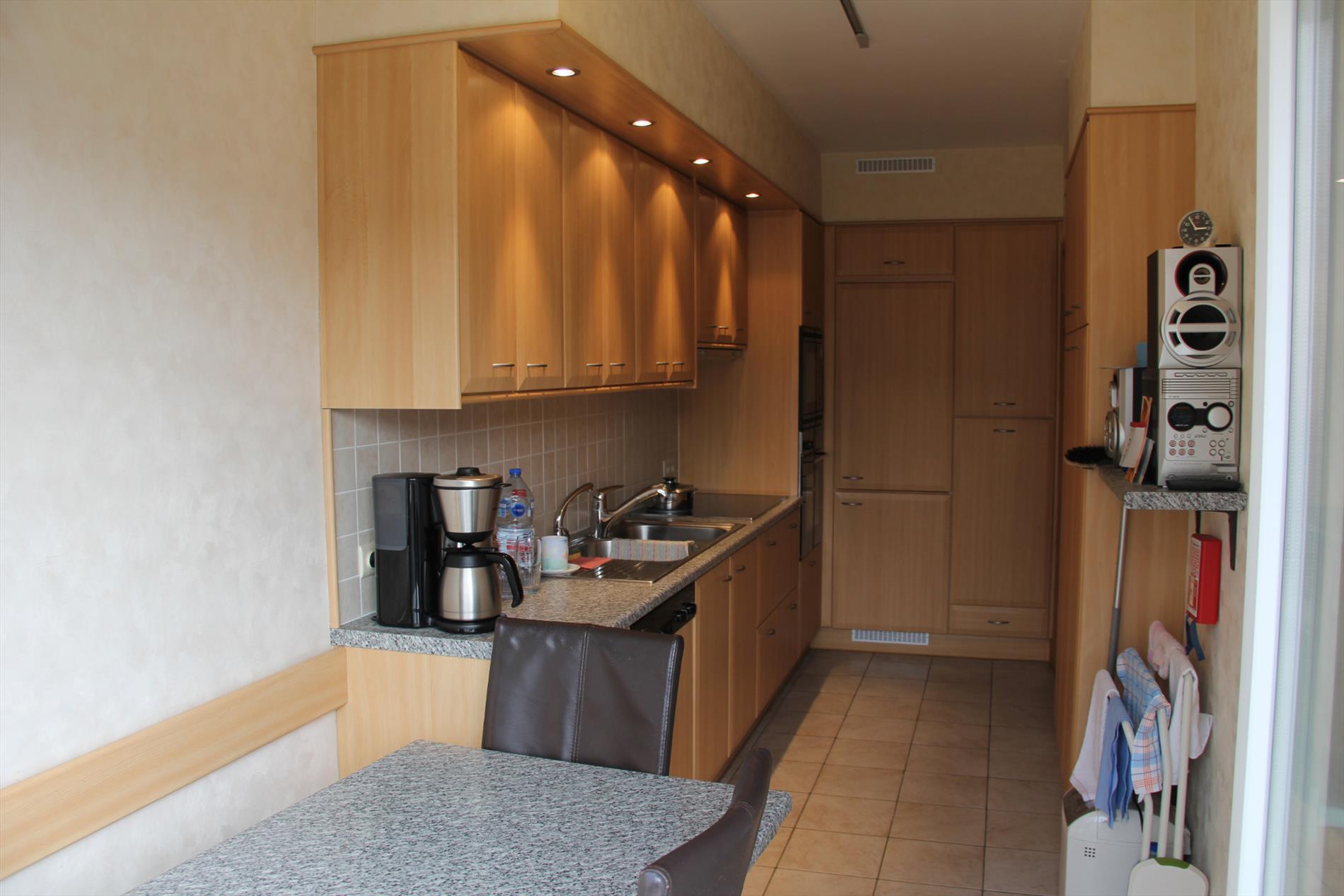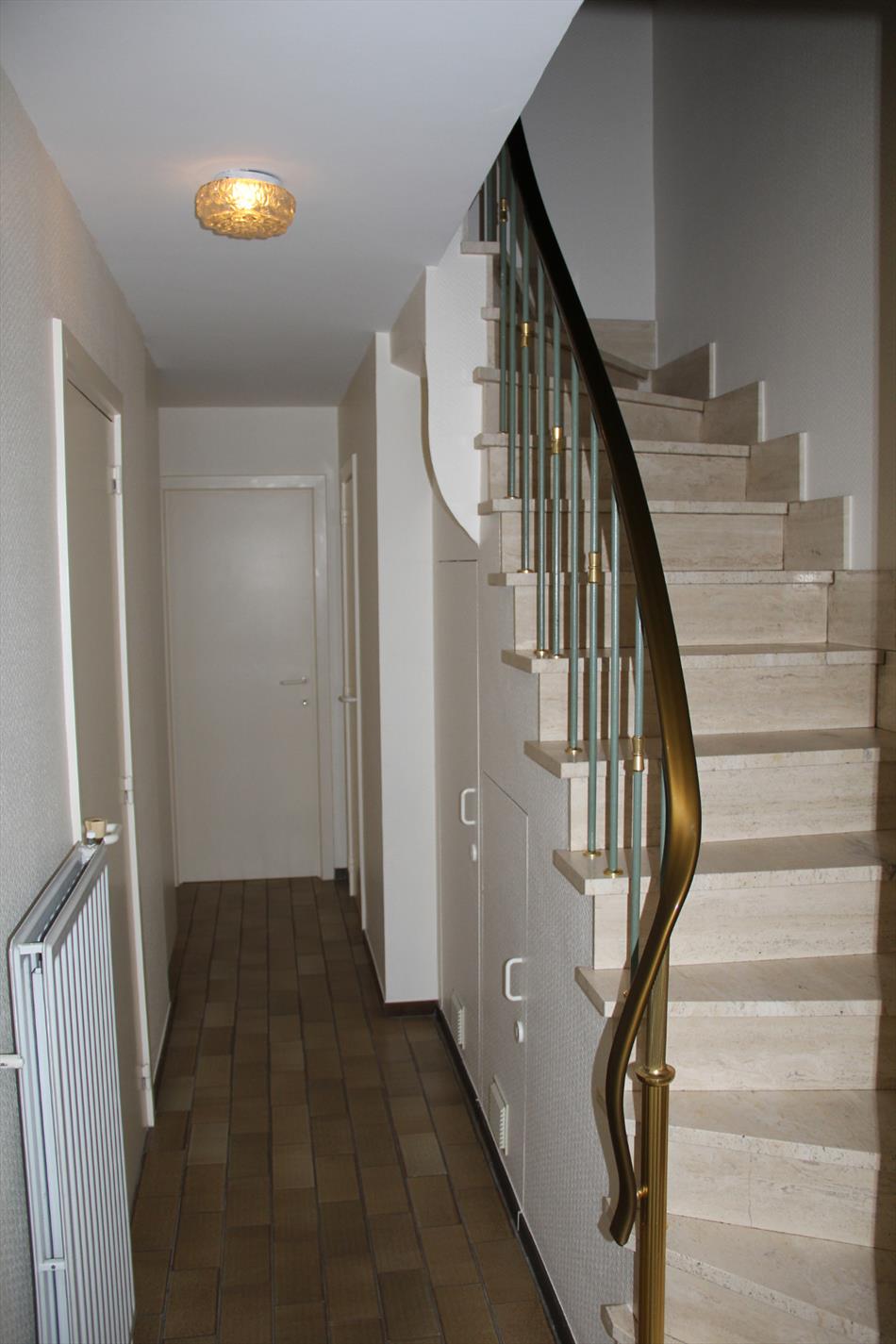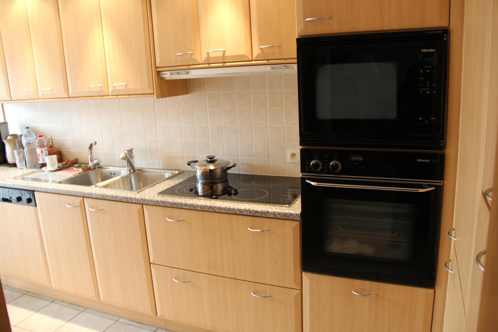 - Bel-étage: overloop + eiken trap,- living (7,50 x 3,80) met videofoon en sierschouw in rustiek metselwerk +-openhaard-inbouwcassette,- keuken (5,71 x 2) met L-vormige keukenblok (onder- en bovenkasten in es) + ingebouwde dubbele inox afwasbak, ceramische kookplaat, dampkap, micro-combi-oven, vaatwas, frigo, en diepvriezer (Miele toestellen),- 2de slaapkamer (3,82 x 3,60),- badkamer (2,30 x 1,80) met ligbad + douchescherm, toiletmeubel + lavabo, en w.c.,-en terras (+ elektrische zonnescherm) ;
