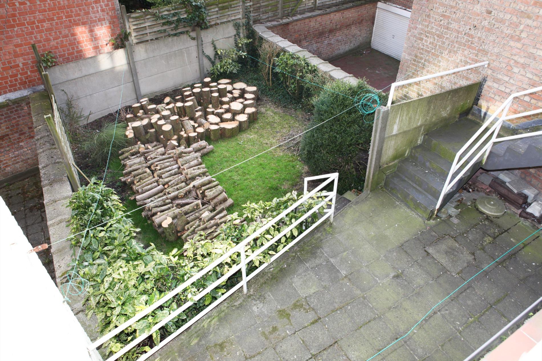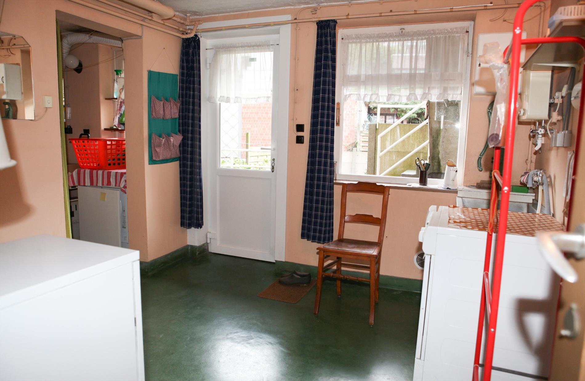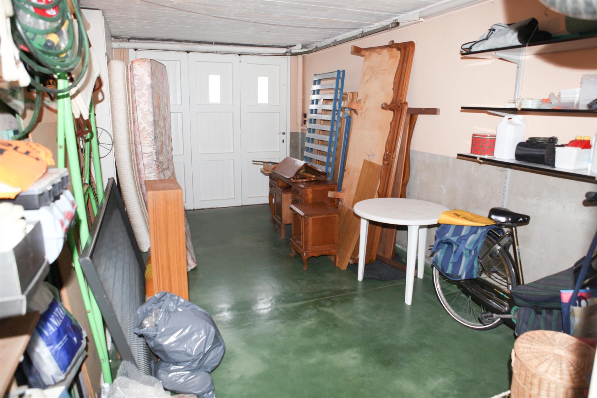 a) gelijkvloers: inkomhall,- bureau (3,85 x 1,65),- traphall + ingebouwde vestiairekasten (marmeren trap),- was- en stookplaats (3,25 x 2,95) met H.R.-aardgasgenerator Sime, afgietbak + handpomp, aansluiting voor was- en droogautomaat, elektr. boiler, en nieuwe achterdeur (in PVC),- garage (5,55 x 2,95) + schuifpoort, en kast met tellers van water-, gas-, en elektriciteit,- proviandplaats (3,05 x 1,40) + ingemaakte kasten,- koer + gebetonneerde buitentrap,- en zonnig tuintje (zon tot 16 u.) ;