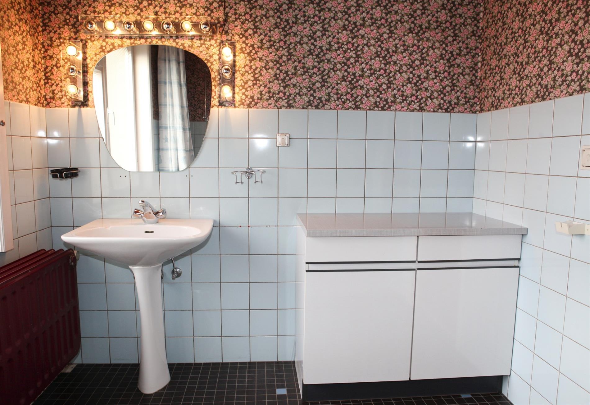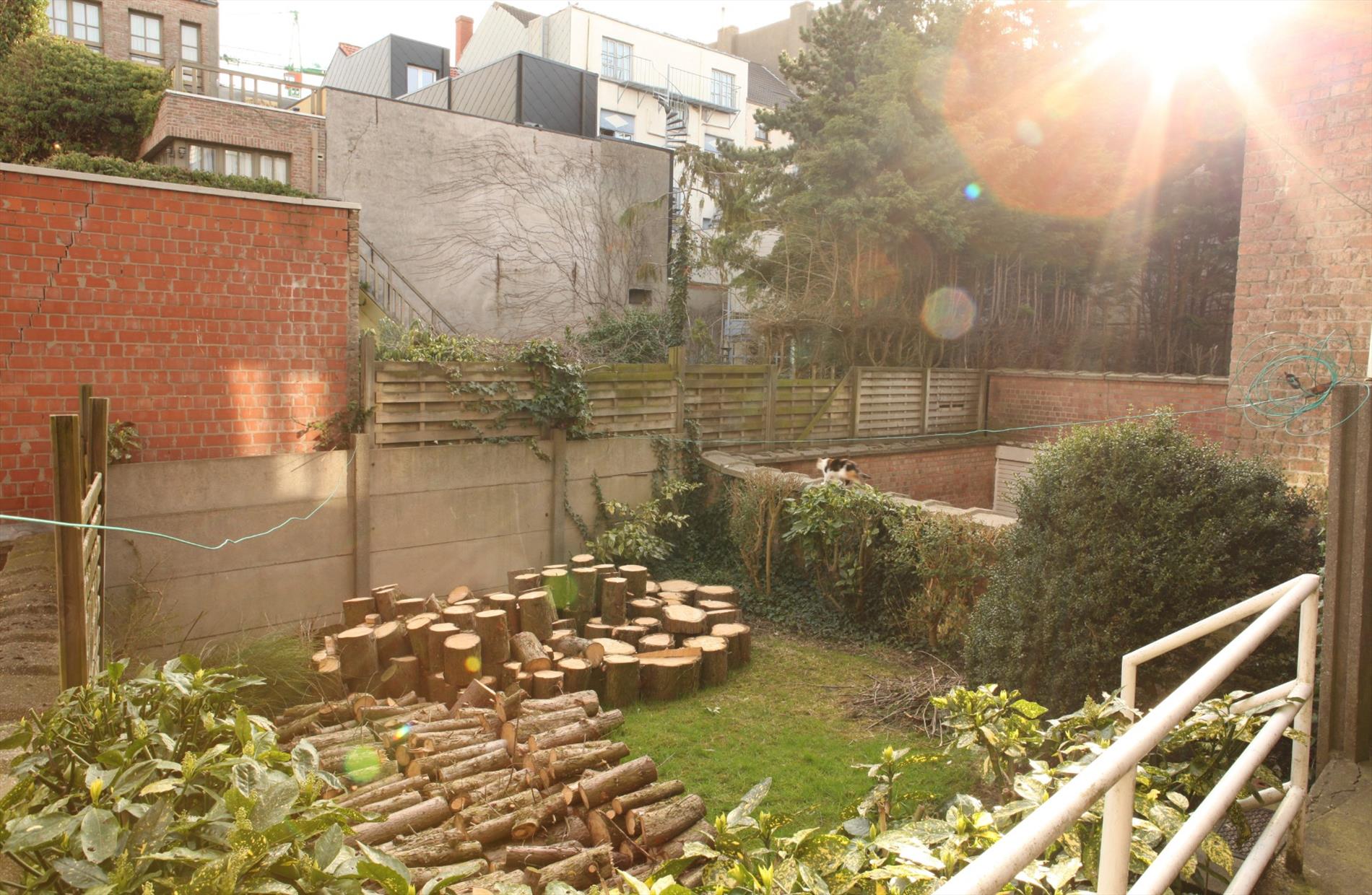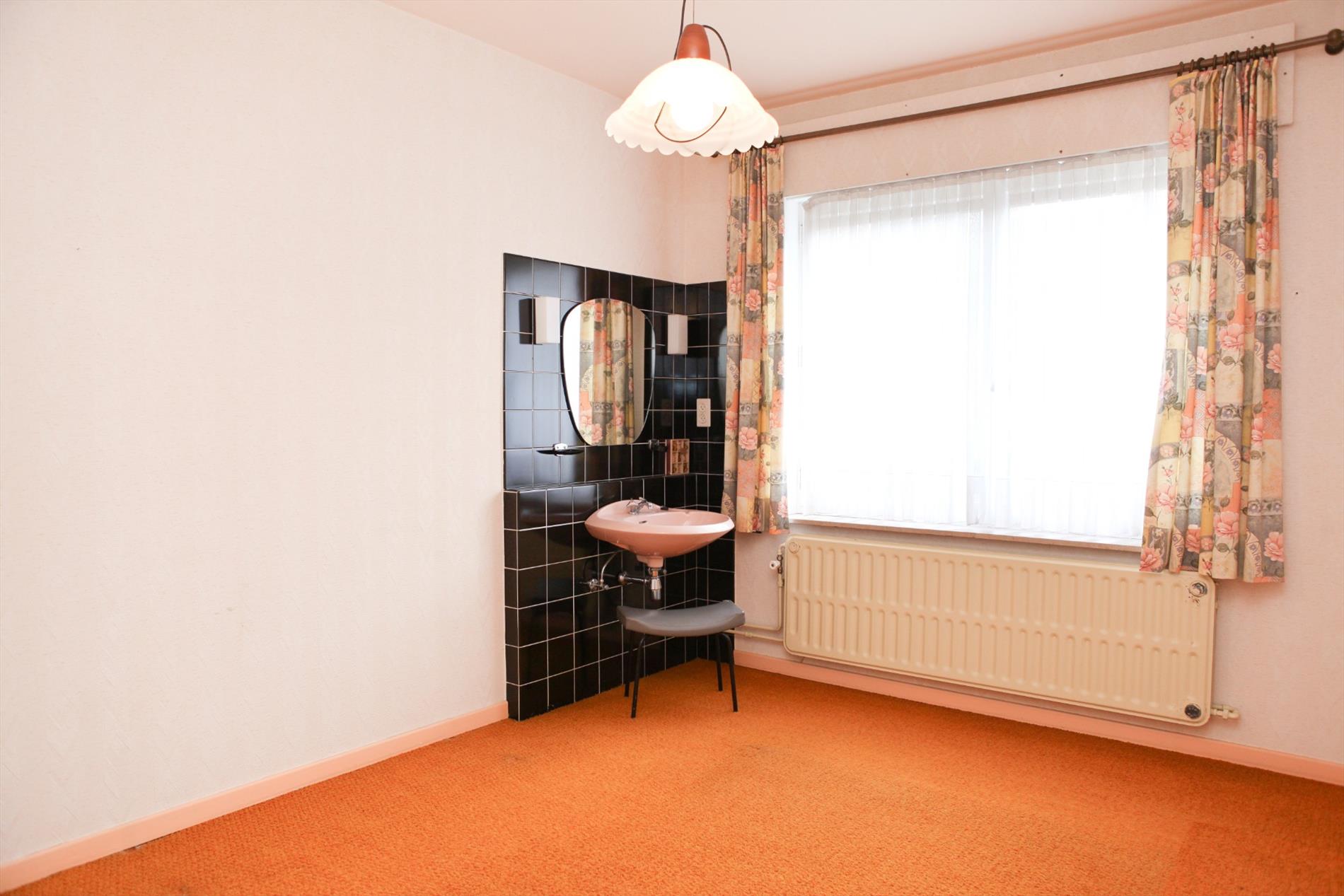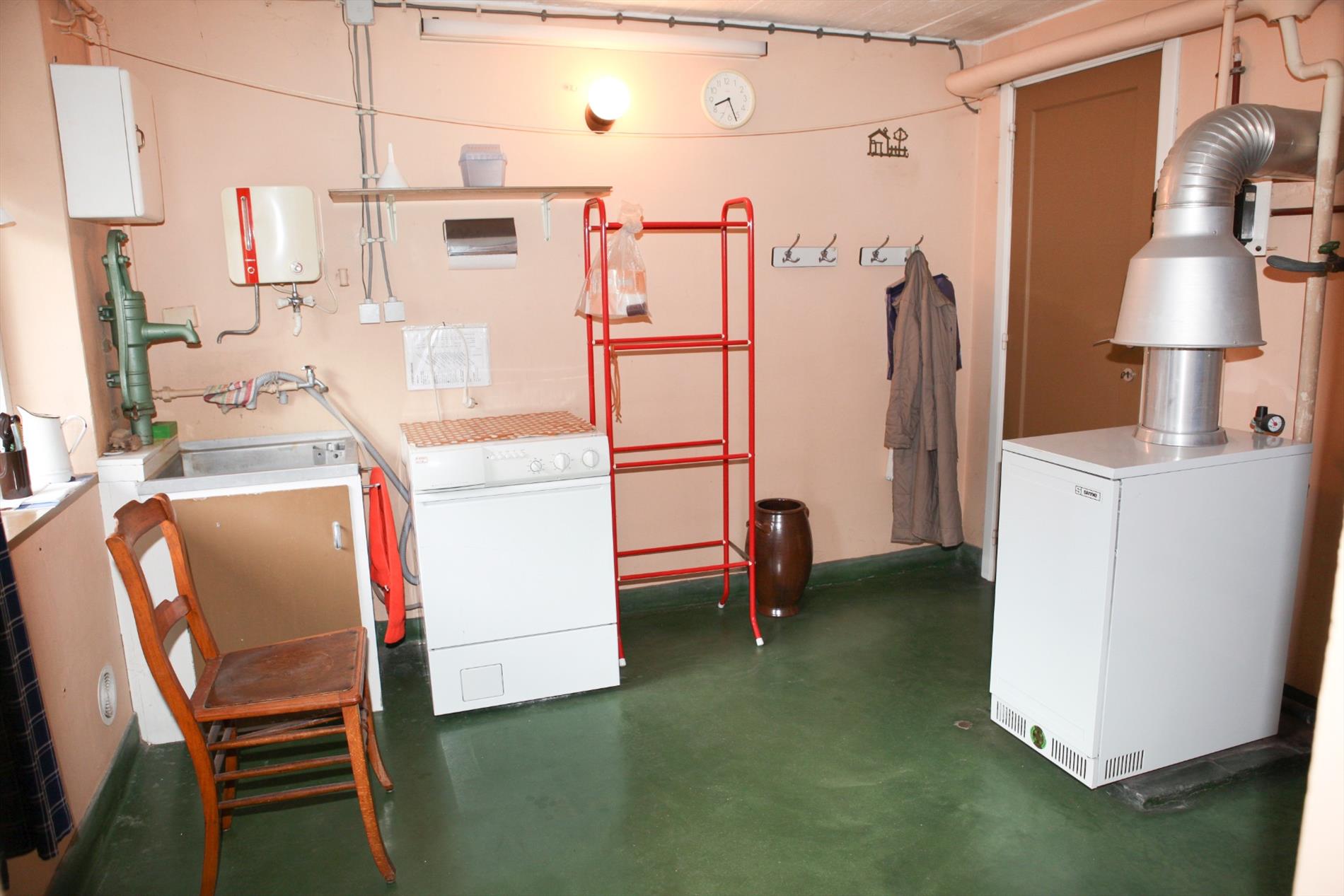 a) gelijkvloers: inkomhall,- bureau (3,85 x 1,65),- traphall + ingebouwde vestiairekasten (marmeren trap),- was- en stookplaats (3,25 x 2,95) met H.R.-aardgasgenerator Sime, afgietbak + handpomp, aansluiting voor was- en droogautomaat, elektr. boiler, en nieuwe achterdeur (in PVC),- garage (5,55 x 2,95) + schuifpoort, en kast met tellers van water-, gas-, en elektriciteit,- proviandplaats (3,05 x 1,40) + ingemaakte kasten,- koer + gebetonneerde buitentrap,- en zonnig tuintje (zon tot 16 u.) ;