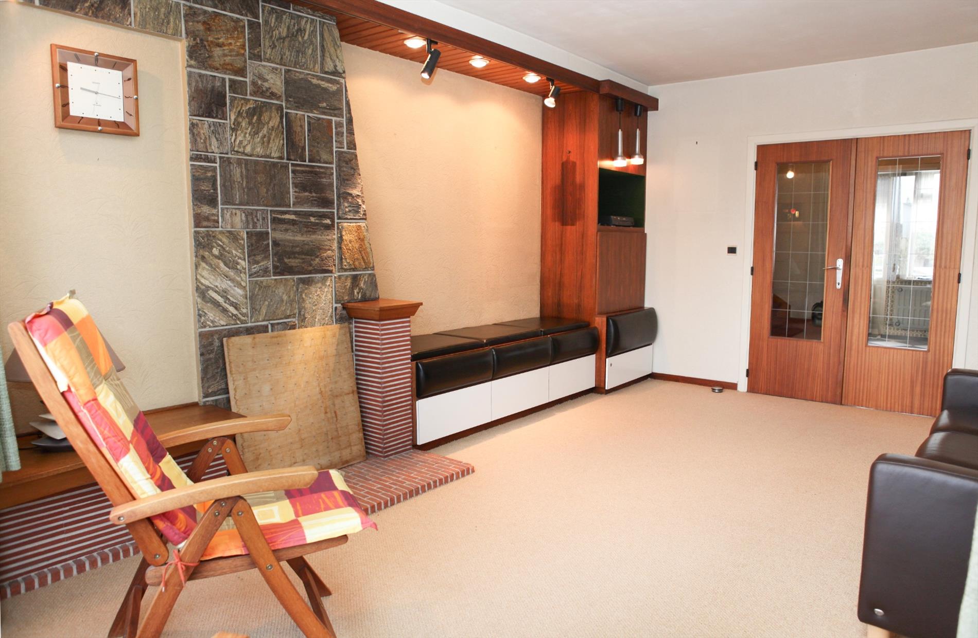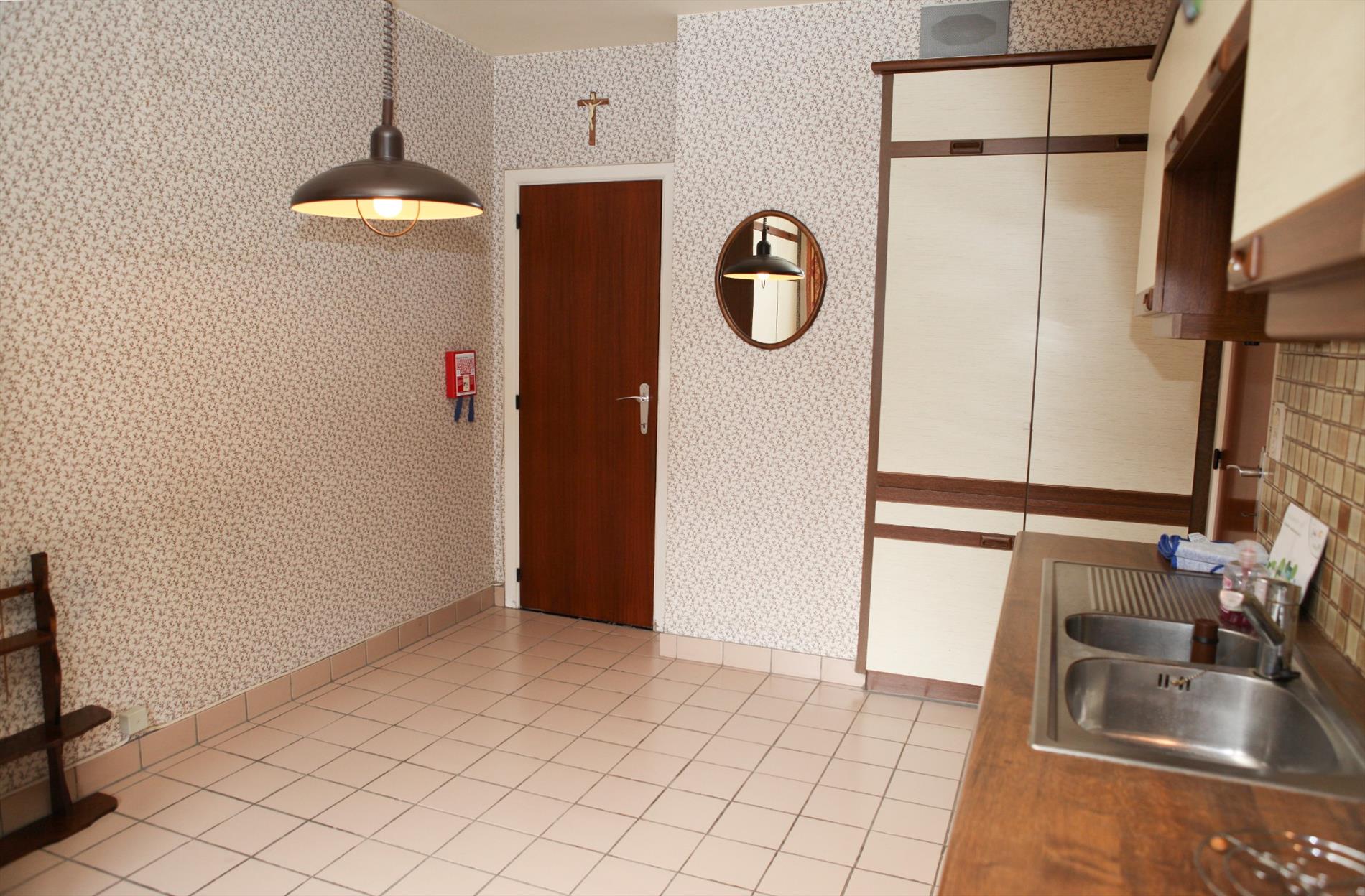 b) bel-étage: overloop + parlofoon en trap in beuk,- hall + vestiaire, en terrasdeur,- toilet,- achter-terras + tuintrap,- zonnige living (28 m²) met sierschouw (in natuursteen) + aangebouwde zitbank + kasten,- zonneterras (2,05 x 1,70),- keuken (4,25 x 3,05) met ingemaakte kasten & aanbouwkasten met frigo & diepvriezer, + keukenblok (onder- en bovenkasten) + ingebouwde dubbele inox afwasbak, ceramisch kookplaat, oven, en dampkap ;