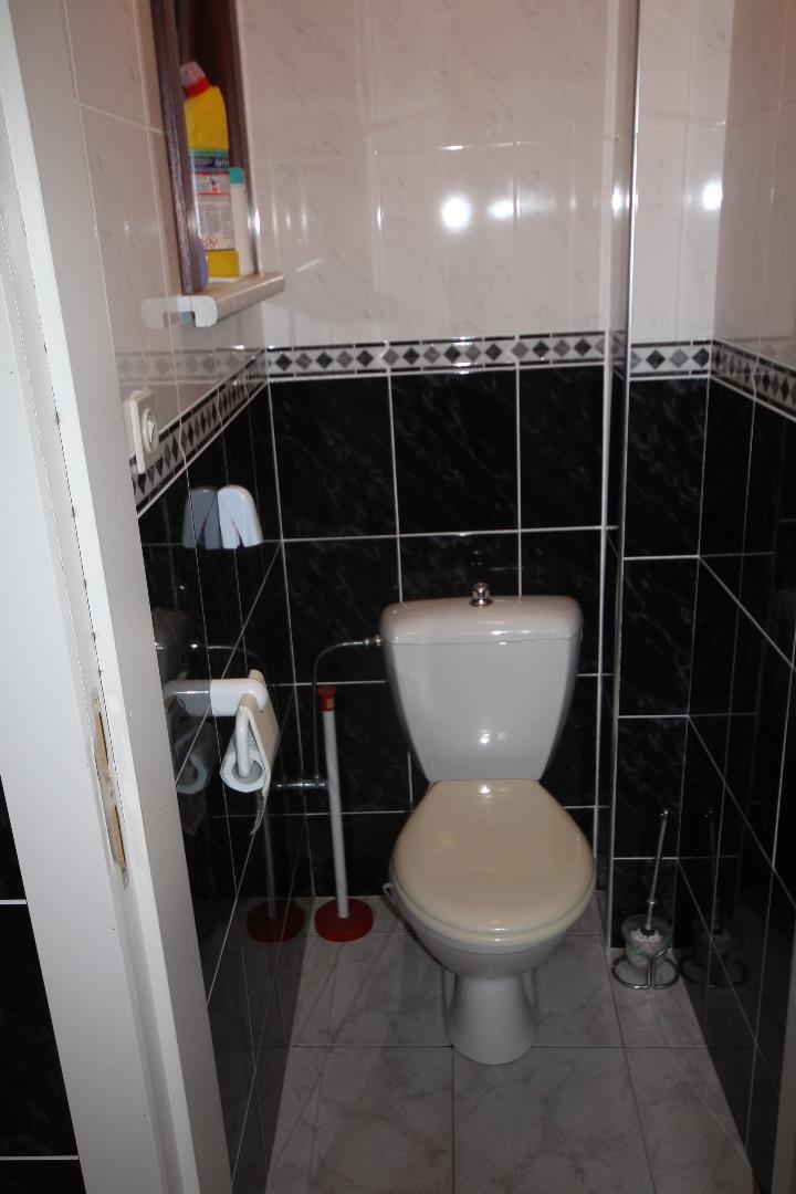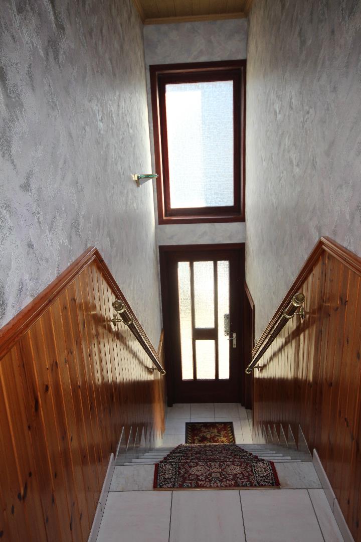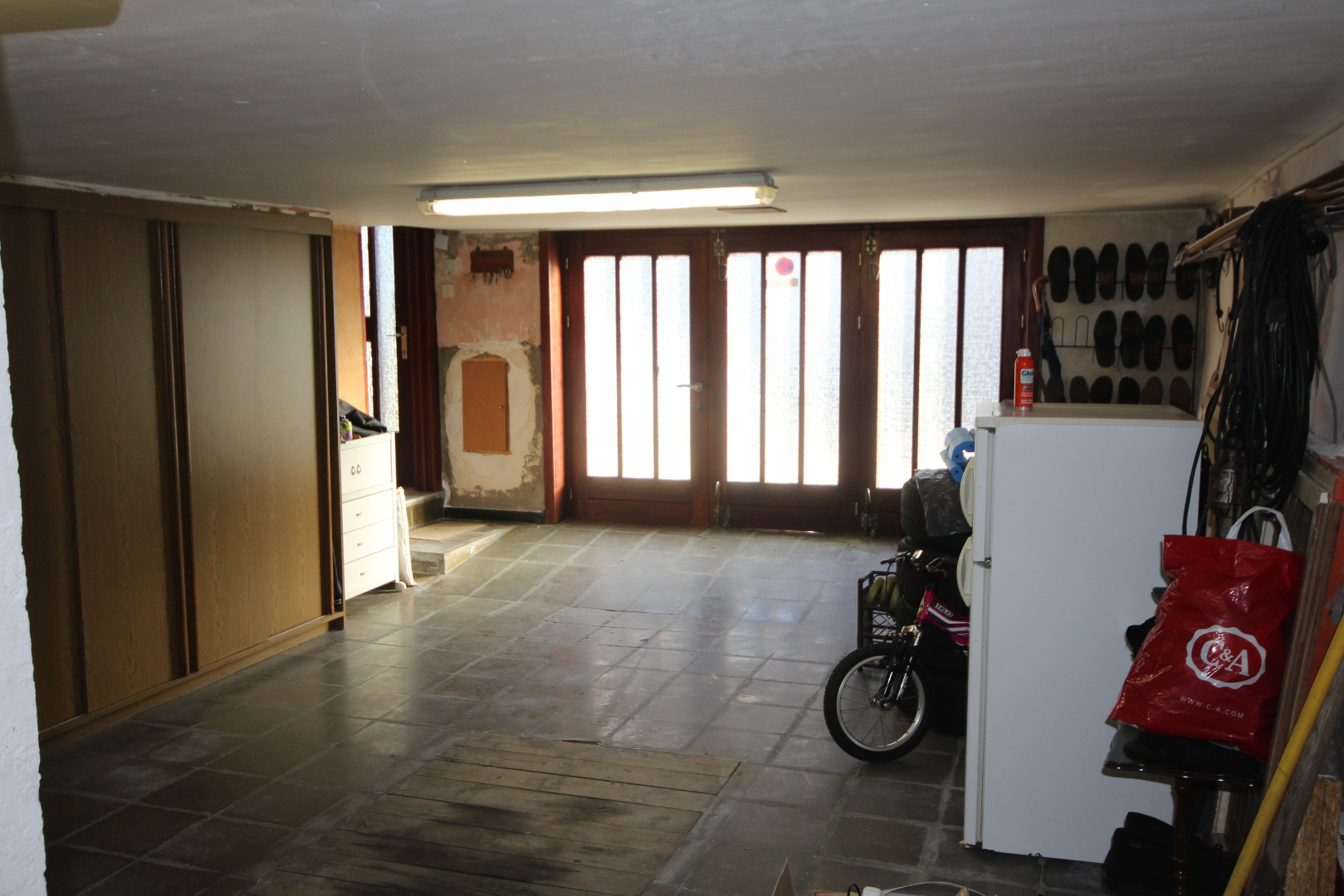 a) inkom + marmeren trap,- garage (31,40 m²) + smeerput, ingemaakte vestiairekasten en achterdeur ; * souterrain: overloop,- badkamer met douche, toiletmeubel + 2 ingebouwde lavabo’s, en w.c.,- bijkeuken met onder- en bovenkasten, dubbele inox afwasbak + pomp,- wasplaats met hydrofoor, boiler, en aansluiting voor was- & droogautomaat,- tellerkelder,- zonnige koer + buitentrap, en werkplaats (6 x 4,50) ;