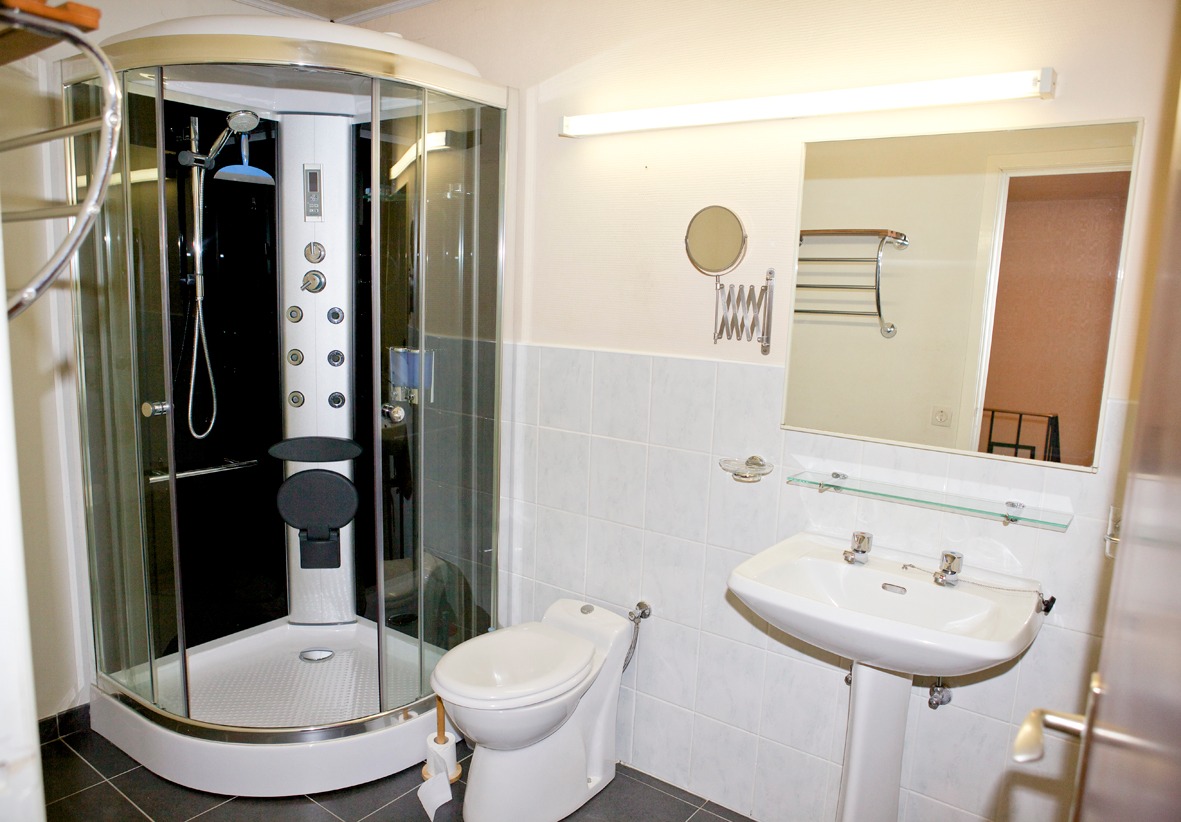 c) tweede verdieping: overloop,- badkamer (2,80 x 1,80) met nieuw toilet, nieuwe douche met glazen schuifwanden en lavabo (marmerachtige faience),- kleine achter-slaapkamer (2,50 x 2,75),- 2de achter-slaapkamer (2,50 x 2,80),- grote voor-slaapkamer (3,85 x 3,25) met aansluitende dressing (2,05 x 1,80).