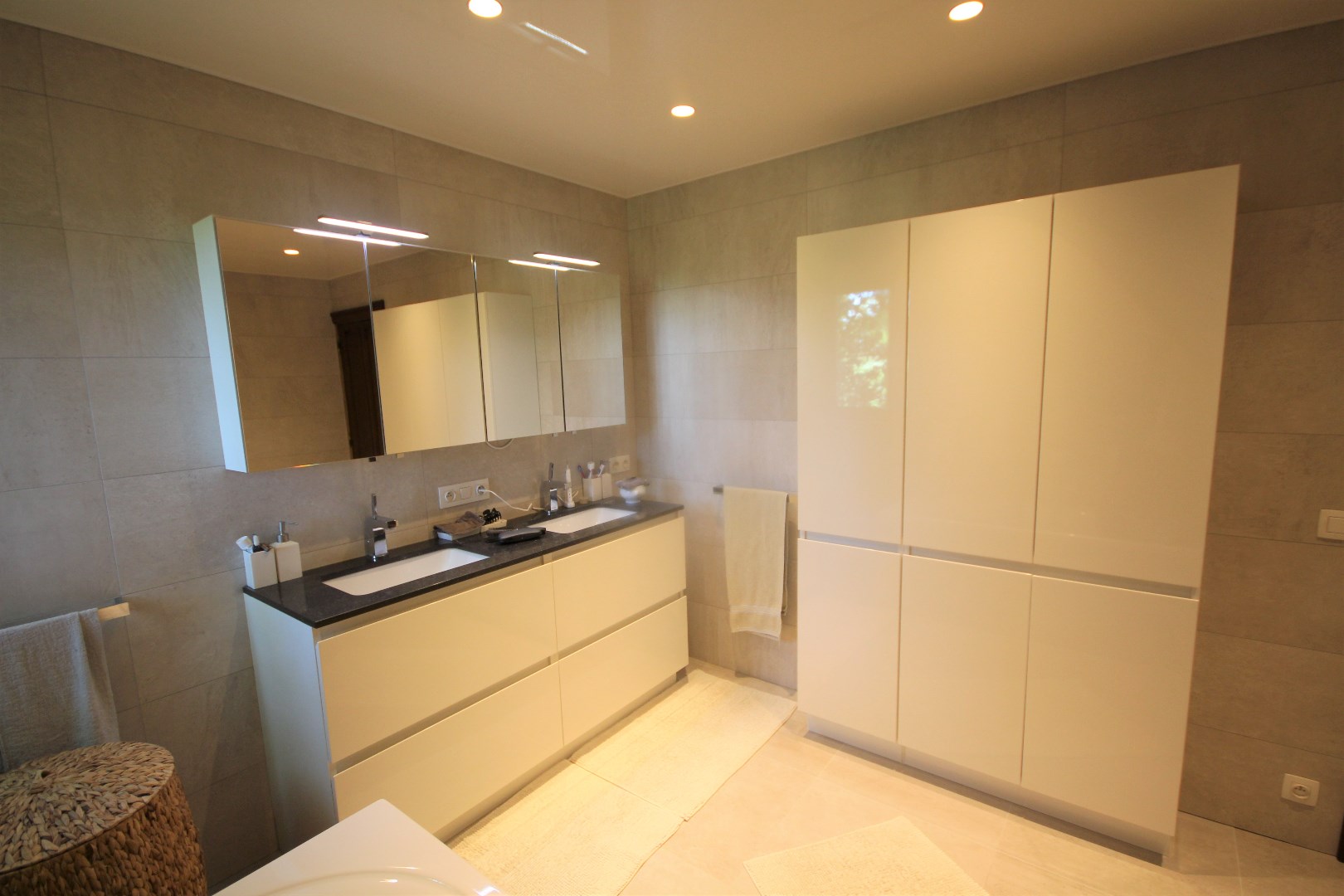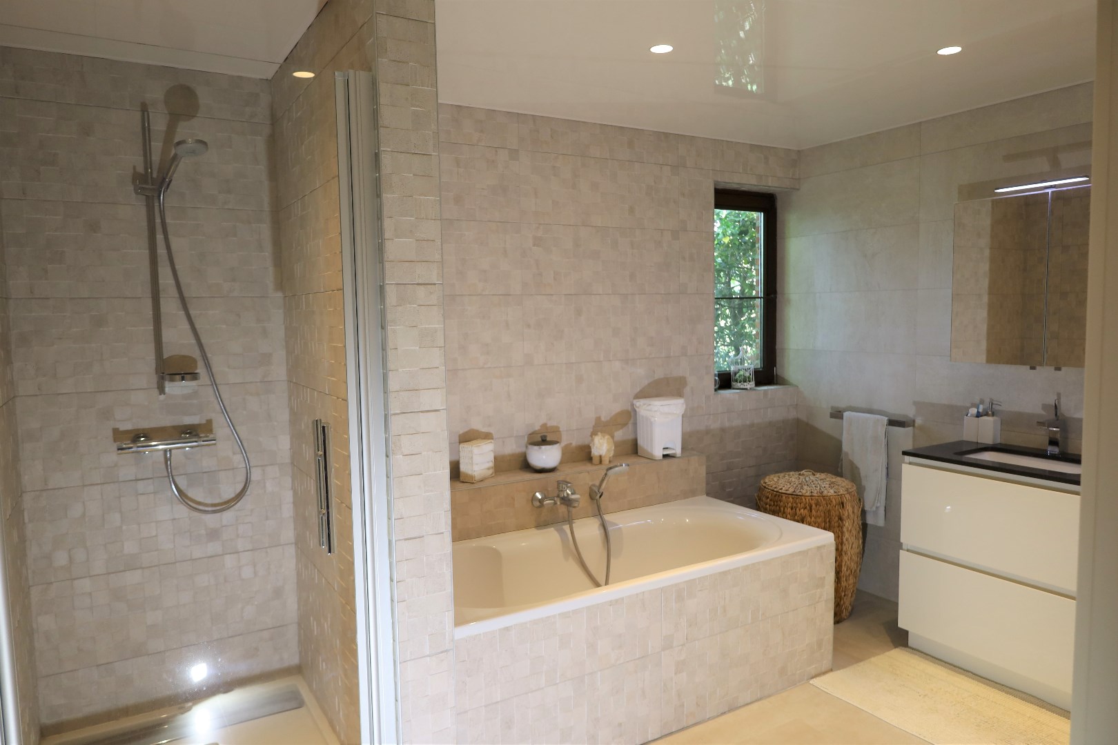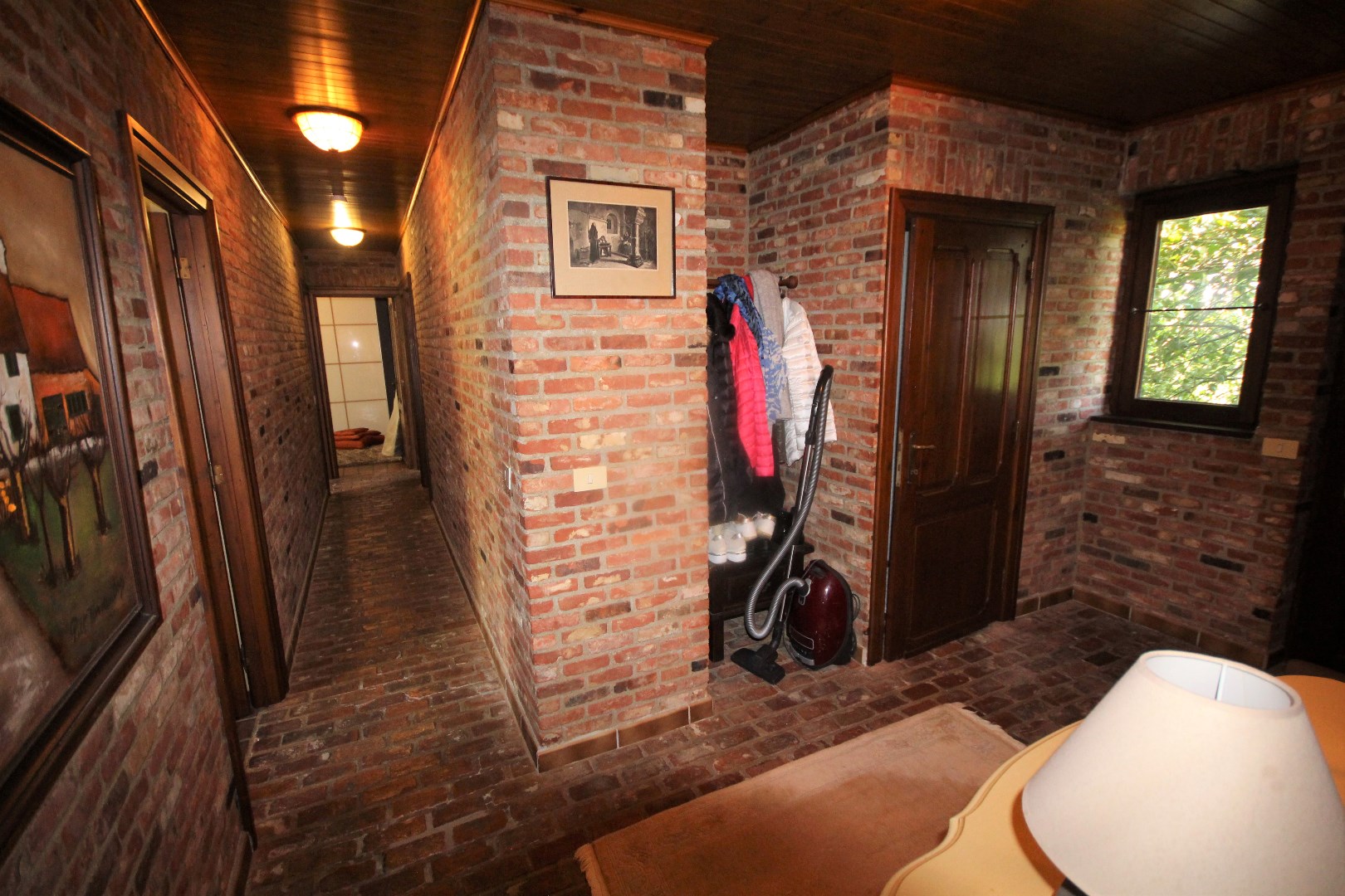 De woning omvat: inkomhall + vestiaire,- toilet + lavabo,- ruime woonkamer (65,30 m²) met living (7,00 x 5,00) + openhaard, salon-zitput (3,45 x 3,00), bibliotheek (3,10 x 2,60), bureau (3,00 x 2,60),- keuken (3,95 x 3,80) met parlofoon, L-vormige keukenblok + ingebouwde inductiekookplaat, dampkap, warmeluchtoven, microgolf, frigo, vaatwas, en dubbele afwasbak; 2de keukenblok met diverse kasten,- wasplaats (3,40 x 2,20) met douche, w.c., en afgietbak (was- en droogautomaat),- masterbedroom (4,40 x 3,90) met dressingskasten,- 2de, 3de, en 4de slaapkamers (resp.: 5,40 x 2,95 en 4,75 x 2,90 en 3,00 x 2,90),- badkamer (3,70 x 2,90) met in-loop-douche, ligbad, toiletmeubel + 2 ingebouwde lavabo’s, en linnenkast,- spinde (3,70 x 1,50),- dubbele garage (51,40 m²) met 2 geautomatiseerde sectionale poorten, stookinstallatie, hydrofoor, zoldertap, en tellers van water en elektriciteit,- zolder (ca 250 m²) met 2 elektrische boilers 200L en 80L).