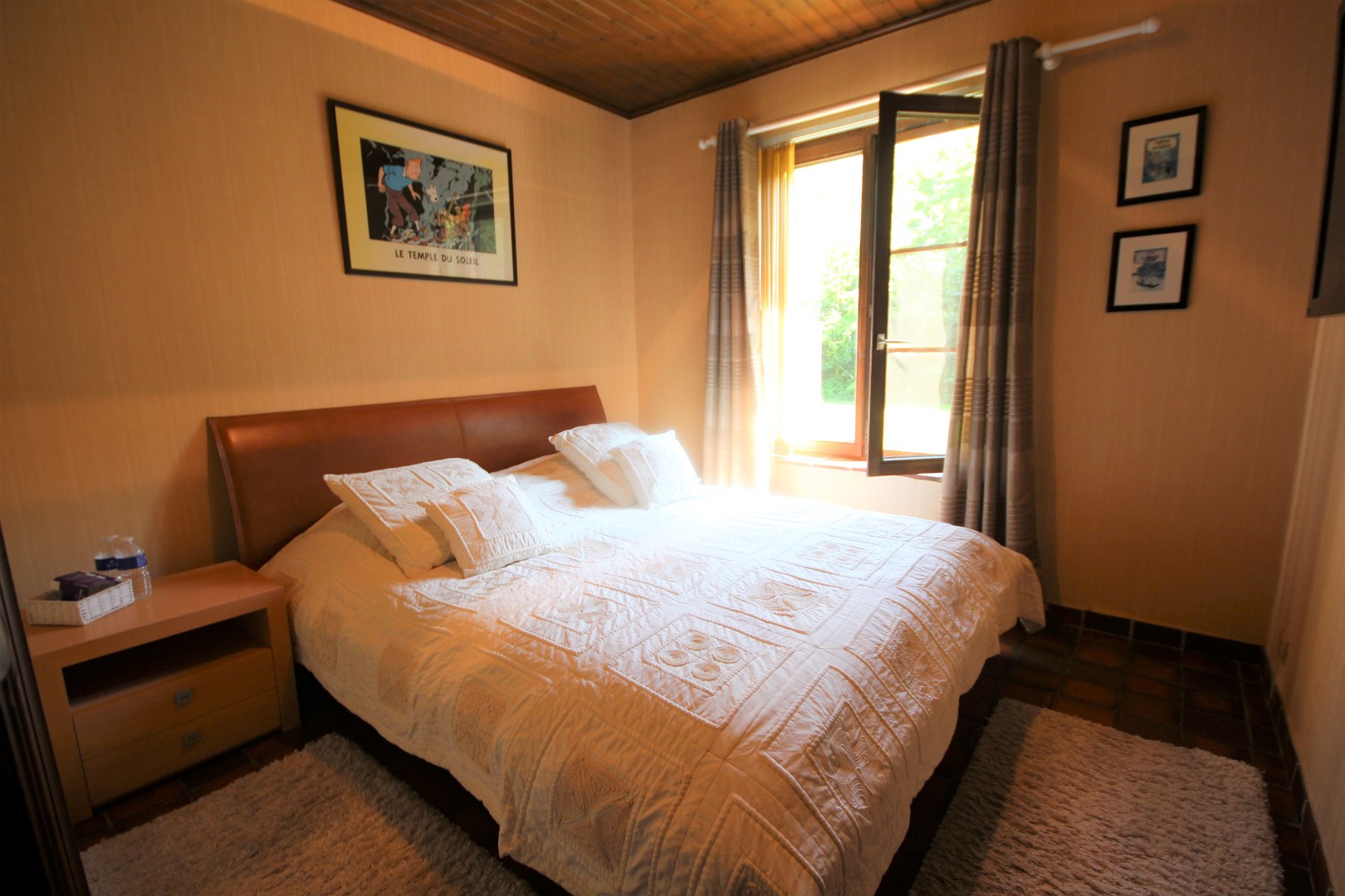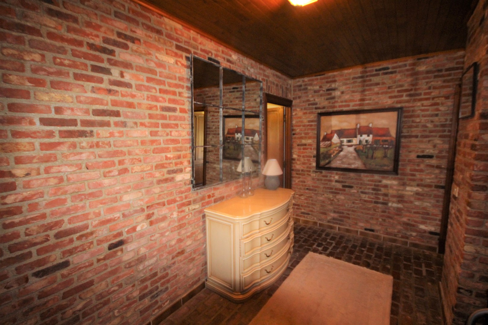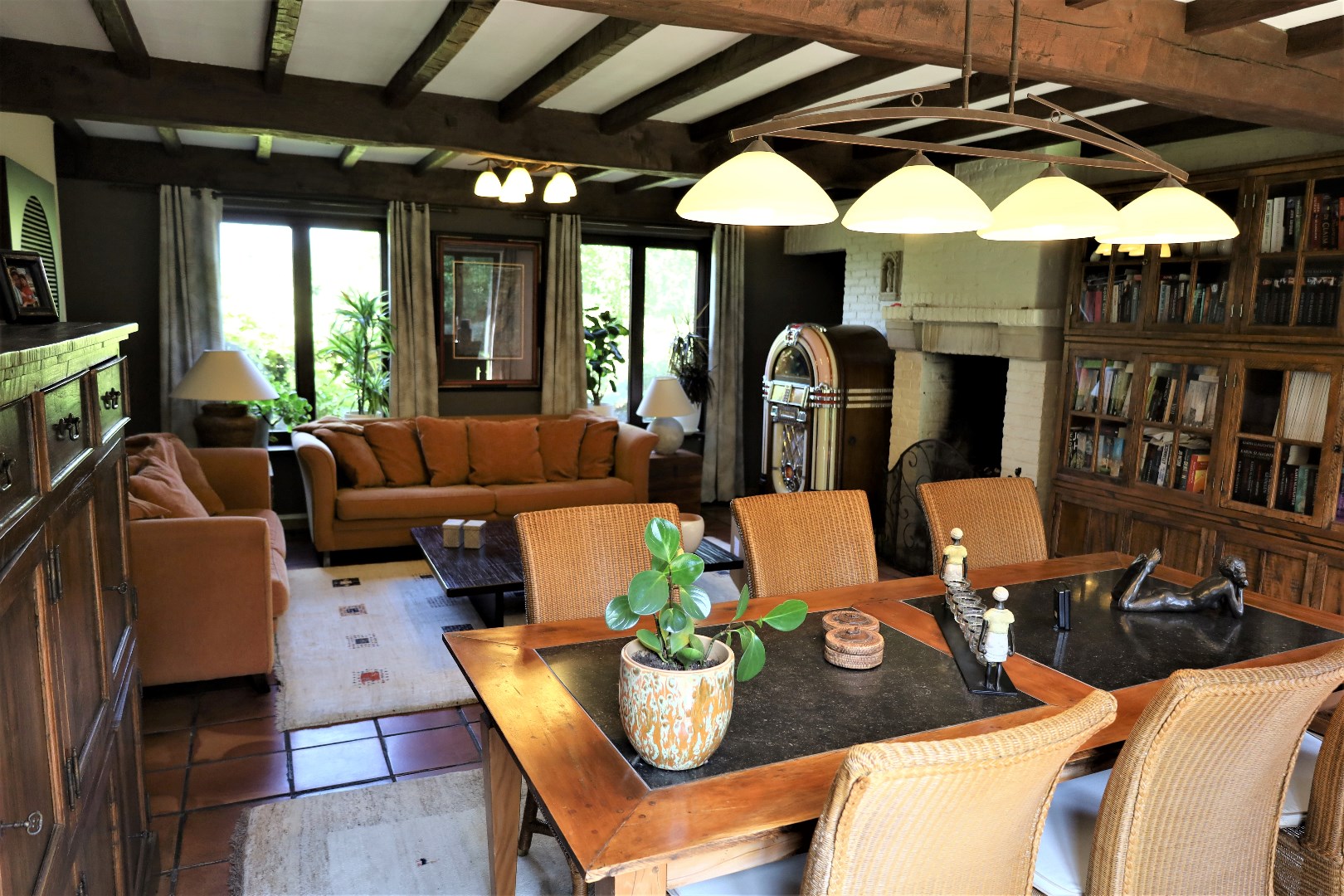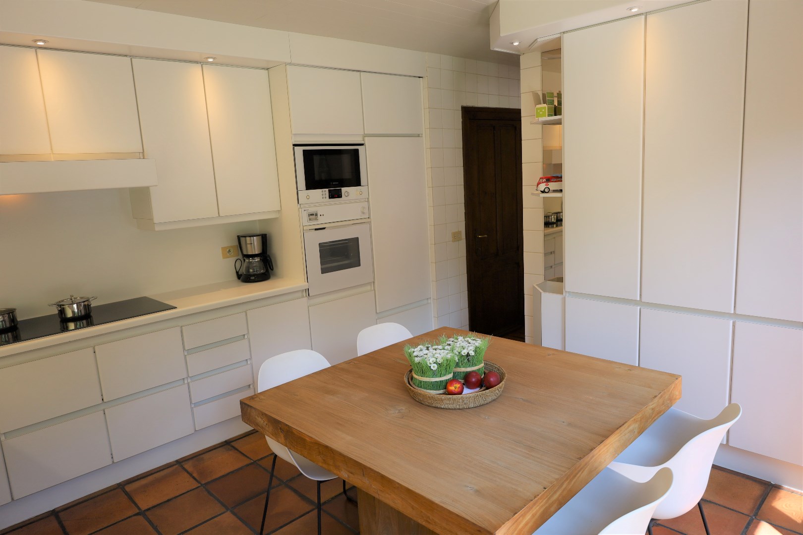 De woning omvat: inkomhall + vestiaire,- toilet + lavabo,- ruime woonkamer (65,30 m²) met living (7,00 x 5,00) + openhaard, salon-zitput (3,45 x 3,00), bibliotheek (3,10 x 2,60), bureau (3,00 x 2,60),- keuken (3,95 x 3,80) met parlofoon, L-vormige keukenblok + ingebouwde inductiekookplaat, dampkap, warmeluchtoven, microgolf, frigo, vaatwas, en dubbele afwasbak; 2de keukenblok met diverse kasten,- wasplaats (3,40 x 2,20) met douche, w.c., en afgietbak (was- en droogautomaat),- masterbedroom (4,40 x 3,90) met dressingskasten,- 2de, 3de, en 4de slaapkamers (resp.: 5,40 x 2,95 en 4,75 x 2,90 en 3,00 x 2,90),- badkamer (3,70 x 2,90) met in-loop-douche, ligbad, toiletmeubel + 2 ingebouwde lavabo’s, en linnenkast,- spinde (3,70 x 1,50),- dubbele garage (51,40 m²) met 2 geautomatiseerde sectionale poorten, stookinstallatie, hydrofoor, zoldertap, en tellers van water en elektriciteit,- zolder (ca 250 m²) met 2 elektrische boilers 200L en 80L).