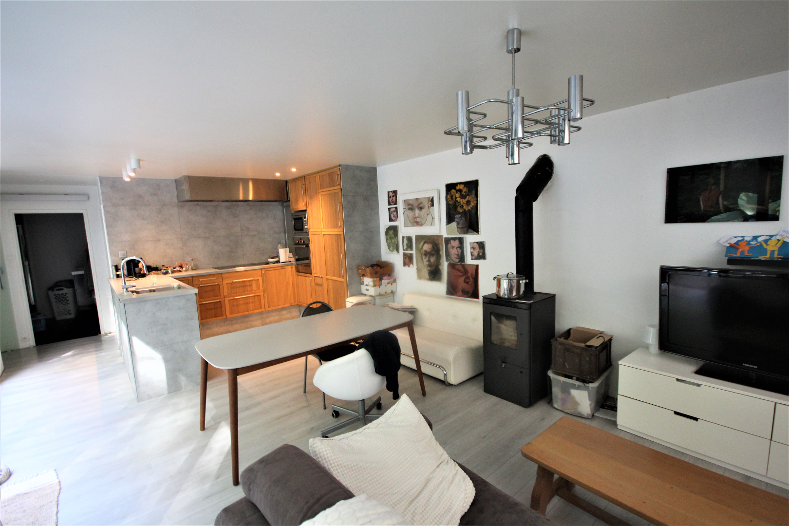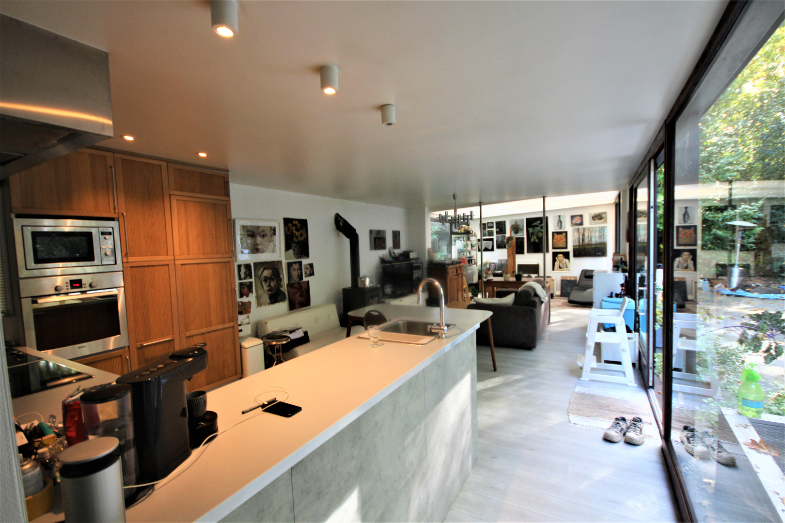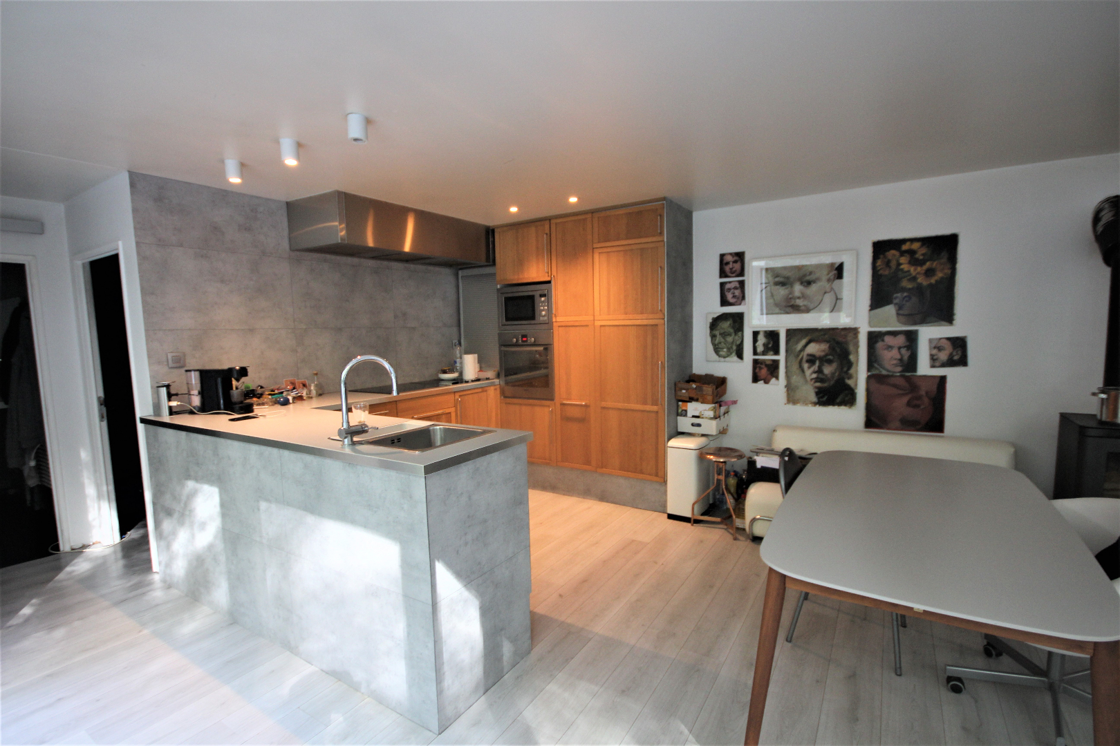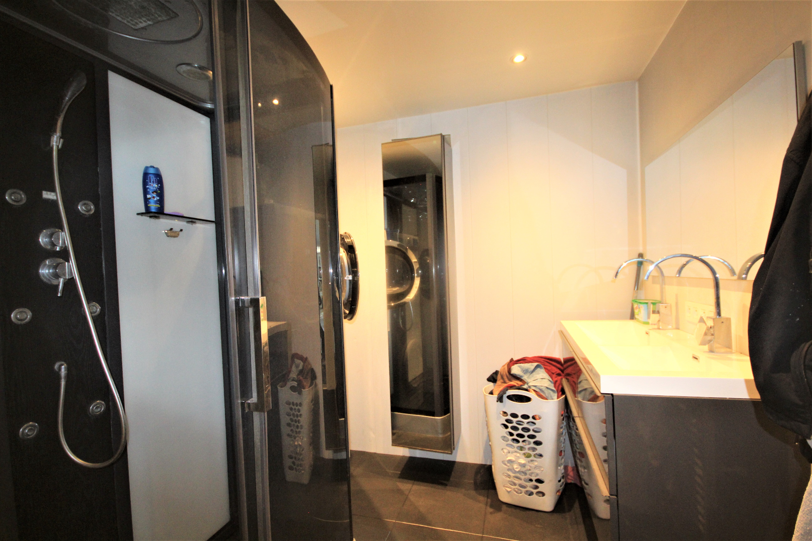 De woning omvat een woonkamer (44 m²) met living + kachel-allesbrander en open keuken (met U-vormige keukenblok + ingebouwde inductie-kookplaat, frituur, grill, heteluchtoven, microgolf, frigo, vaatwas, en afwasbak),- slaapkamer (3,59 x 3,05) + ingemaakte kasten- badkamer met douche, toiletmeubel + 2 lavabo’s, aansluiting voor was- & droogautomaat, en elektrische boiler,- toilet met hang-w.c.,- dressingroom (3,67 x 2,38) met aanbouwkasten, en palletkachel,- 2de slaapkamer (3,65 x 3) + aanbouwkasten,- garage (6,10 x 3,61) met elektriciteitsteller & zekeringkast.