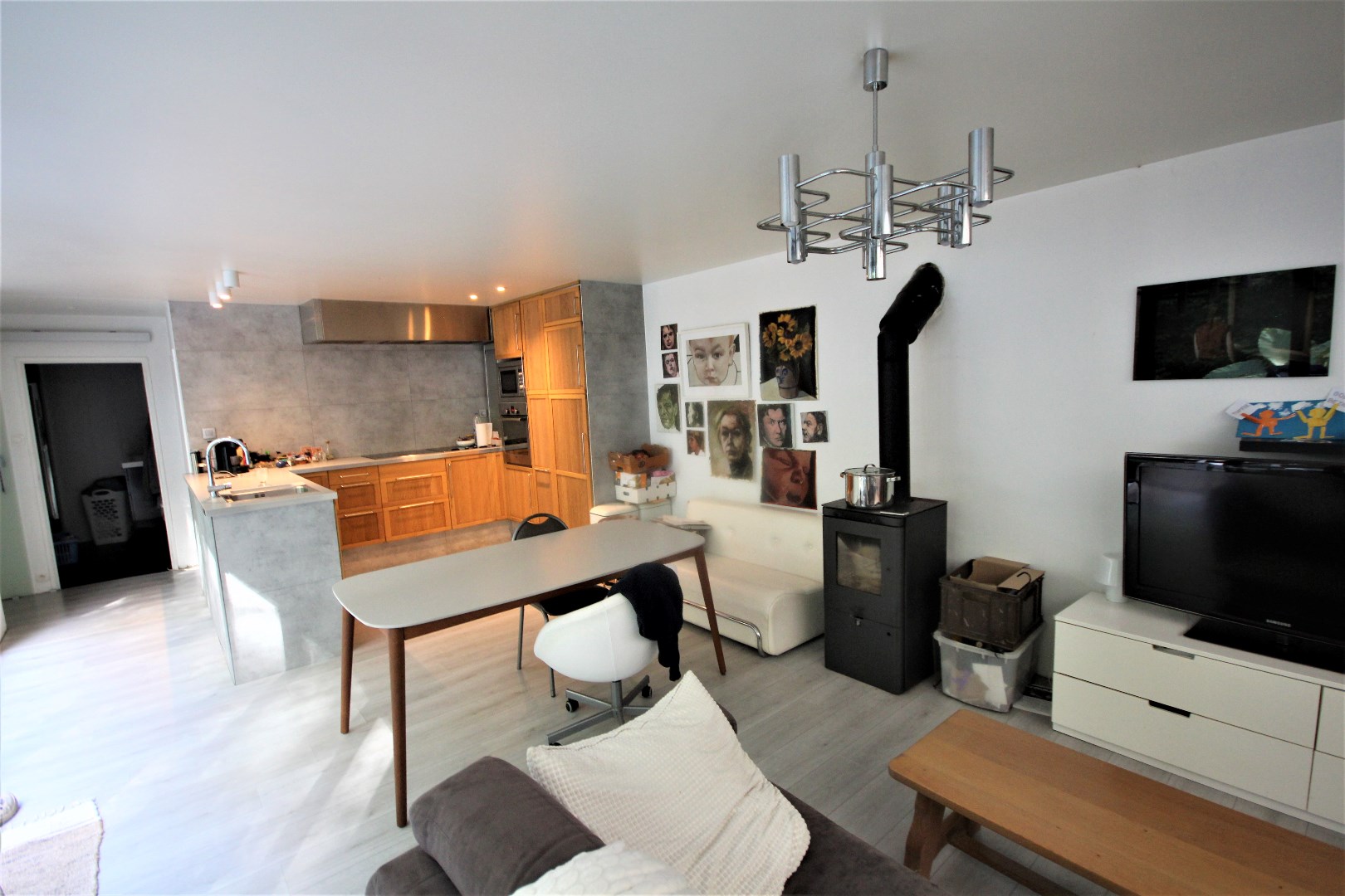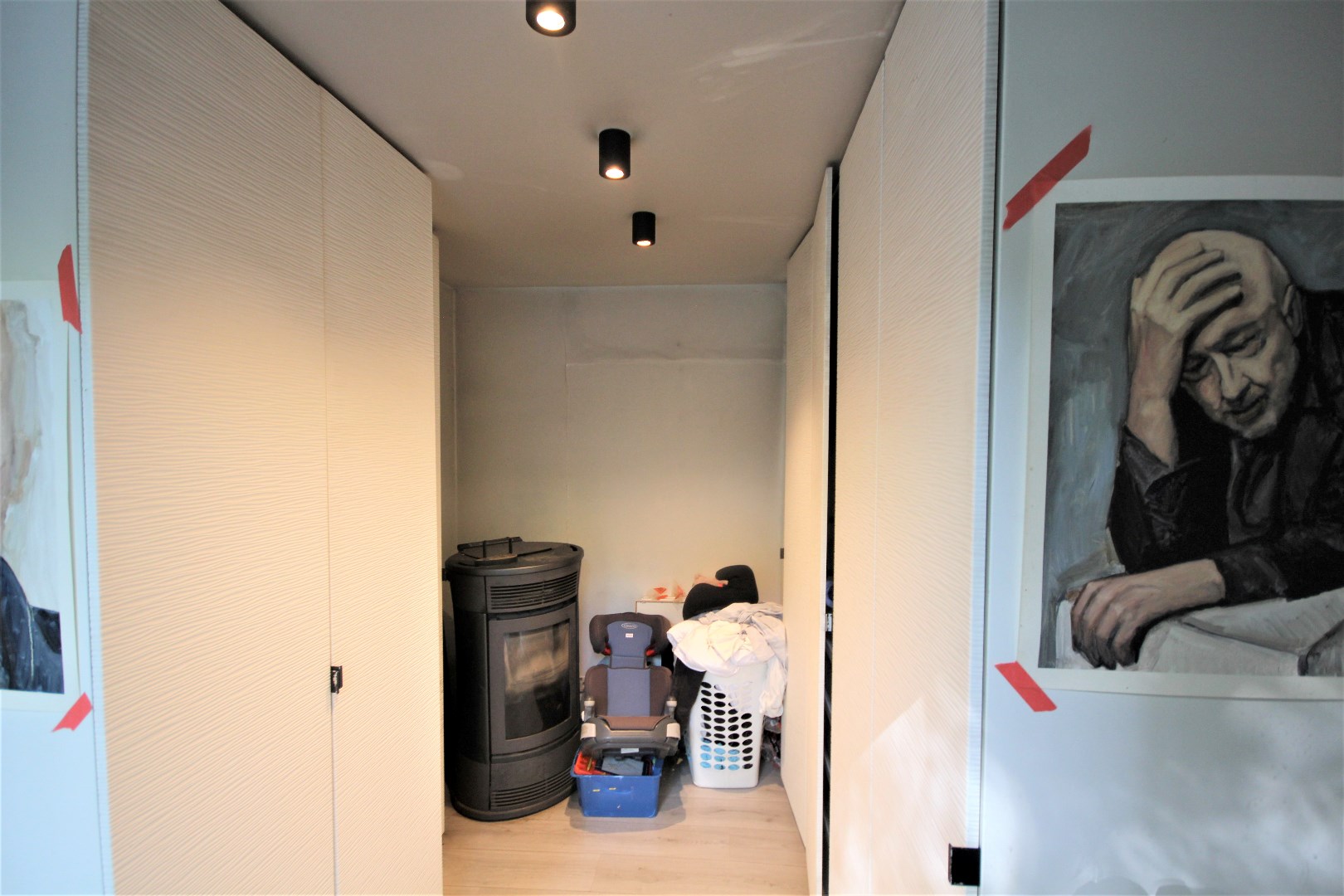 De woning omvat een woonkamer (44 m²) met living + kachel-allesbrander en open keuken (met U-vormige keukenblok + ingebouwde inductie-kookplaat, frituur, grill, heteluchtoven, microgolf, frigo, vaatwas, en afwasbak),- slaapkamer (3,59 x 3,05) + ingemaakte kasten- badkamer met douche, toiletmeubel + 2 lavabo’s, aansluiting voor was- & droogautomaat, en elektrische boiler,- toilet met hang-w.c.,- dressingroom (3,67 x 2,38) met aanbouwkasten, en palletkachel,- 2de slaapkamer (3,65 x 3) + aanbouwkasten,- garage (6,10 x 3,61) met elektriciteitsteller & zekeringkast.