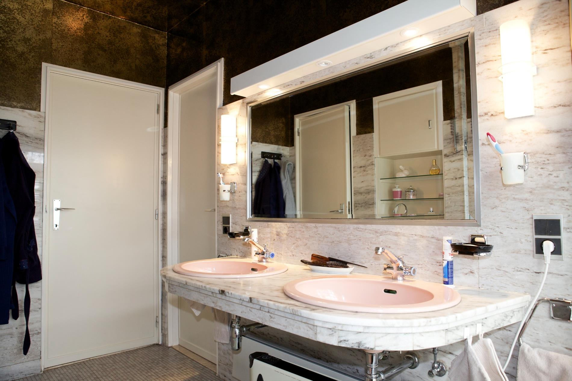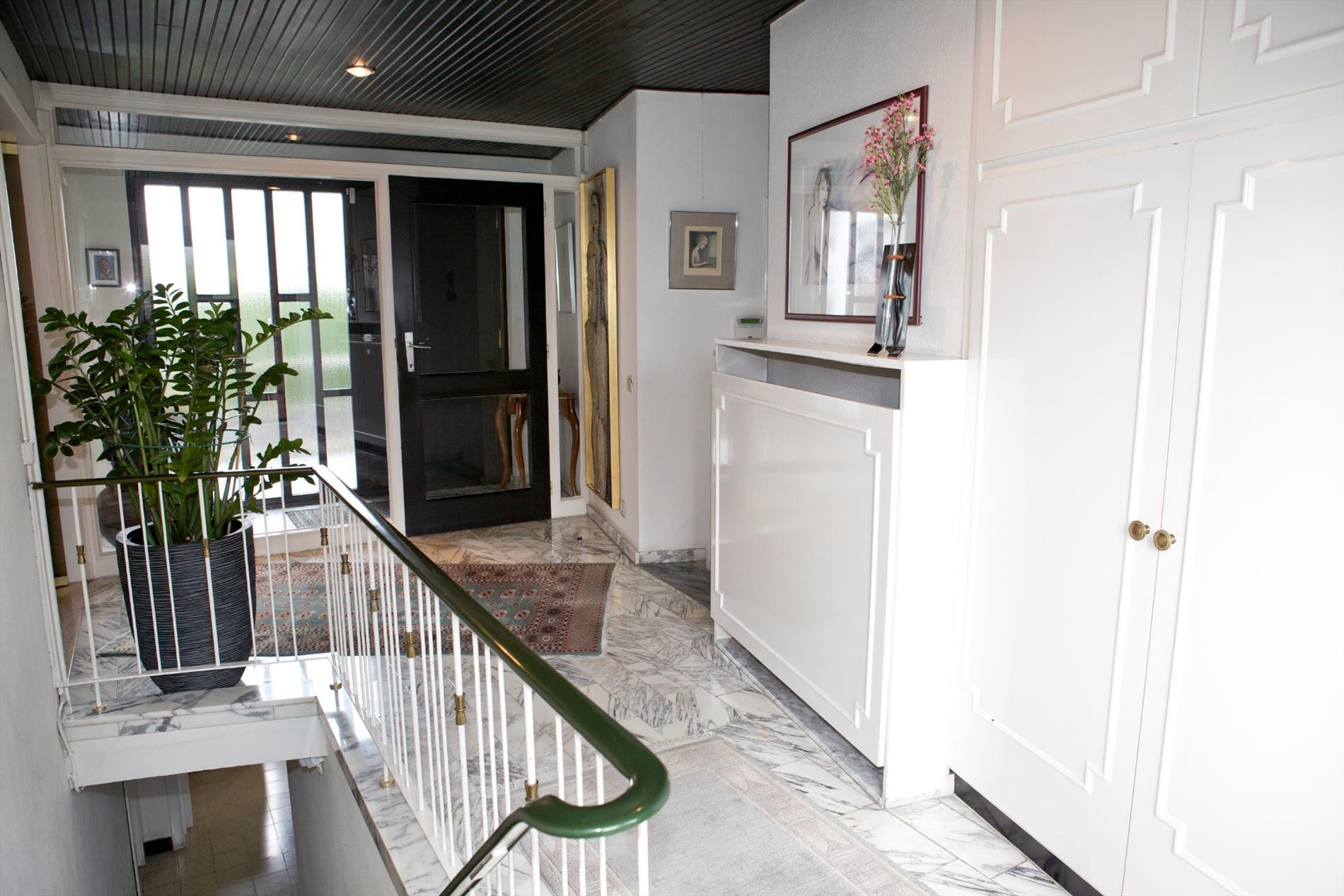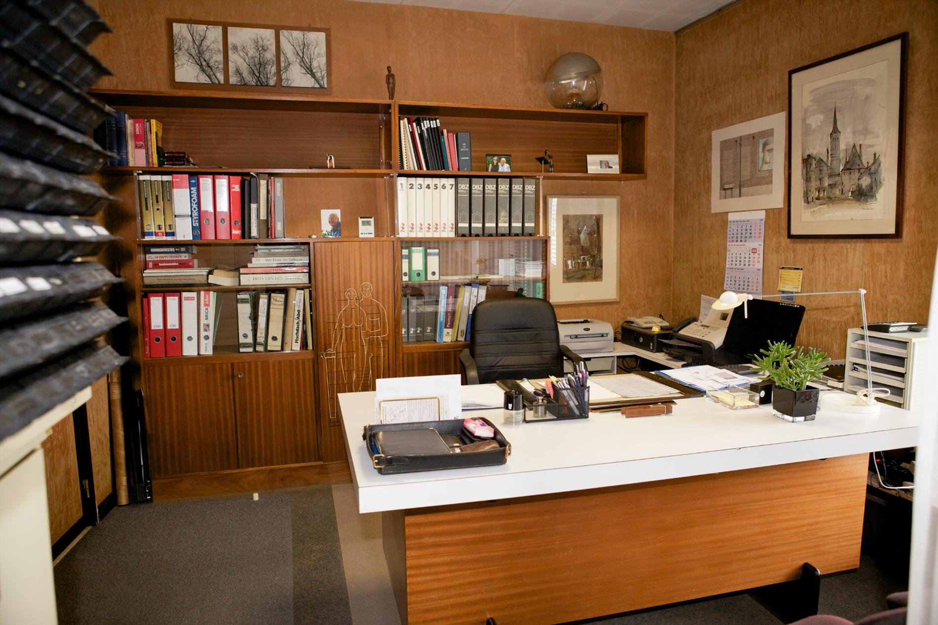 a) gelijkvloers: * met privé-gedeelte voorzien van 1ste en 2de inkomhal (één windvrij) met ingemaakte vestiairekasten en lave-mains (marmeren vloer * plafond + inbouwspotjes) en marmeren keldertrap, toilet met wc + lavabo, ruime en gezellige woonkamer met salon + sierschouw-openhaard (in rustiek metselwerk) en aanbouw-wandkasten (alles staat vast en werd ontworpen door Arch. Devos) * aansluitende eetplaats en bar, groot zonneterras (betegeld) + zonnige & intieme achtertuin, keuken voorzien van U-vormige keukenblok + koelkast, kookfornuis, dampkap, 2 inox spoelbakken en vaatwasmachine, nachthal, 2 grote en 2 kleine slaapkamers (elk met kast + ingebouwde lavabo), badkamer met marmeren toilettafel + 2 ingebouwde lavabo’s, ligbad en ingemaakte kasten (wanden bezet met marmer * marmeren mozaiekvloer), * praktijkgedeelte voorzien van aparte inkomhal + kast (+ tellers van water, aardgas en elektriciteit), tekenaarsbureau en bureau (+ deur naar privé);