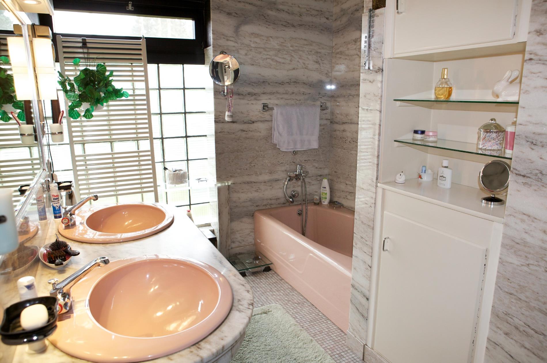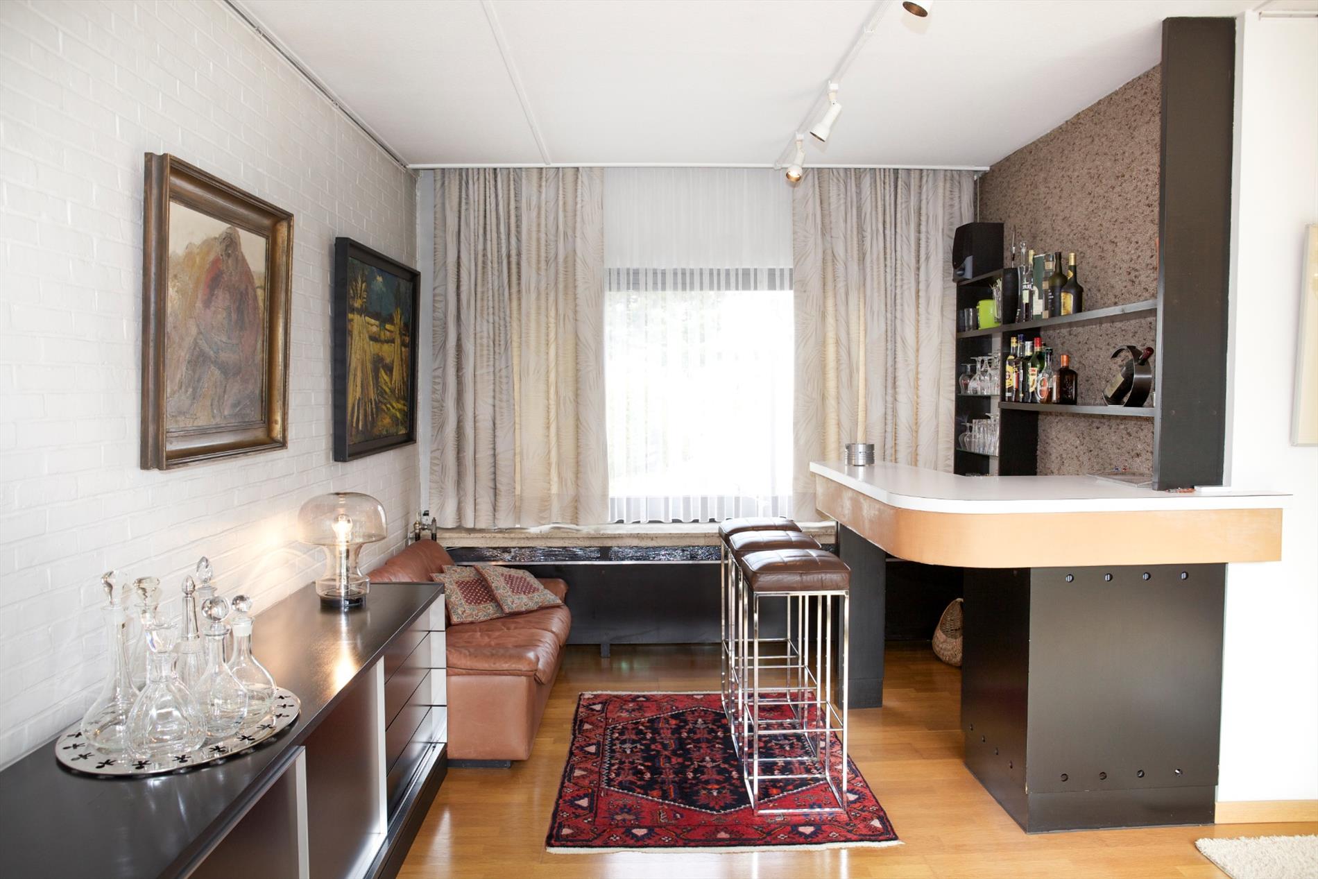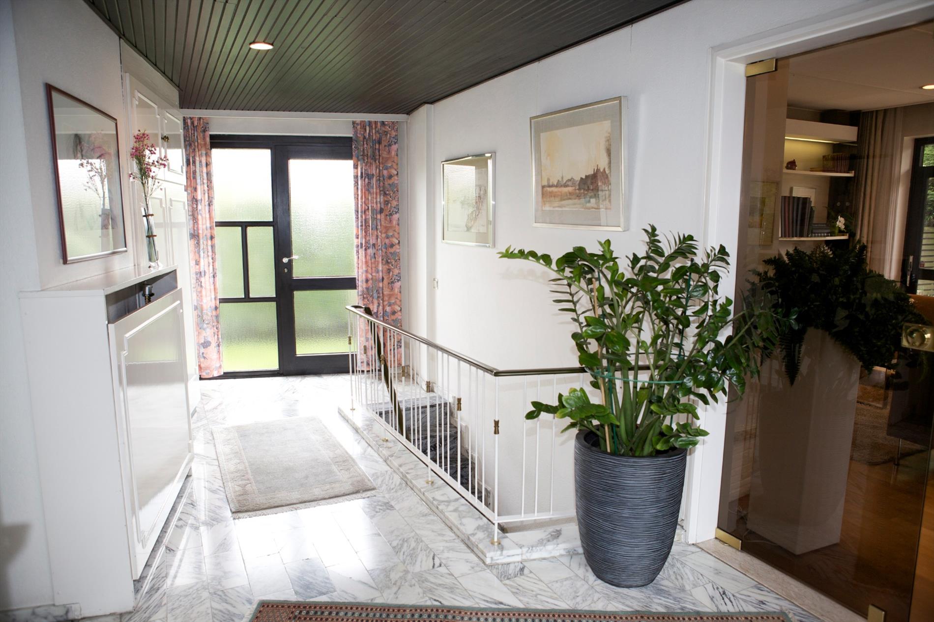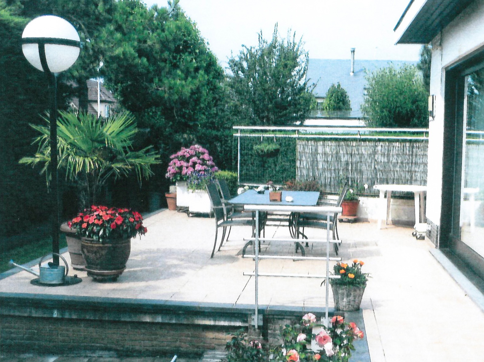 a) gelijkvloers: * met privé-gedeelte voorzien van 1ste en 2de inkomhal (één windvrij) met ingemaakte vestiairekasten en lave-mains (marmeren vloer * plafond + inbouwspotjes) en marmeren keldertrap, toilet met wc + lavabo, ruime en gezellige woonkamer met salon + sierschouw-openhaard (in rustiek metselwerk) en aanbouw-wandkasten (alles staat vast en werd ontworpen door Arch. Devos) * aansluitende eetplaats en bar, groot zonneterras (betegeld) + zonnige & intieme achtertuin, keuken voorzien van U-vormige keukenblok + koelkast, kookfornuis, dampkap, 2 inox spoelbakken en vaatwasmachine, nachthal, 2 grote en 2 kleine slaapkamers (elk met kast + ingebouwde lavabo), badkamer met marmeren toilettafel + 2 ingebouwde lavabo’s, ligbad en ingemaakte kasten (wanden bezet met marmer * marmeren mozaiekvloer), * praktijkgedeelte voorzien van aparte inkomhal + kast (+ tellers van water, aardgas en elektriciteit), tekenaarsbureau en bureau (+ deur naar privé);