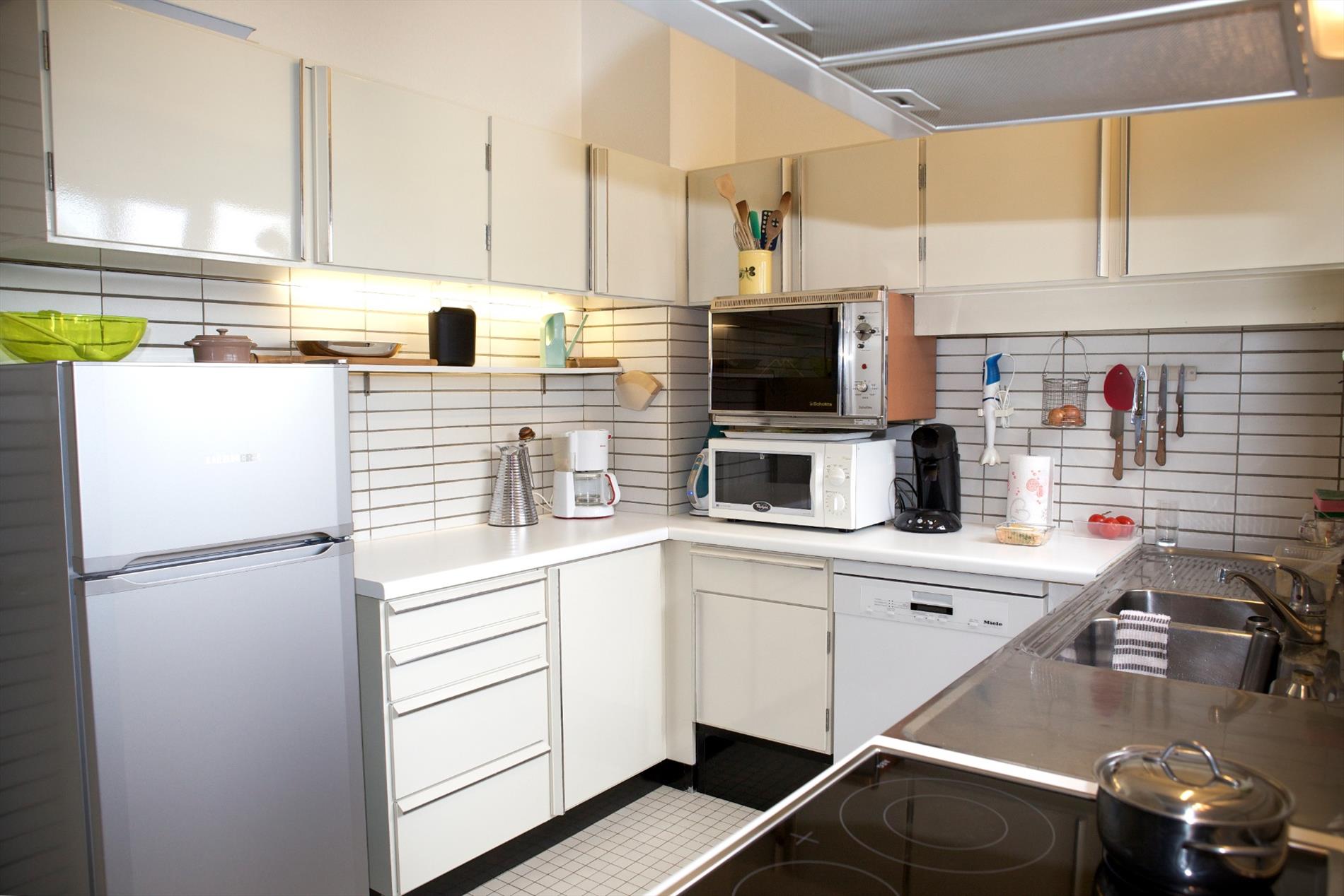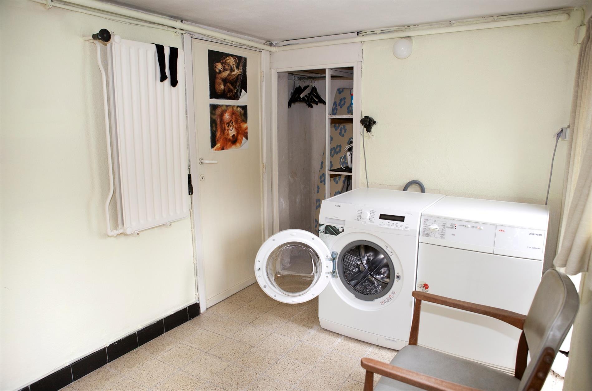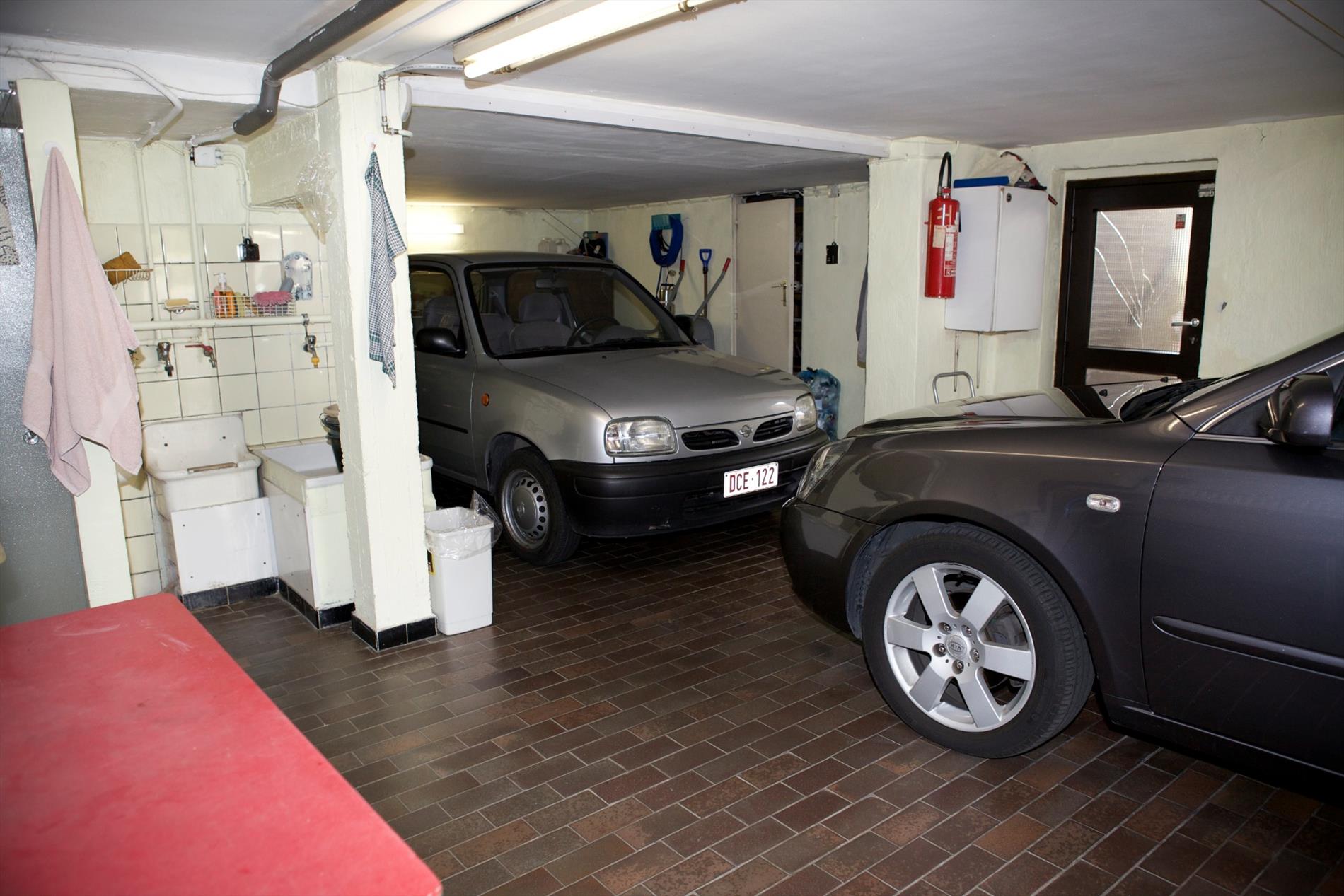 b) sous-terrain: overloop, wasplaats met aansluiting voor was- en droogautomaat, stookplaats met aardgas-generator en aparte warmwater-geiser, wijnkelder, grote garage (voor 2 wagens) met afgietbak, en douche (deur naar tuin), archiefruimte, berging en oprit-parking.