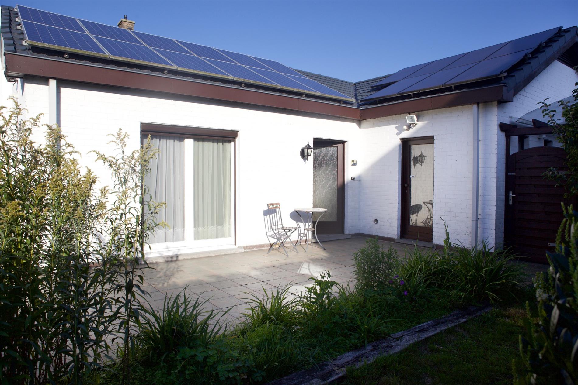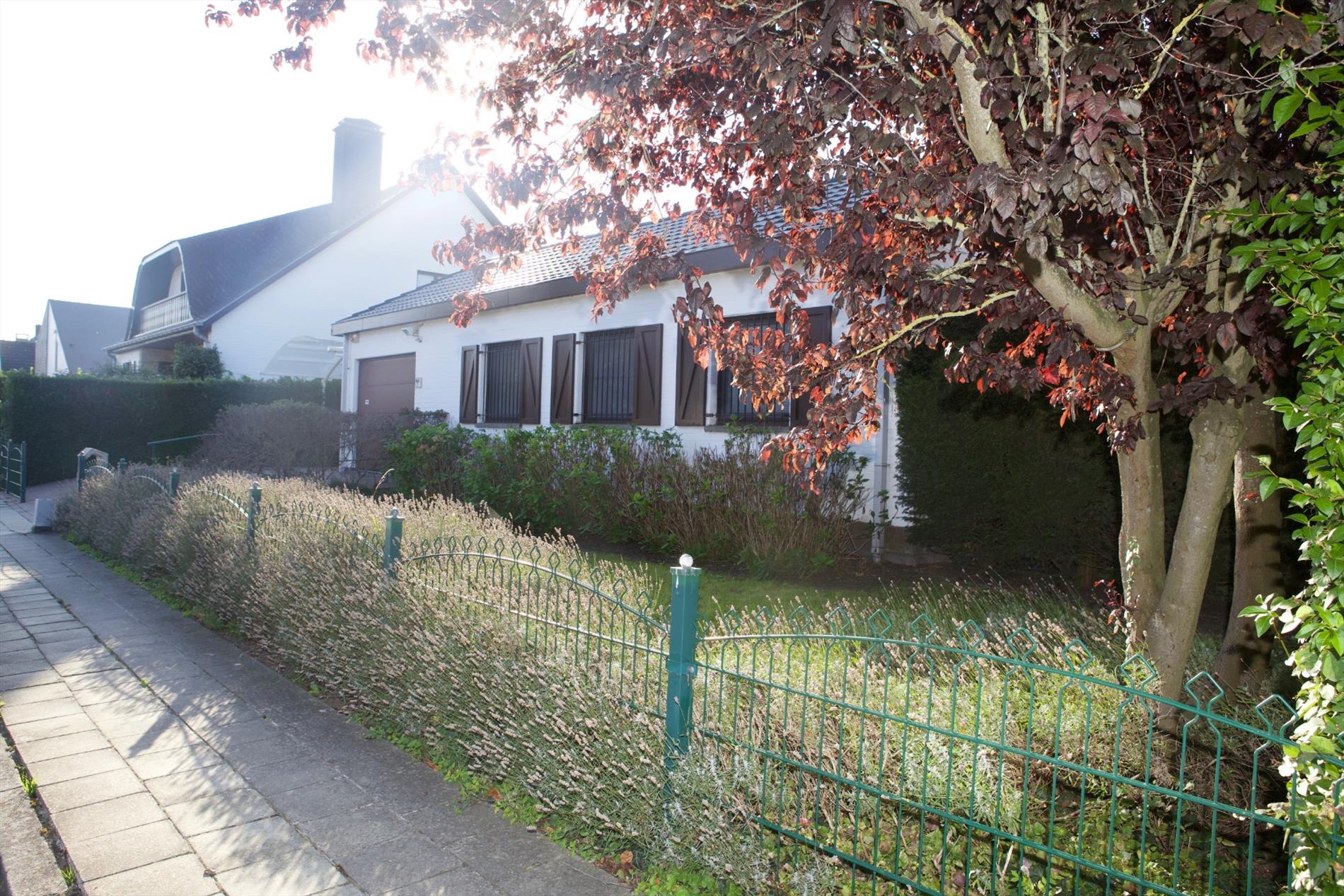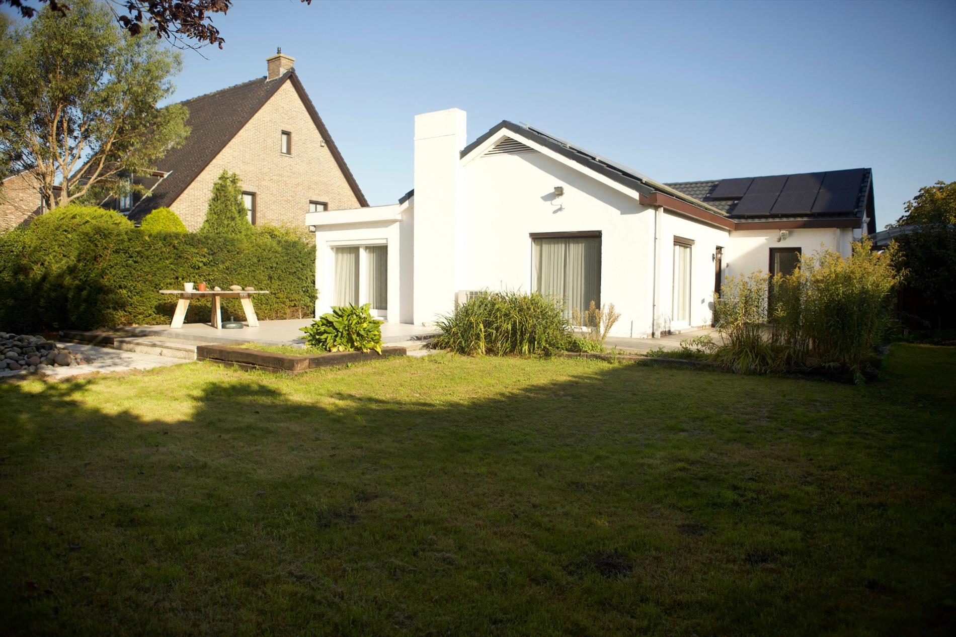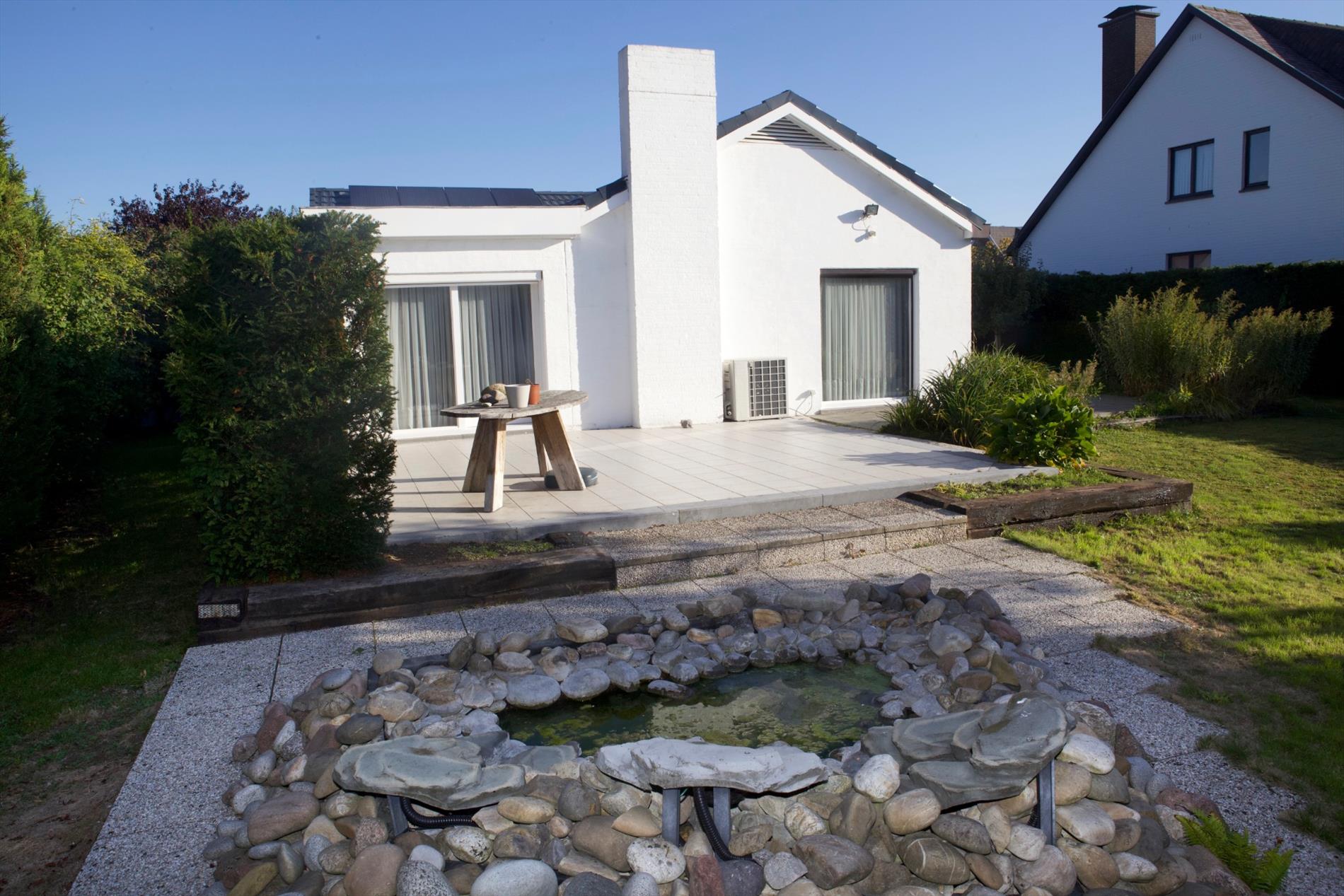 Welgelegen alleenstaande “bungalow-woning” opgetrokken in 1977, op een perceel bouwgrond van 21,40 m. op 32,25 m. Verzorgde buitengevel, uitgevoerd in een paramentmetselwerk van wit-geschilderd baksteen. Deur- en vensterdorpels in harde blauwsteen. Buitenschrijnwerk in Merantihout, voorzien van dubbele beglazing (+ zonnescreens in de living, ramen a/d straatkant met veiligheidstralies). Vernieuwde hard-zadeldaken (35°), bedekt met zwarte aluminium dakplaten, belegd met 26 zonnepanelen. De zoldervloerplaat werd goed geïsoleerd. Stevige kapconstructie, uitgevoerd in Oregonhout (onderdak in menuiserite). Nieuwe zinken dakgoten. Sierlijke binnendeuren (Porta eik). Nieuwe keramieke tegelvloeren in de meeste woonvertrekken, badkamer en w.c. Laminaat-parket in de slaapkamers. De woning heeft een bruikbare vloeroppervlakte van 140,36 m² en een beschermd volume van 421,08 m³. Nieuw aangelegde oprit voor 2 wagens, belegd met betonnen klinkertjes en carport in wit-gelakt metaalconstructie + gebogen dak van plexiglas. Zéér zonnige achtertuin + 2 visvijvertjes, en met 2 grote keramisch betegelde zonneterrassen. Voortuintje, van het voetpad afgezet d.m.v. Bekaertdraad. Voorzien van stads- & regenwater, elektriciteit (dag-, nacht- en stiluur- tarief), teledistributie, internet, telefoon, alarmsysteem (Mylle * camerabewaking), elektrische verwarming + warmwaterdistributie (d.m.v. accumulatie-kachels en convectoren) en riolering. Momenteel verhuurd en vrij op 15/12/2020 (huidige huur: € 750/m).