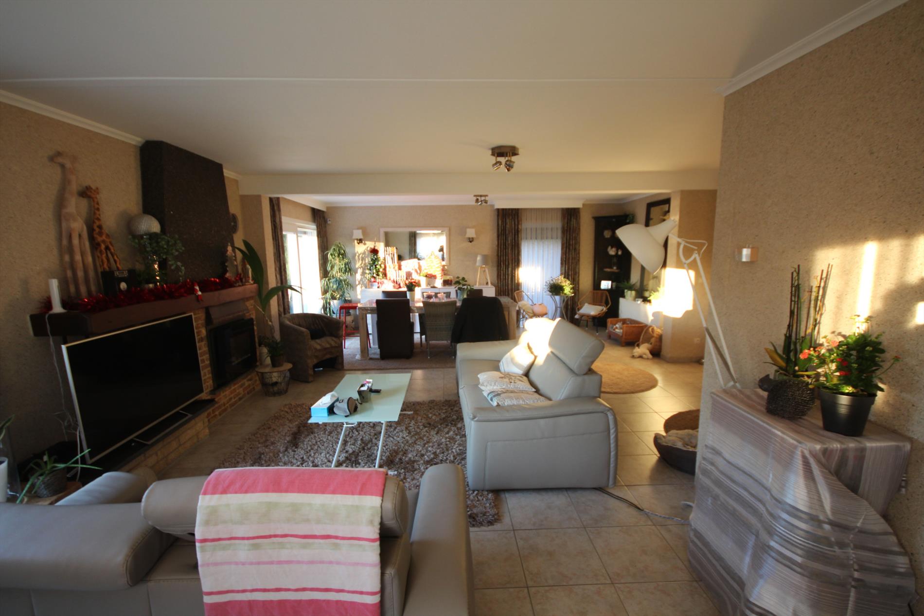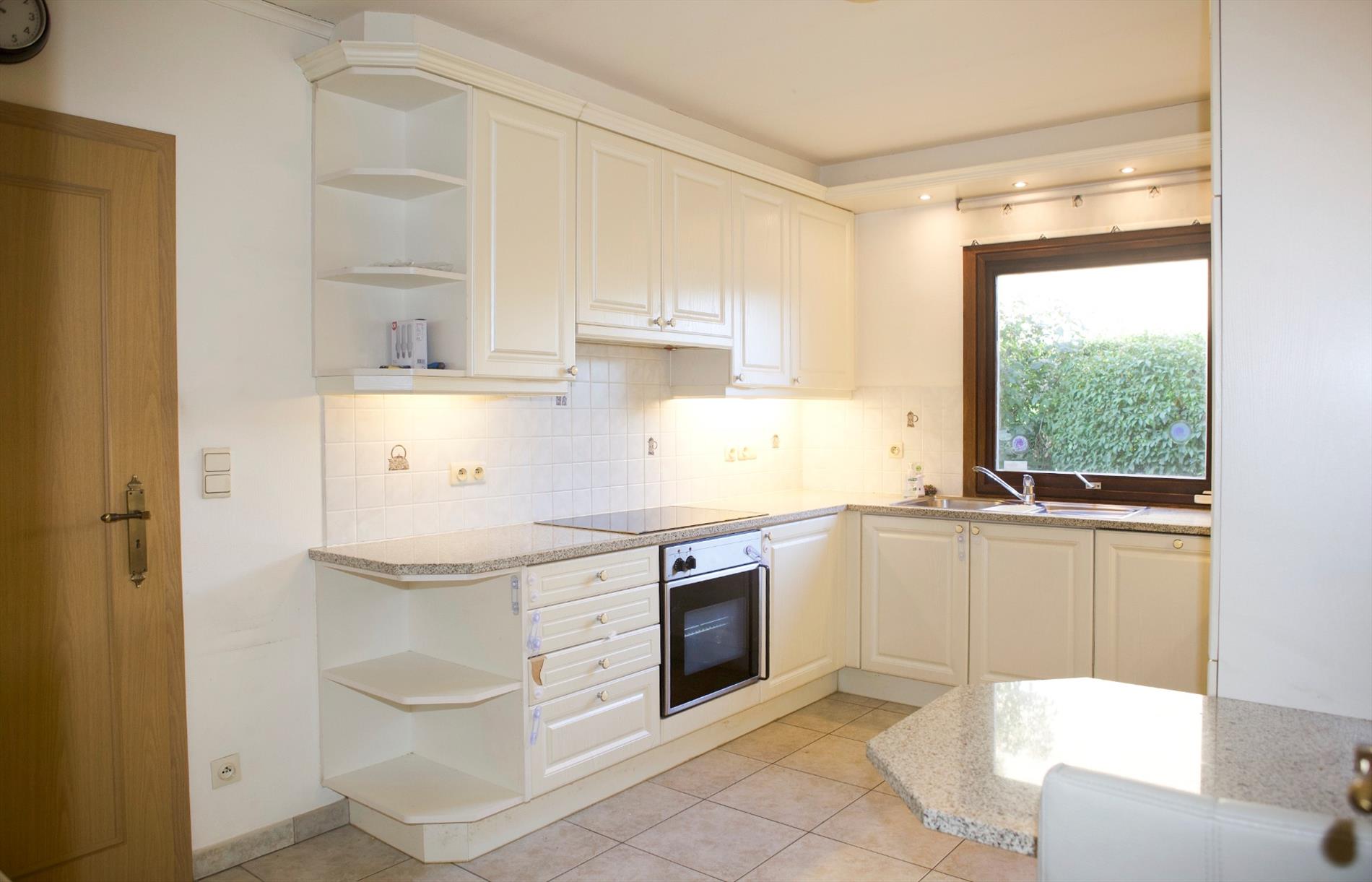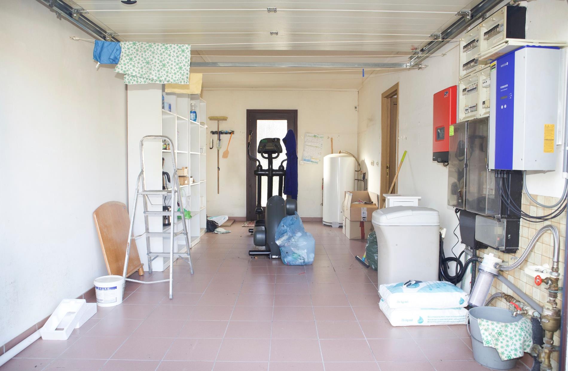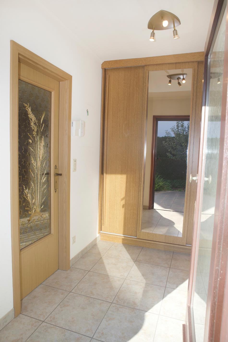Inkomhal + ingemaakte vestiairekast (+ spiegel-schuifdeur),- ruime & luchtige L-vormige living (48 m²) met sierschouw in rustiek metselwerk, getooid met eiken tablet + inbouwcassette-openhaard (elektrisch),- ruime en nieuw-ingerichte keuken (4,15 x 2,90) met U-vormige keukenblok (onder- en bovenkasten in witte meubelplaat + aanbouwtafel (+ granieten tabletten), en ingebouwde inductie kookplaat, dampkap, warmeluchtoven, vaatwasautomaat, dubbele inox afwasbak, frigo, en diepvriezer (mooie faience),- nachthal + ingemaakte kast,- grote slaapkamer (5,34 x 2,92),- 2de slaapkamer (3,50 x 2,92),- nieuw-ingerichte badkamer met bubbelbad + glazen douchewand, toilet-meubel + ingebouwde lavabo, en handdoekradiator (marmerachtige faience),- sas + toilet met w.c. & lavabo,- garage (6,08 x 2,96) met sectionale poort, elektriciteit- en stadswatertellers + 2 zekeringskasten, waterverzachter, omvormer SMA Sunny Boy + KACO POWADOR (voor de zonnepanelen), warmwaterboiler, en aansluiting voor was- en droogautomaat en toegang naar de kruipkelder.