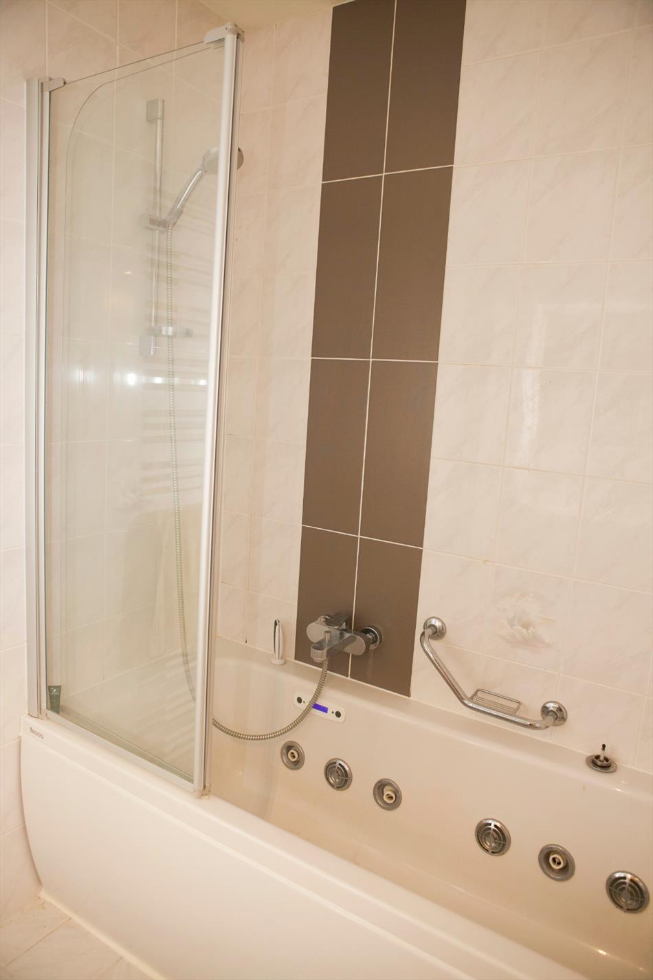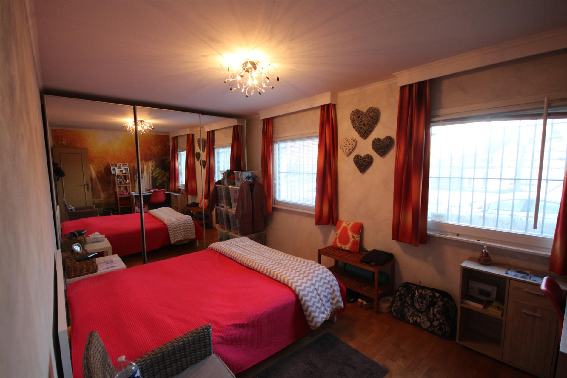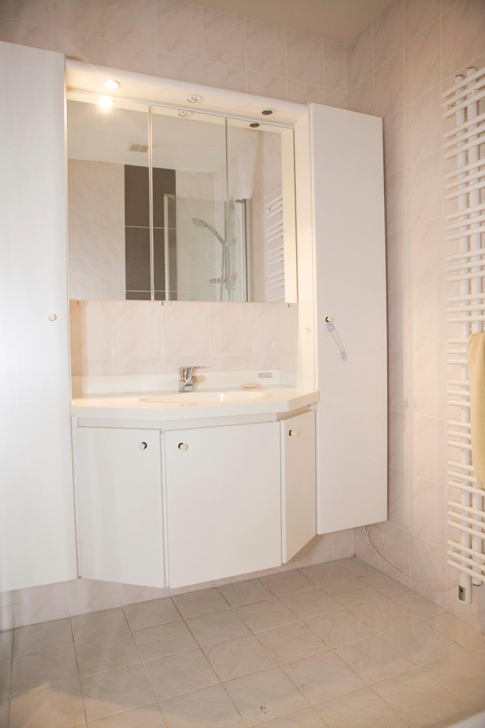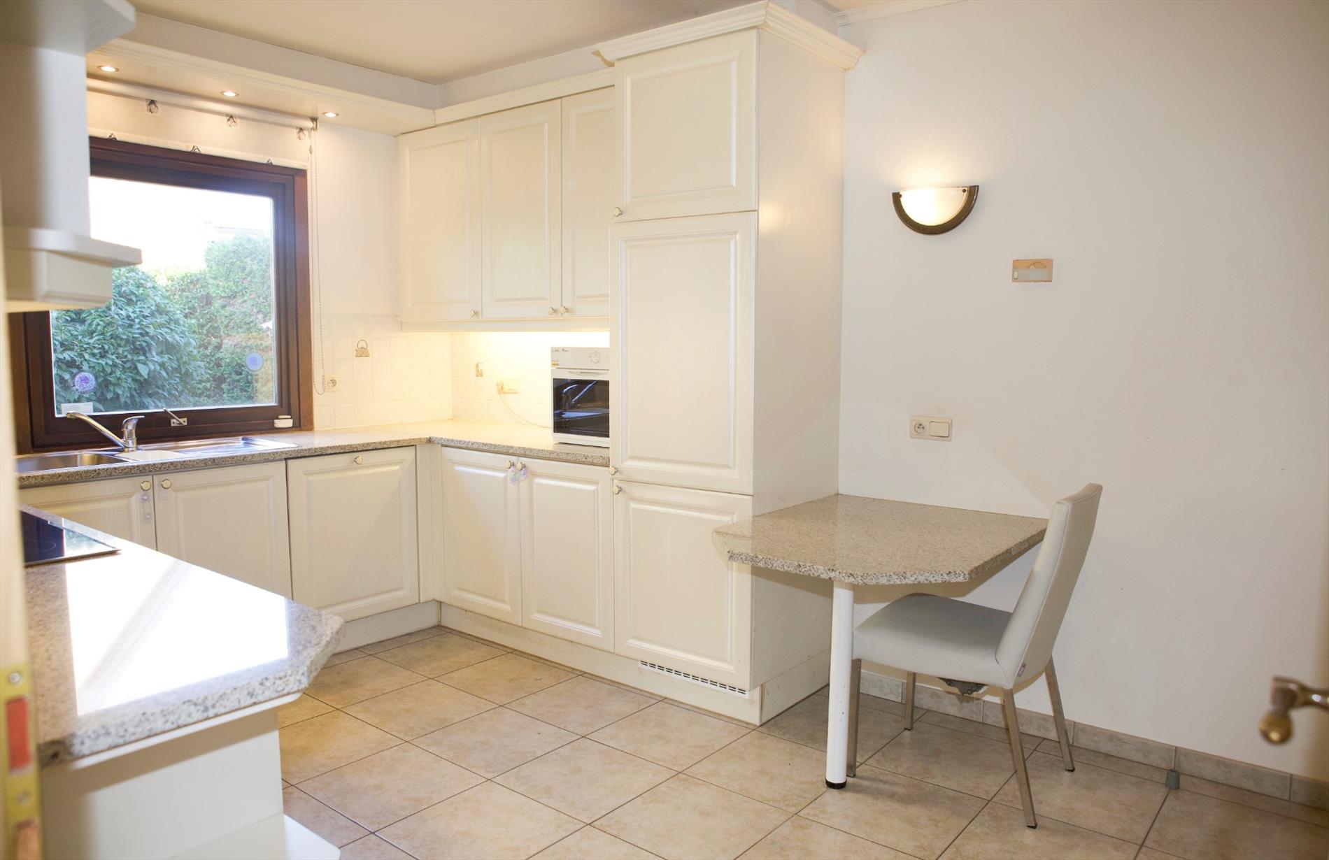 Inkomhal + ingemaakte vestiairekast (+ spiegel-schuifdeur),- ruime & luchtige L-vormige living (48 m²) met sierschouw in rustiek metselwerk, getooid met eiken tablet + inbouwcassette-openhaard (elektrisch),- ruime en nieuw-ingerichte keuken (4,15 x 2,90) met U-vormige keukenblok (onder- en bovenkasten in witte meubelplaat + aanbouwtafel (+ granieten tabletten), en ingebouwde inductie kookplaat, dampkap, warmeluchtoven, vaatwasautomaat, dubbele inox afwasbak, frigo, en diepvriezer (mooie faience),- nachthal + ingemaakte kast,- grote slaapkamer (5,34 x 2,92),- 2de slaapkamer (3,50 x 2,92),- nieuw-ingerichte badkamer met bubbelbad + glazen douchewand, toilet-meubel + ingebouwde lavabo, en handdoekradiator (marmerachtige faience),- sas + toilet met w.c. & lavabo,- garage (6,08 x 2,96) met sectionale poort, elektriciteit- en stadswatertellers + 2 zekeringskasten, waterverzachter, omvormer SMA Sunny Boy + KACO POWADOR (voor de zonnepanelen), warmwaterboiler, en aansluiting voor was- en droogautomaat en toegang naar de kruipkelder.