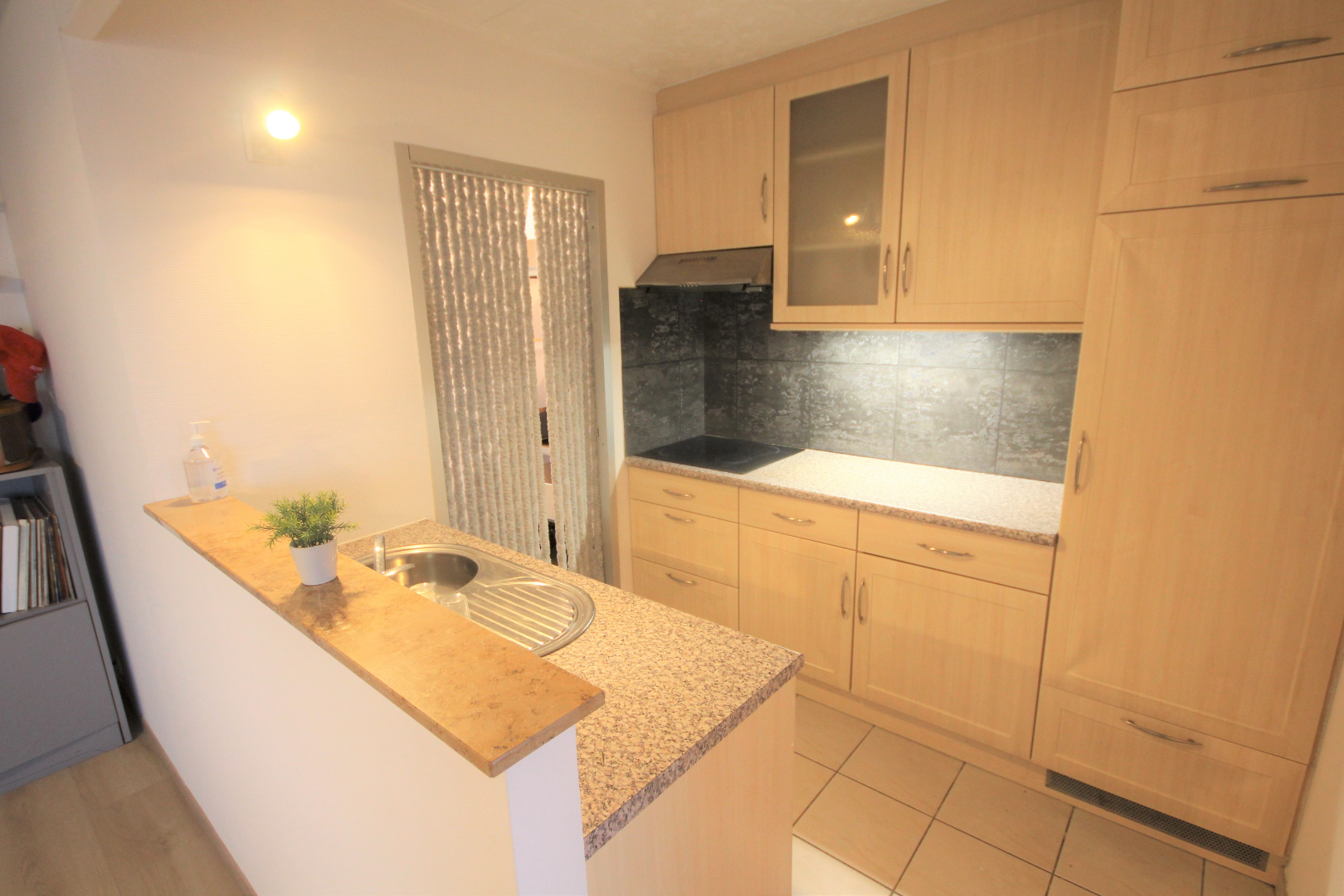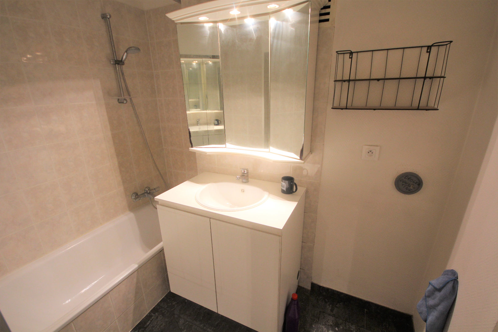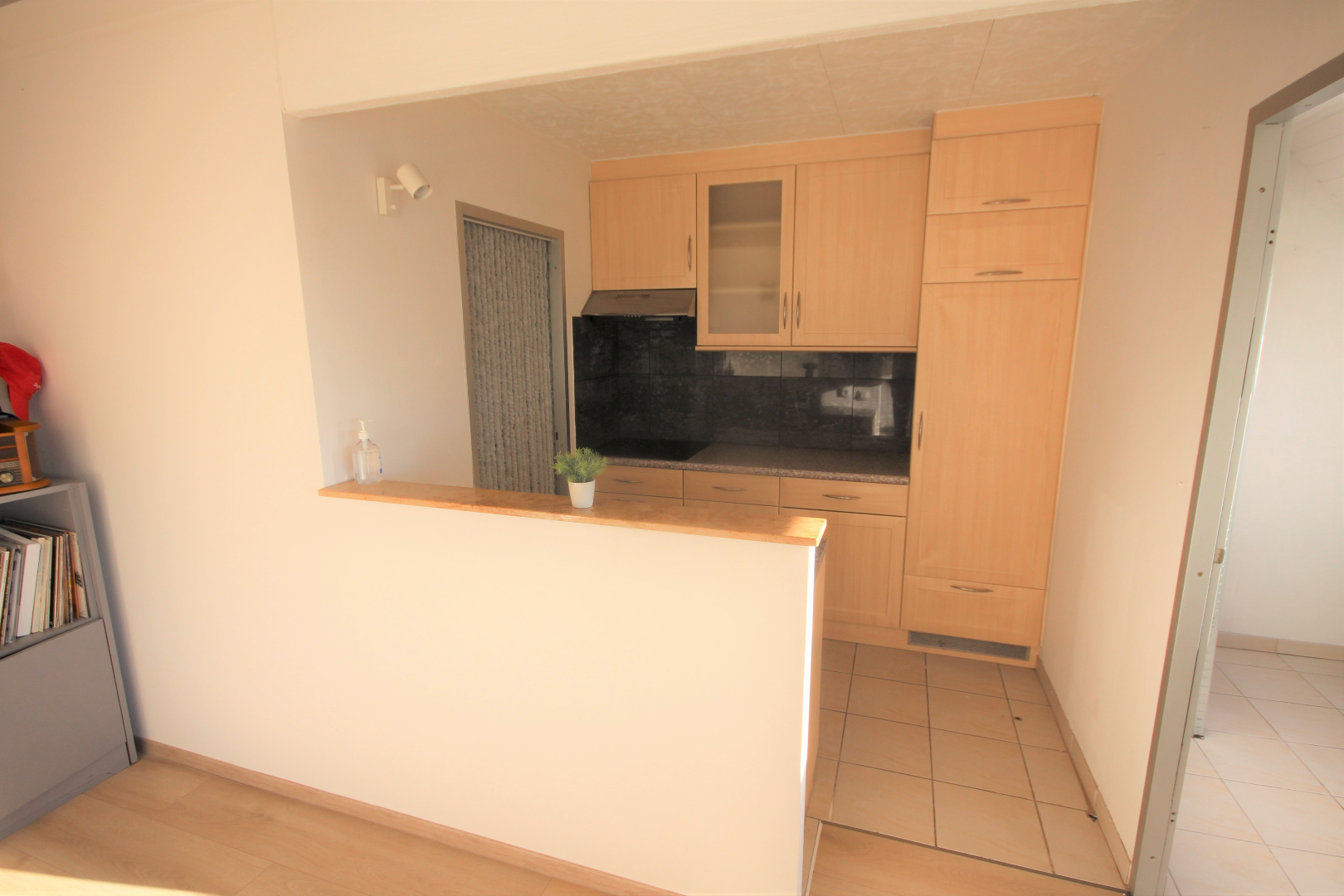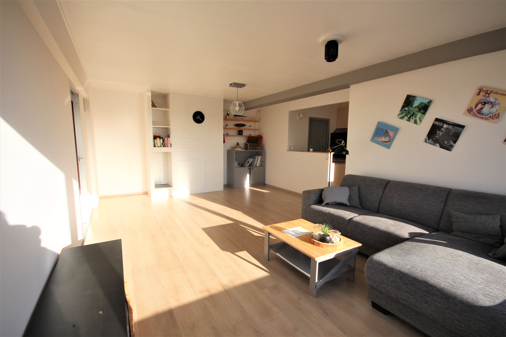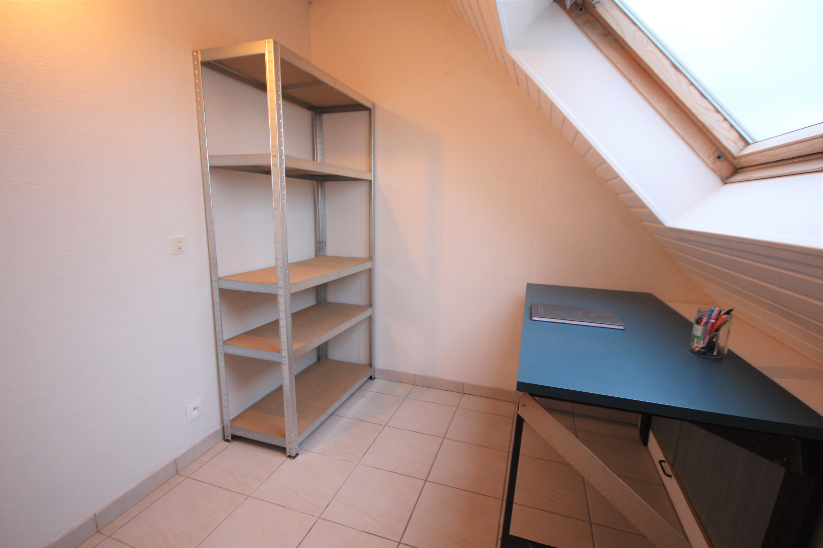 inkomhall + parlofoon en nieuwe zekeringskast,- living (26,50 m²) met sierschouw-open haard,- open-keuken (2,33 x 2,32) met keukenblok (boven- & onderkasten in lichte eik) + ingebouwde koelkast, nieuwe ceramische kookplaat en dampkap ; * 2de keukenblok met onderkasten + inox afwasbak,- berging met lichtkoepel en aansluiting voor een vaatwasmachine,- kleine slaapkamer (2,30 x 1,86) met ingemaakte kasten + veluxraam,- badkamer met toiletmeubel + ingebouwde lavabo & spiegelkkast, ligbad, en wasmachine-aansluiting (marmerachtige faience),- 2de slaapkamer (3,73 x 3,17),- 3de slaapkamer (3,73 x 2,55),- en toilet met w.c. en ingebouwde kast + elektrische boiler.