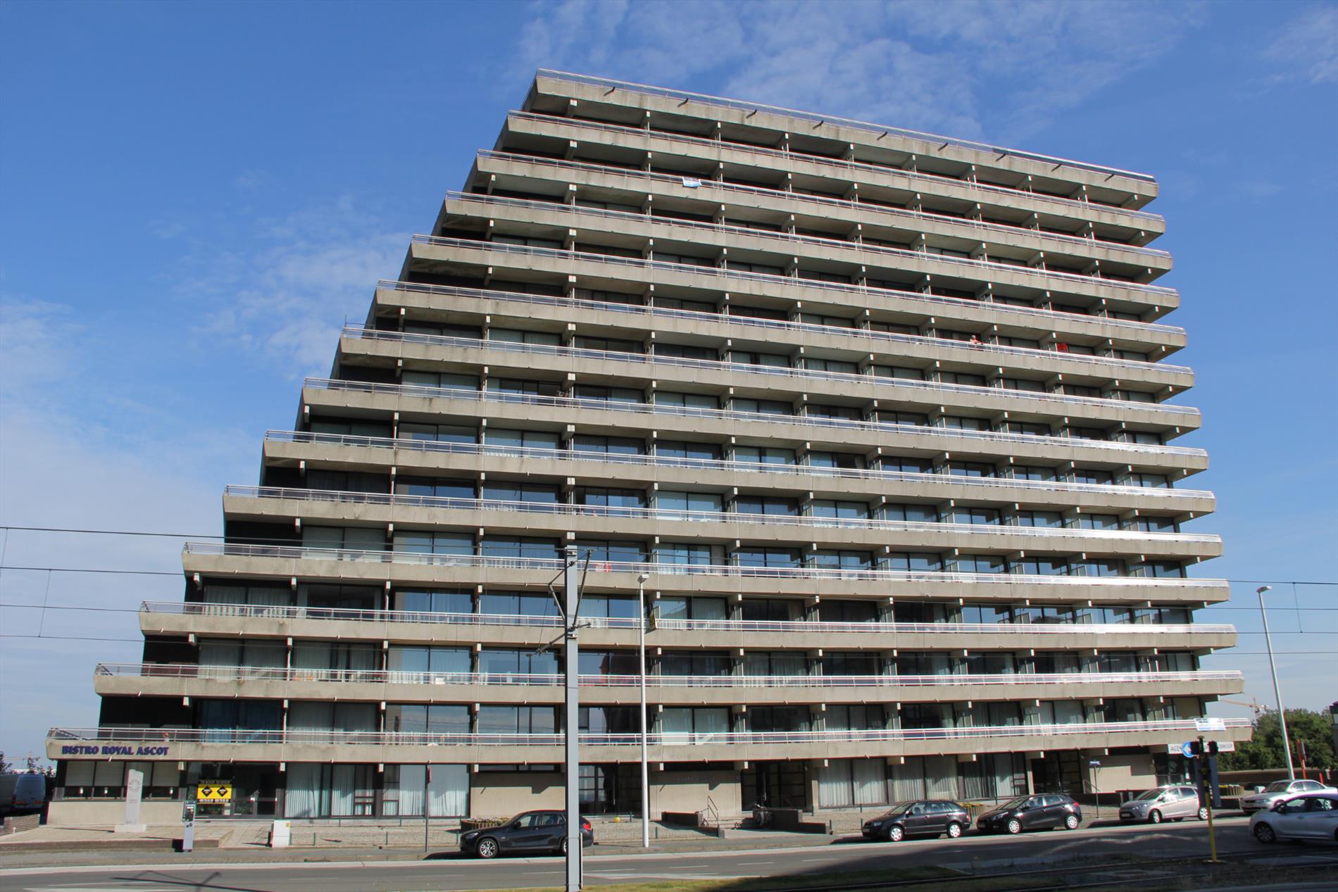 De residentie ‘Royal Ascot’ is een schitterd en vooraanstaand appartementsgebouw, stevig en op traditionele wijze opgetrokken in 1981, op een perceel bouwgrond van 3.936 m², onderverdeeld in 4 aparte secties. De studio heeft een bruikbare vloeroppervlakte van 41,40 m² (+ een zonneterras van 7 m²) en een beschermd volume van 114,26 m². Vanuit de living en vanop het terras heeft men een prachtig zicht op zee en strand. De sectie II van de Residentie Royal Ascot (alwaar de studio gelegen is op de 7de verdieping) begrijpt : a) kelderverdieping: met privatieve kelders en autostandplaatsen ; * b) gelijkvloers: inkom- & tussenhal + kast met brievenbussen, liftkoker met 2 liften, trapzaal met trap, fietsenbergplaats, 4 studio’s en 1 appartement ; * c) 13 verdiepingen: met telkens studio’s en appartementen. Licht hellend plat dak, belegd met roofing. Novylon vloerbekleding (imitatie oude eik) in de living en inkomhal. Ceramieke tegelvloeren in de keuken en de badkamer. De studio is voorzien van parlofoon, stadswater, elektriciteit, teledistributie, telefoon, aardgas en van een collectieve centrale verwarmings- en warmwaterdistributie (met generator op aardgas). Deze studio is onmiddellijk vrij van gebruik (tot voor kort en gedurende 13 jaar was de studio verhuurd à € 475/m.).
