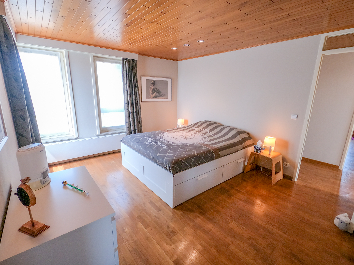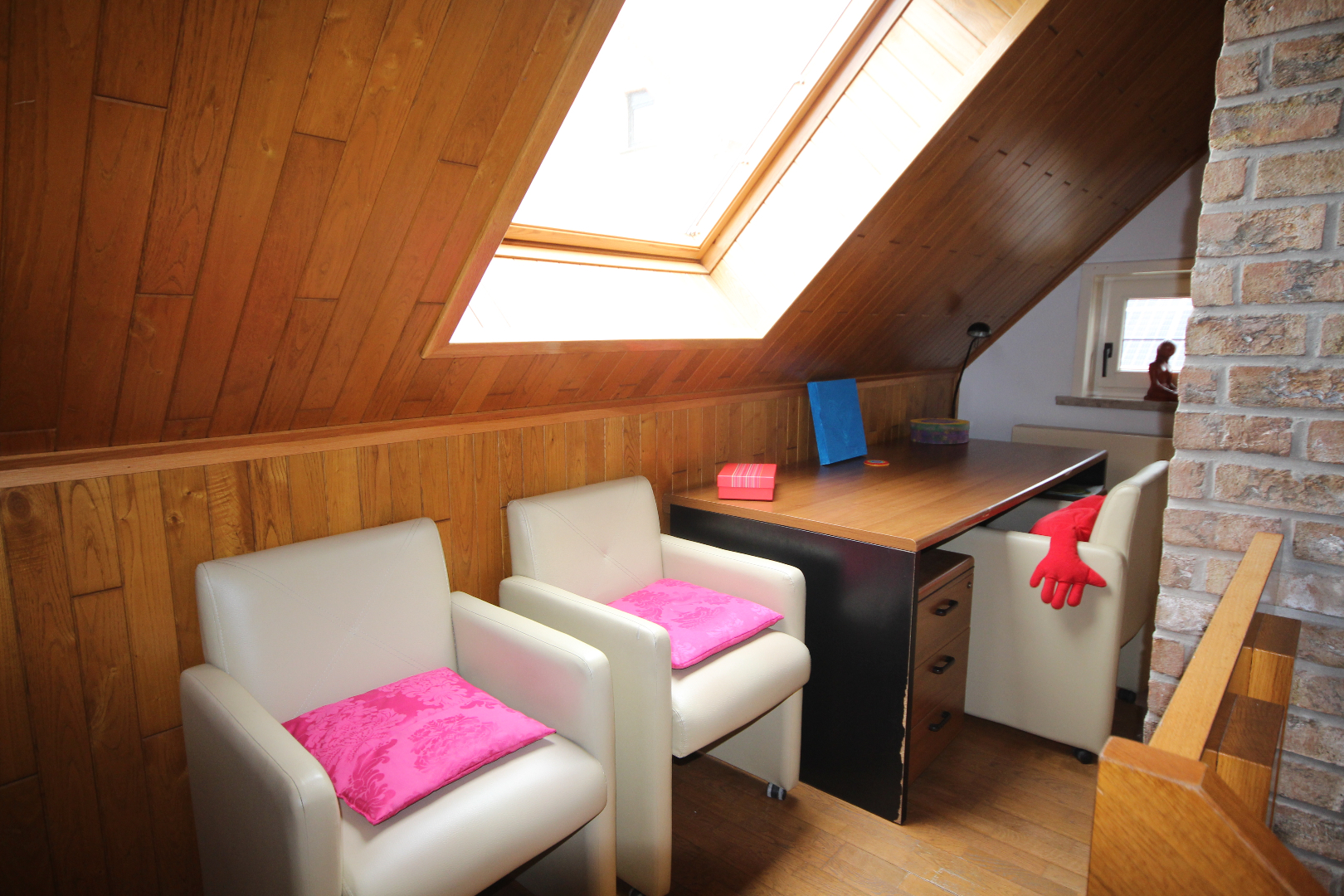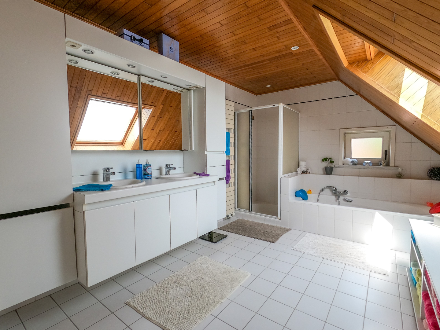 Verdieping: overloop,- nachtpatio (11,22 m²) met bureel & hobbyruimte + ingemaakte kasten & velux,- gang + zolderluik,- master-bedroom (4,60 x 3,50),- 2de slaapkamer (12,05 m²),- badkamer (4,40 x 2,80) met ligbad, douche, toiletmeubel + 2 ingebouwde lavabo’s, w.c., en velux,- 3de slaapkamer (3,50 x 2,80) + ingemaakte kasten + velux,- en bergzolder (geïsoleerde vloer) ;