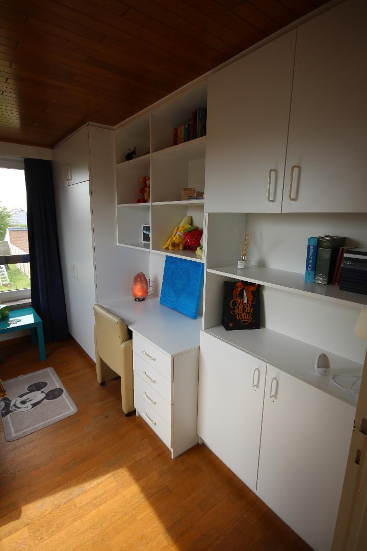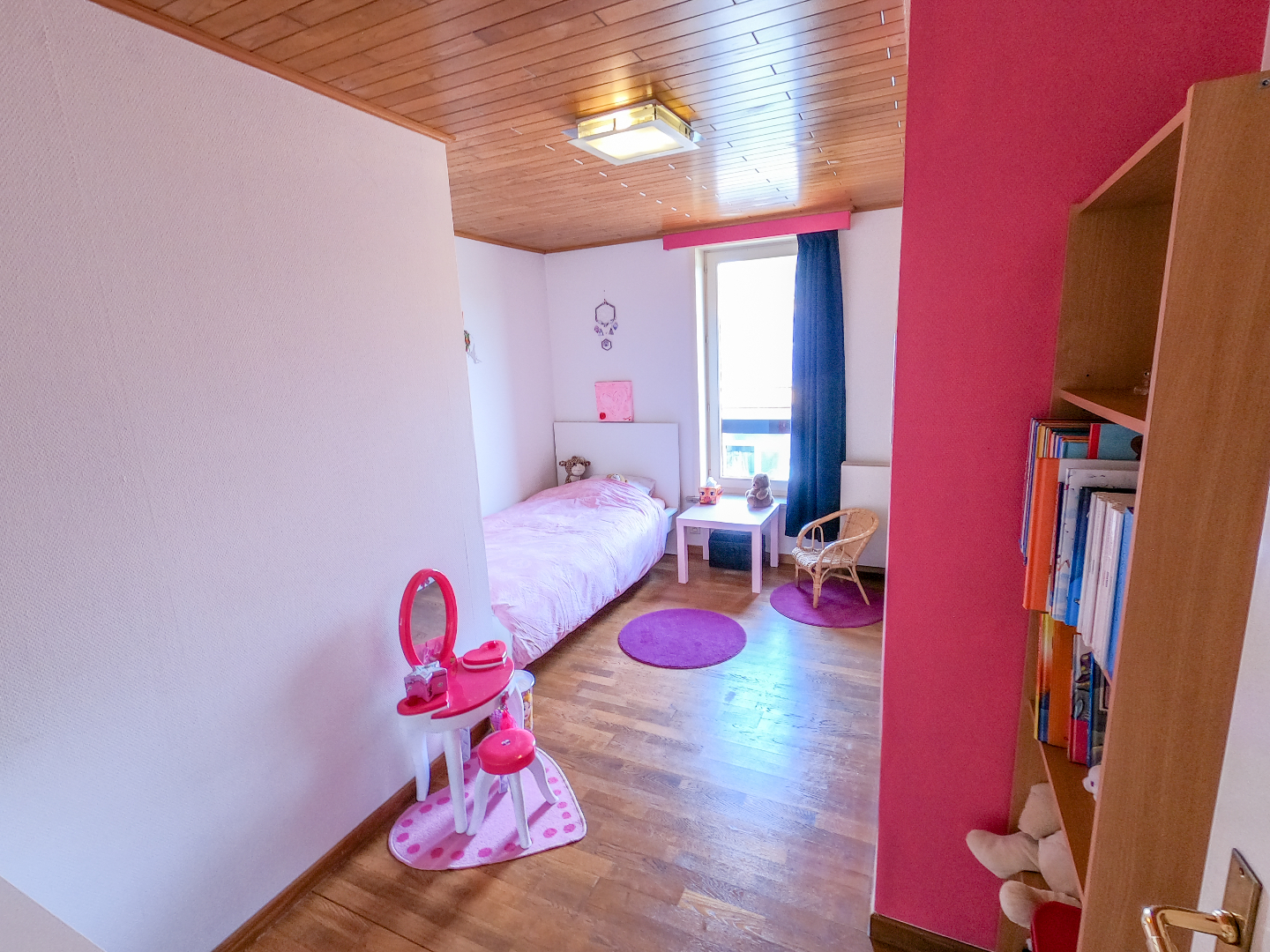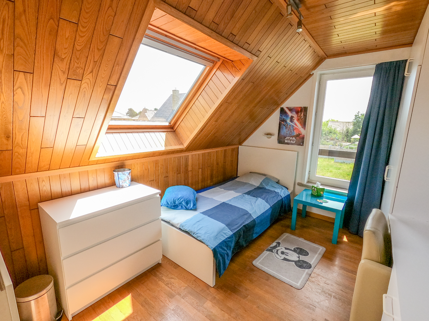 Verdieping: overloop,- nachtpatio (11,22 m²) met bureel & hobbyruimte + ingemaakte kasten & velux,- gang + zolderluik,- master-bedroom (4,60 x 3,50),- 2de slaapkamer (12,05 m²),- badkamer (4,40 x 2,80) met ligbad, douche, toiletmeubel + 2 ingebouwde lavabo’s, w.c., en velux,- 3de slaapkamer (3,50 x 2,80) + ingemaakte kasten + velux,- en bergzolder (geïsoleerde vloer) ;