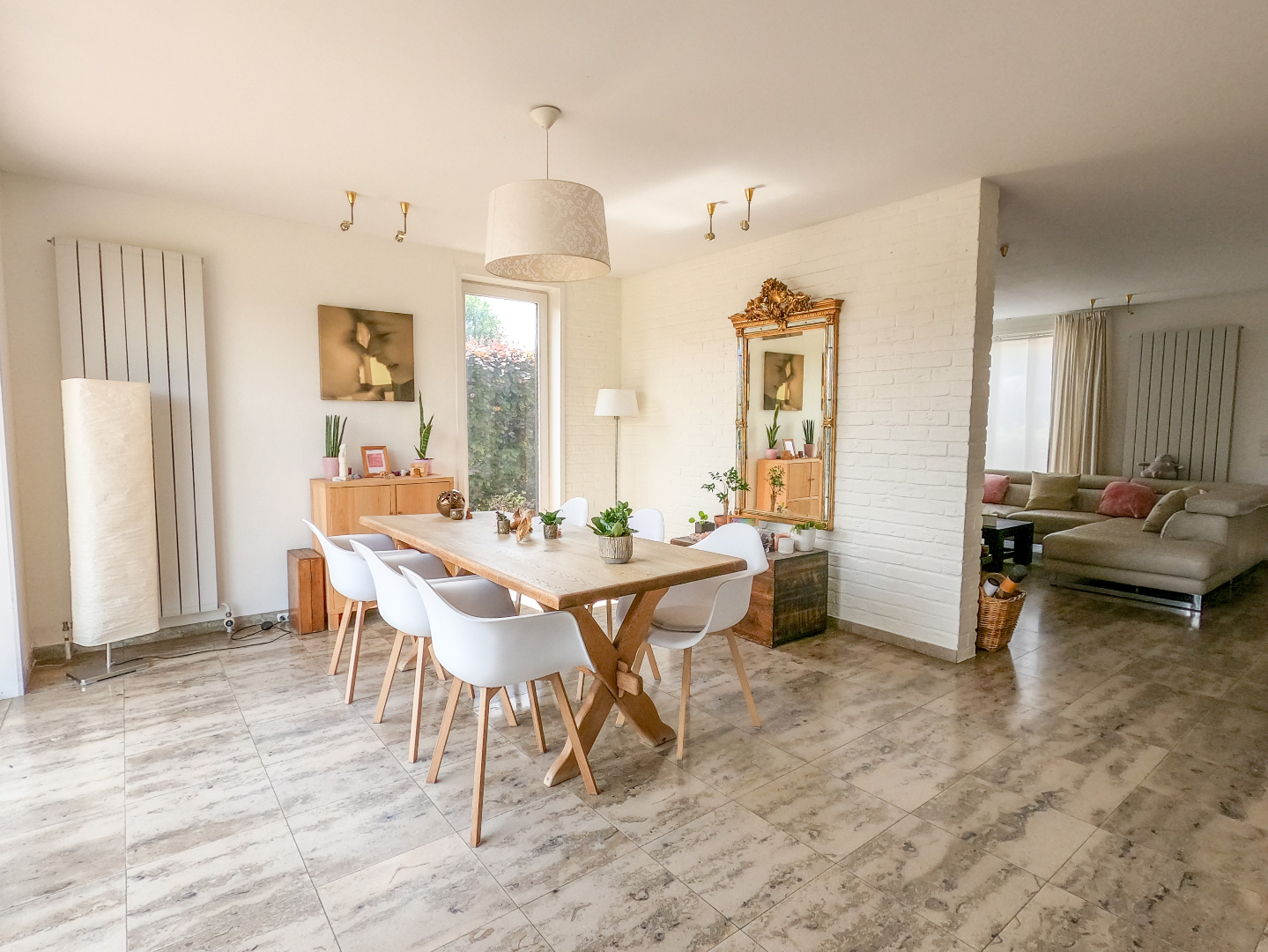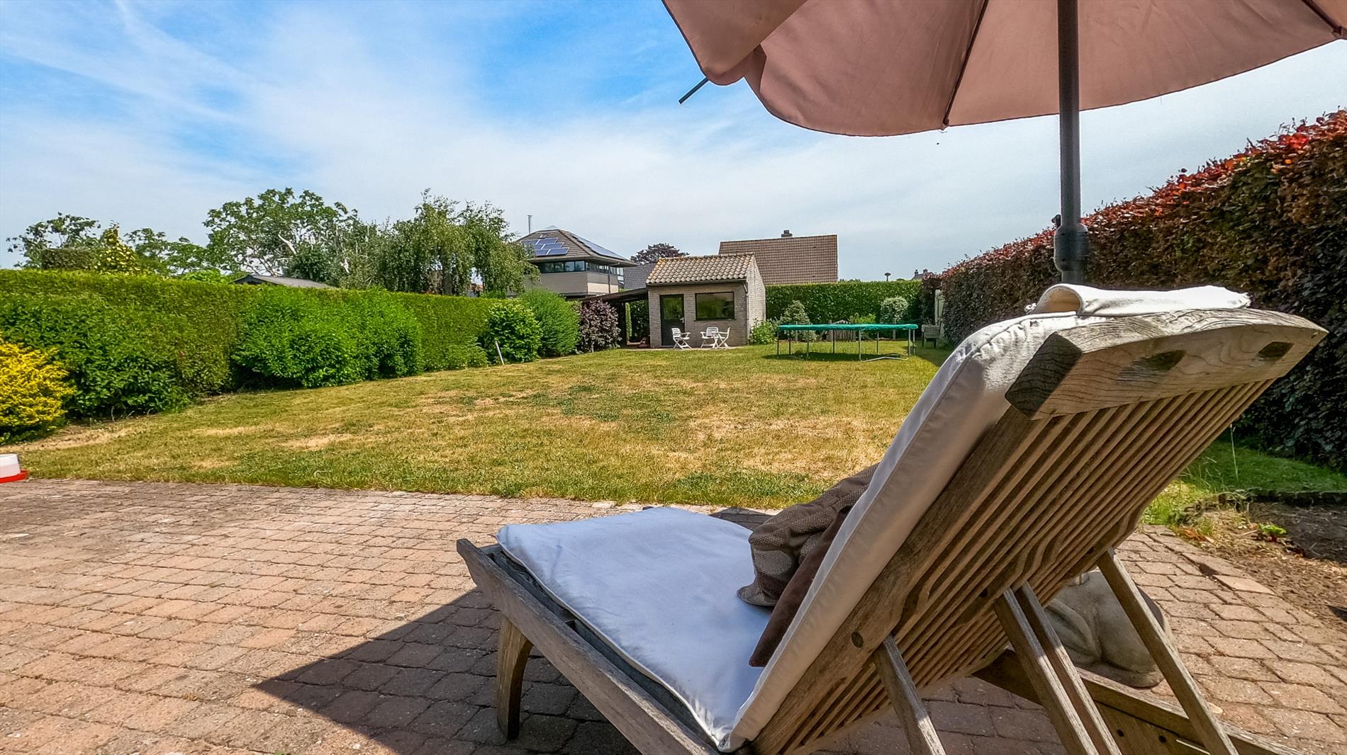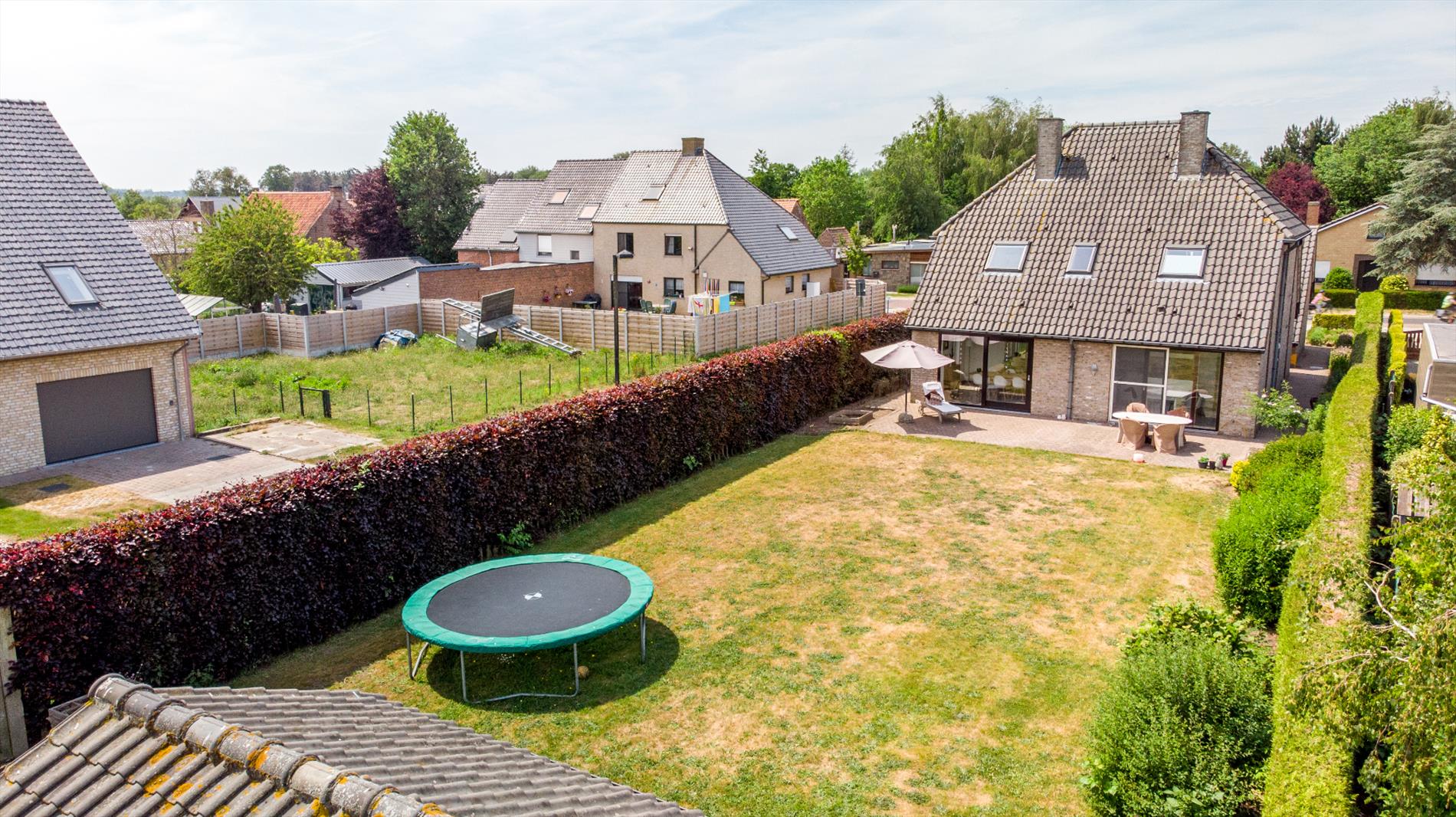 Lichtrijke villa met losstaande praktijkruimte (geschikt voor vrijberoep, of kangoeroewoning), rustig & landelijk gelegen nabij het centrum van Bekegem. Stevig en op traditionele wijze gebouwd in 1992, op een perceel bouwgrond van 981 m² met breedte van 16,05 m. en diepte: 62,20 m., met zuid-oostelijke oriëntatie. Voorzien van stevige funderingen + vloerplaat in gewapend beton, en betonnen gewelven op de verdieping. Verzorgde buitengevels in geel-genuanceerd gevelsteen. Deur- en vensterdorpels in harde blauwsteen. Verzorgd 4-vlakken-dak op het huis en zadeldak op het bijgebouw (praktijk), met stevige kapconstructie in oregon, belegd met bruine pannen, + onderdak in menuiserite + 5 veluxramen. De plafonds & schuine wanden op de verdieping zijn goed geïsoleerd. Zinken hanggoten en dito afleidingen. Dubbelwandige schouwpotten in terracotta. Buitenschrijnwerk in Merbau met blokkaders + dubbele beglazing. Binnendeuren in eik met bovenlichten + dubbele beglazing. Prachtige tegelvloeren in natuursteen op het gelijkvloers, en eiken parket op de verdieping. De meeste plafonds zijn voorzien van inbouwspotjes. Keuken & living met terrasschuiframen en tuinzicht. Bebouwde oppervlakte: 109,08 m² (huis), en 43,88 m² (praktijk). Bruikbare vloeroppervlakte: 195 m². Beschermd volume: 555 m³. Voorzien van stads- & regenwater (2 citernes van elk 7.000 L.), elektriciteit, teledistributie, internet, centrale verwarming op mazout + boiler, en riolering (+ septische put). Mogelijkheid om garage te bouwen in de tuin met uitweg a/d Meanderstraat (houten poort is voorzien).