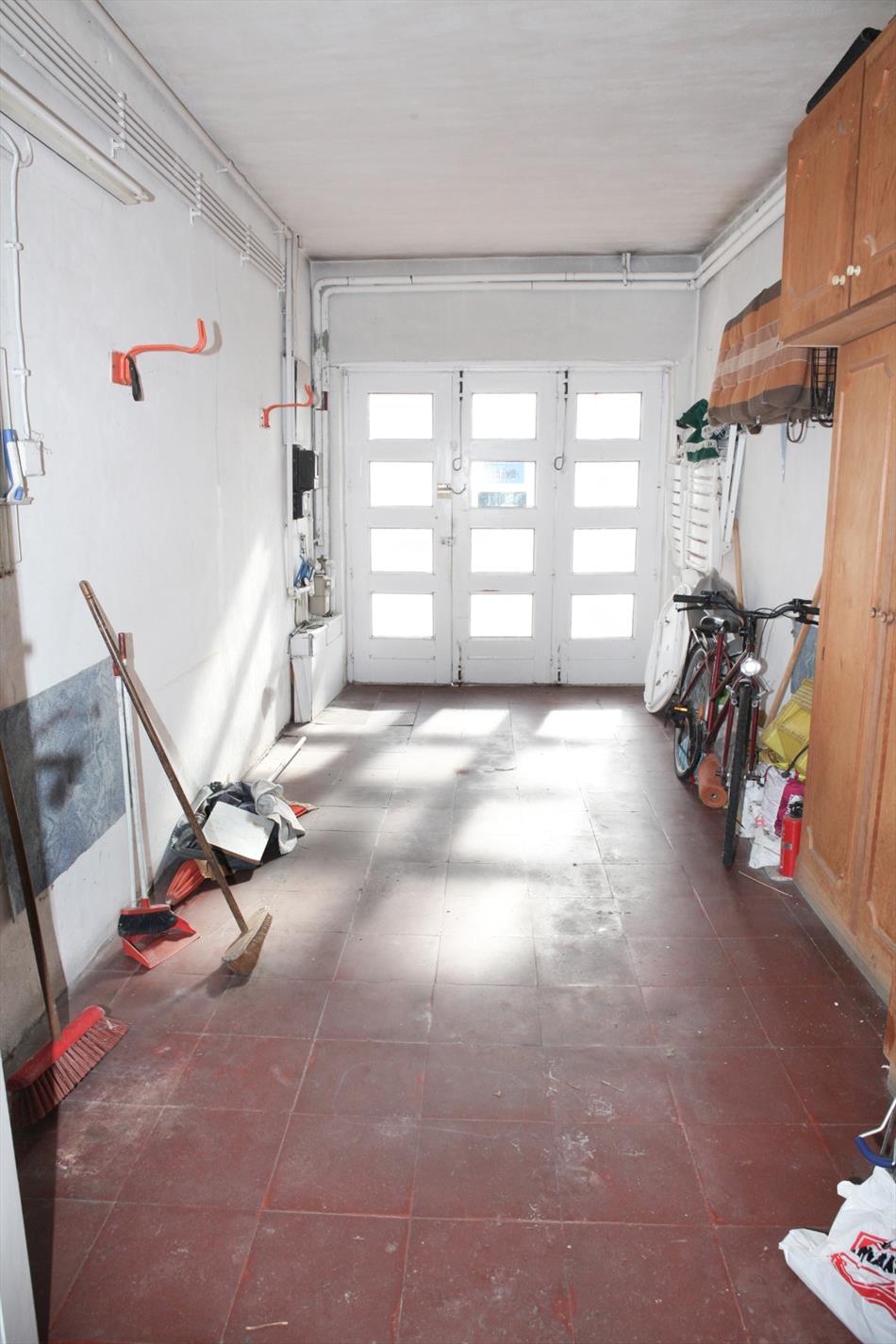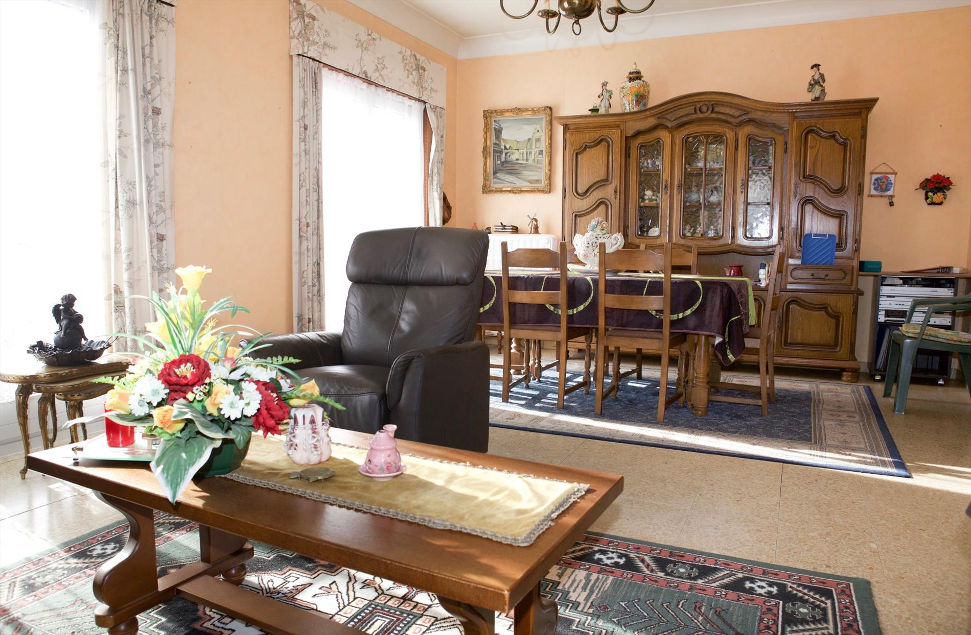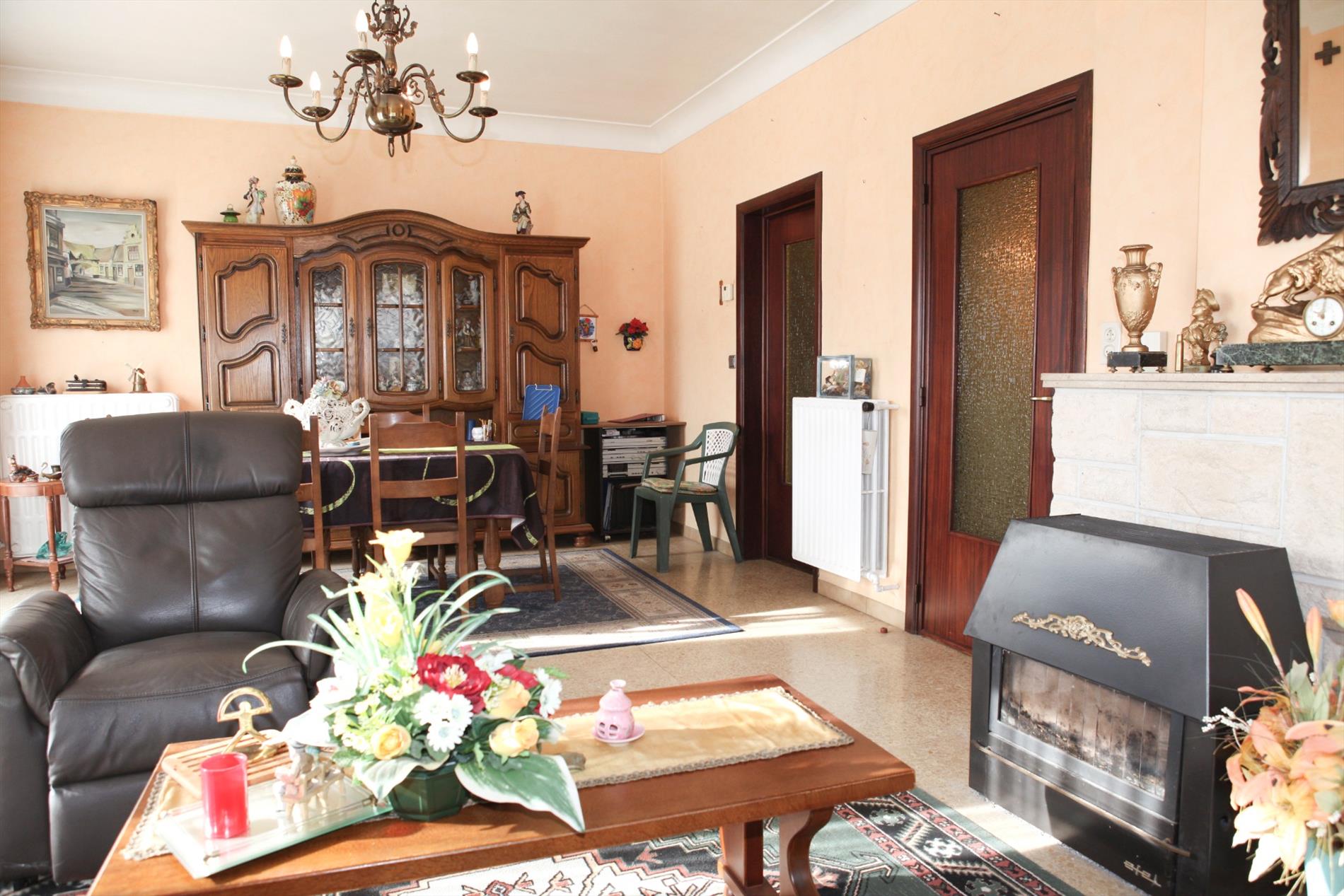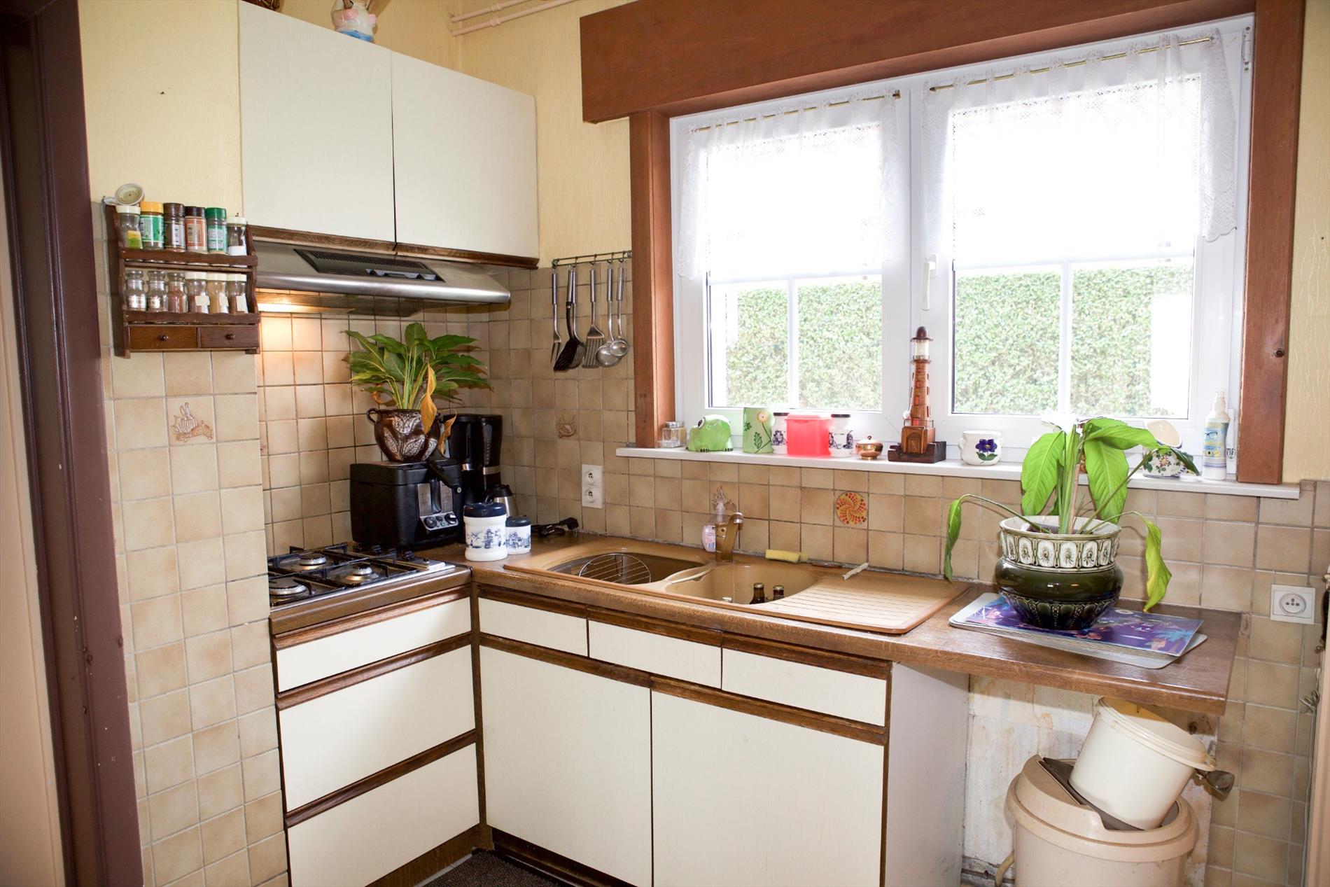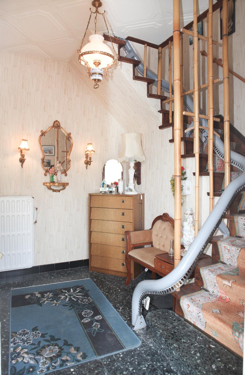 a) gelijkvloers: inkom- & traphal (3,03 x 2,84 * met stijlvolle houten trap + stoellift * marmerachtige tegelvloer),- zonnige & luchtige living + loggia (26 m² * 2 terrasdeuren * bleke marmerachtige tegelvloer),- zonneterras,- keuken (3,25 x 3 * met L-vormige keukenblok + ingebouwde dubbele afwasbak in kunststof, gaskookplaat, en dampkap * ceramieke tegelvloer),- berging (onder de trap * met ingebouwde safe),- garage (6,25 x 2,59 * houten plooipoort, en aardgas-, water-, en elektriciteitstellers + verdeelkast),- toilet (met wc + lavabo) ;