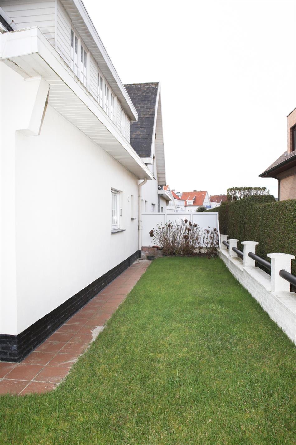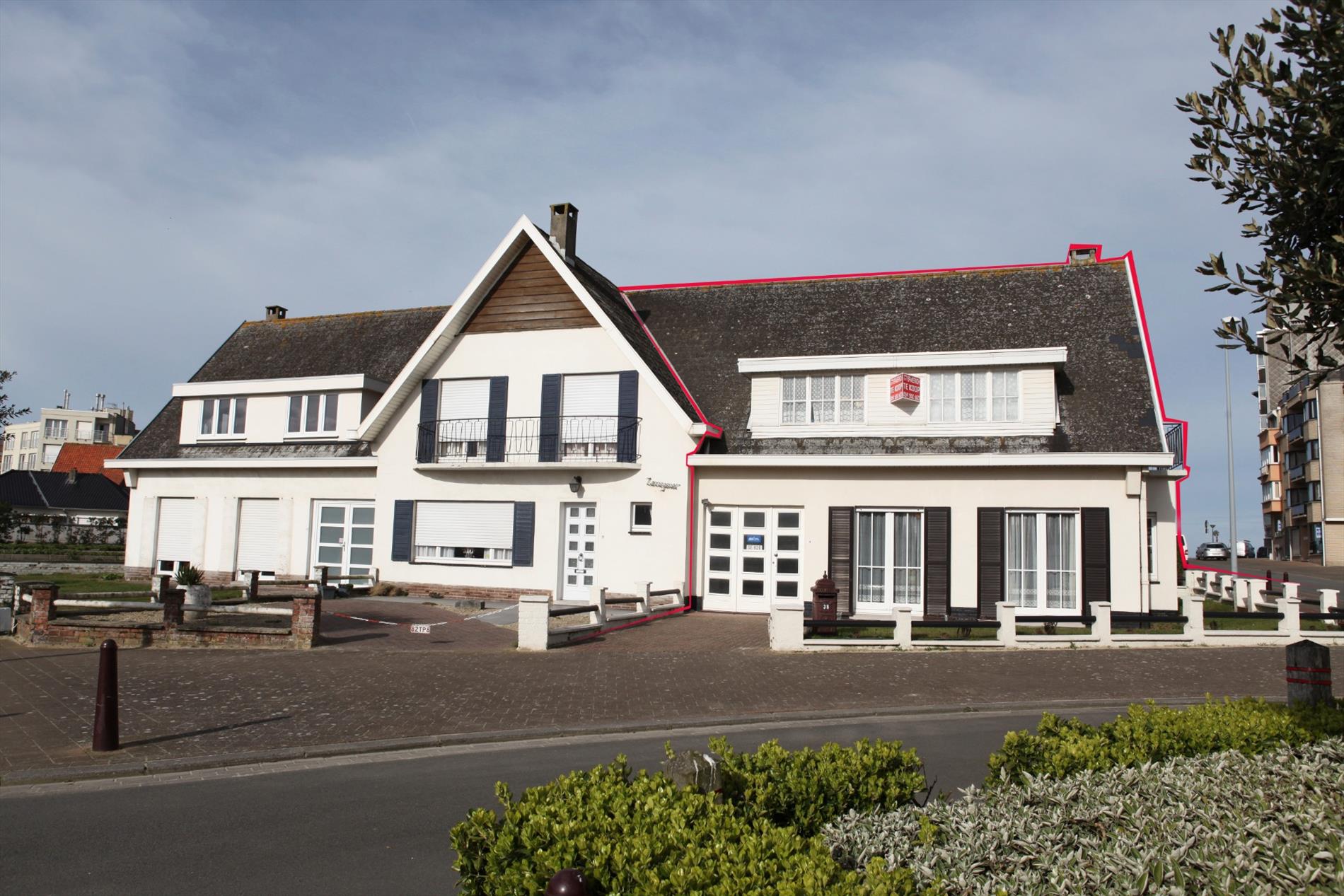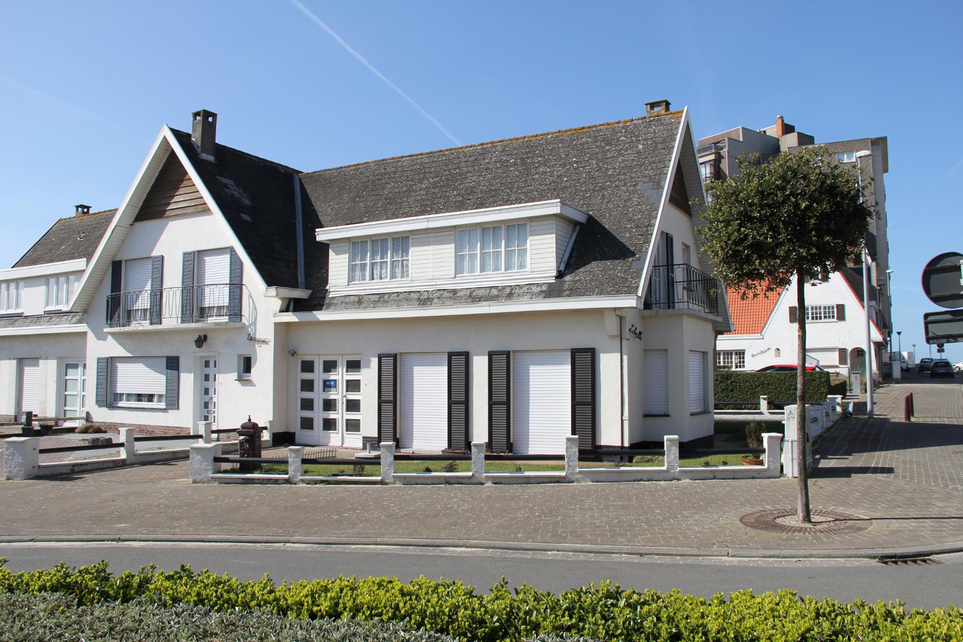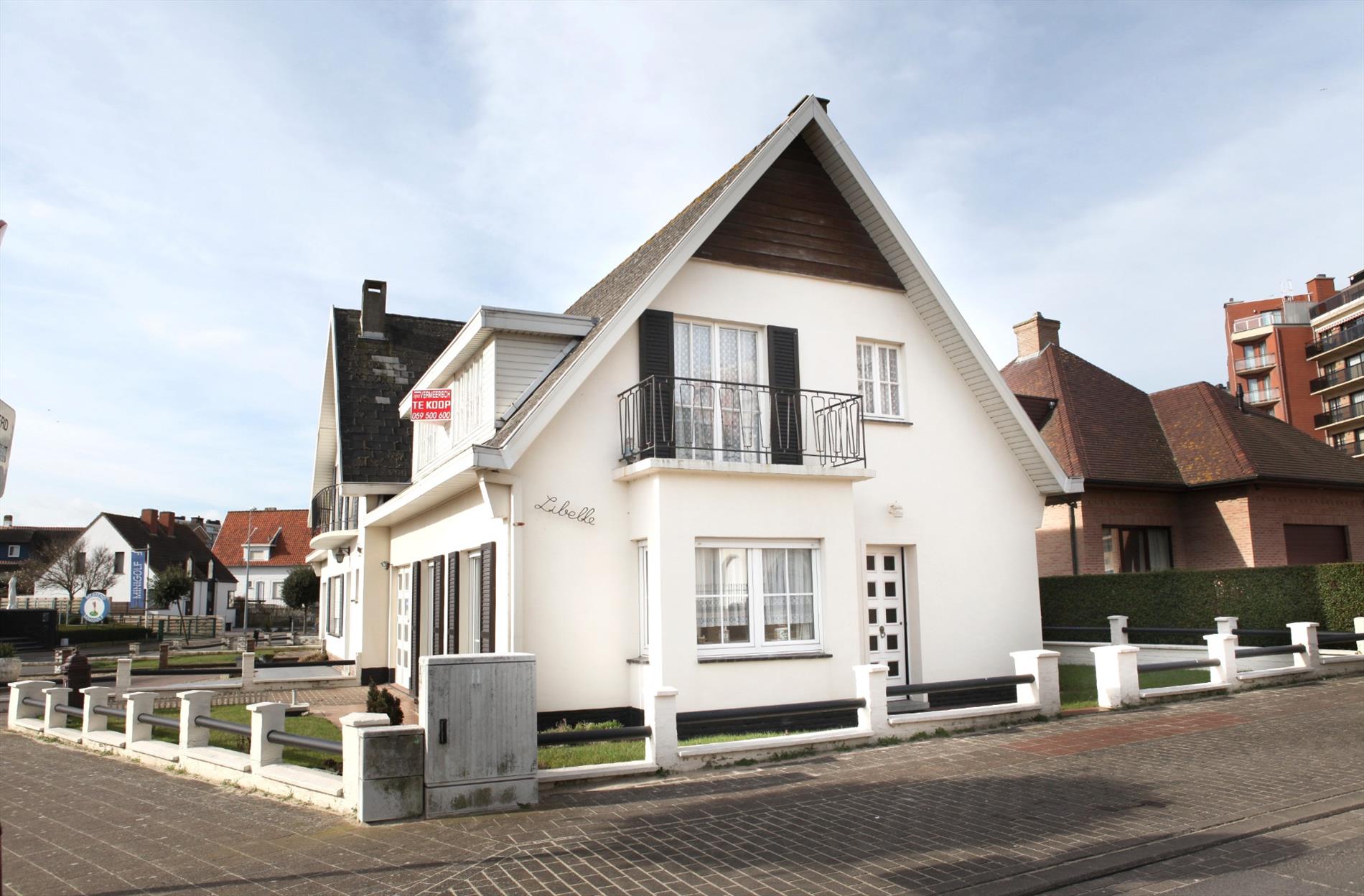 Riante en stijlvolle “half-open-bebouwing villa” met cottage-architectuur (gekend onder de naam : “Libelle”), zéér stevig en op traditionele wijze gebouwd in 1958, op een perceel bouwgrond van 182 m². Drie vrije en verzorgde buitengevels in baksteen, met crepy bezetting en mooi geschilderd (met loggia aan de sierlijke topgevel, met daarboven een terras met zeezicht). Deur- en vensterdorpels in harde blauwsteen. Stevige funderingen en vloerplaten in gewapend beton. Op het gelijkvloers werd het buitenschrijnwerk recentelijk vernieuwd (witte PVC-ramen + super-isolerende dubbele beglazing en rolluiken). Hard zadeldak, belegd met zwarte kunstleien (+ goede isolatie). Dakgoten en kroonlijsten in witte kunststof (PVC). De woonvertrekken beneden en de badkamer zijn voorzien van tegelvloeren. Betegelde voetpad en terras. Oprit-parking in betonklinkers. Zonnige voor-, zij-, en achtertuintje (met sierlijke tuinomheining). Voorzien van stads- & regenwater, elektriciteit, aardgas, teledistributie, telefoon, riolering, en centrale verwarming (d.m.v. aardgas-generator). Mogelijkheid om parking en carport te maken in de achtertuin. Zeezicht vanuit de achter-slaapkamer, badkamer, en terras. De woning geniet van een unieke zonoriëntatie, maar is wel aan een opfrisbeurt toe. Onmiddellijk vrij van gebruik.