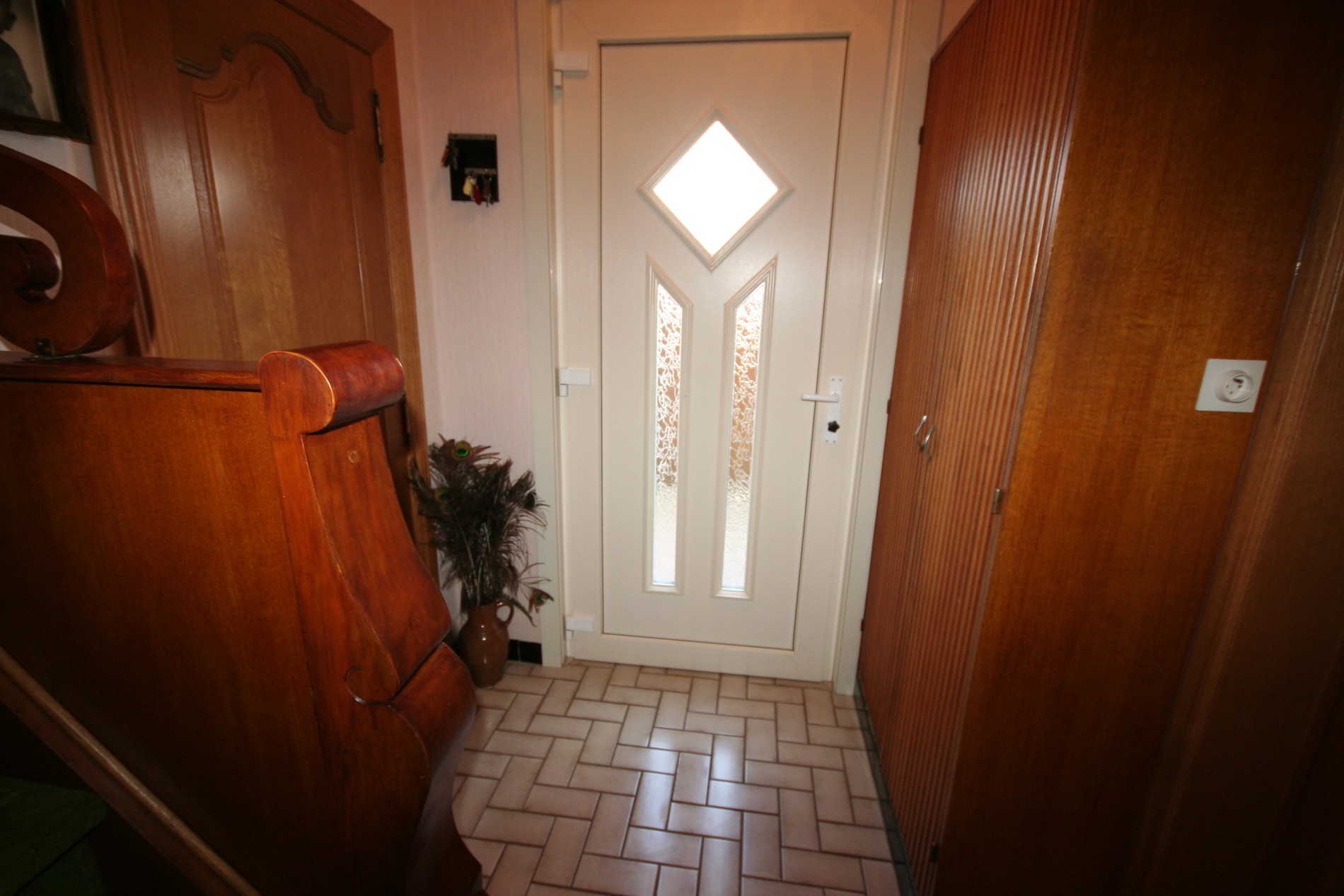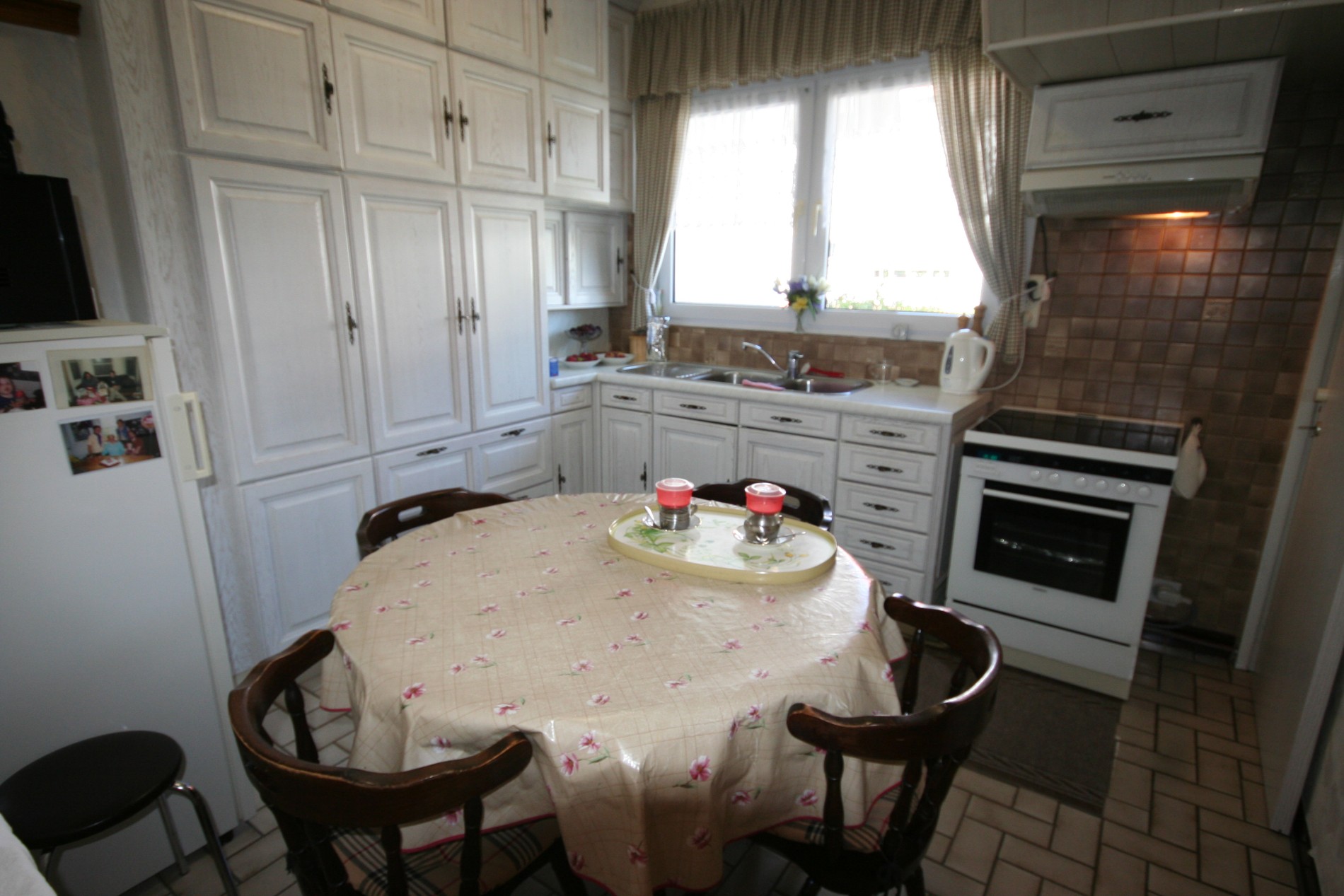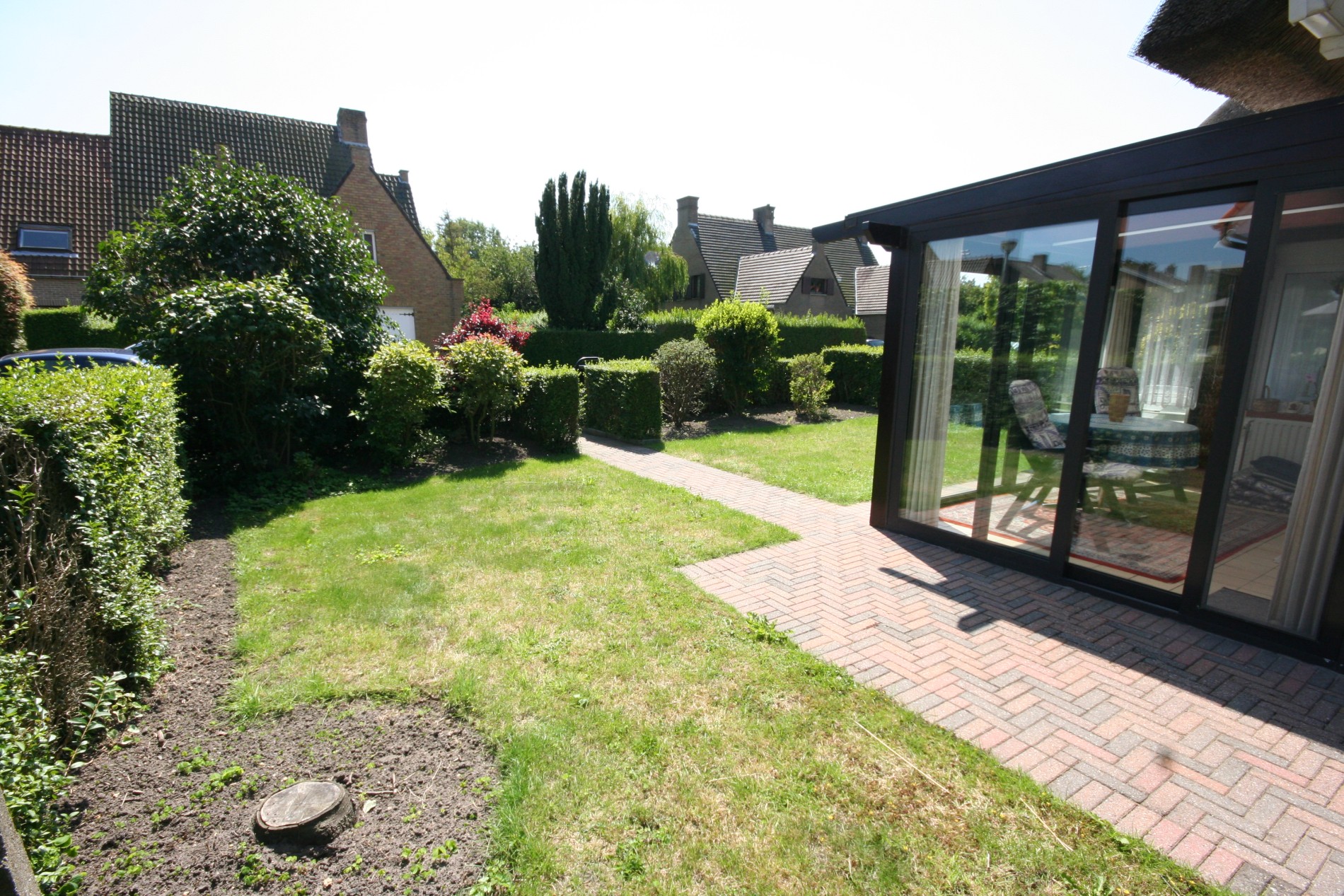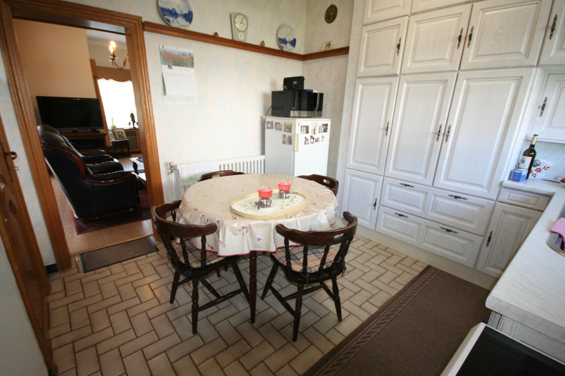 a) beneden: inkomhall + vestiairekast (trap in beuk),- toilet met w.c. + lavabo,- living (27 m²),- aansluitende veranda (3,50 x 2,65),- vernieuwde keuken (3,20 x 3,15) voorzien van L-vormige keukenblok (in wit-grijs gecérusseerd volle eik) + ingebouwde dubbele inox afwasbak, dampkap, elektrisch kookfornuis (ceramische kookplaat), en frigo,- keldergat (met elektrische installatie + teller),- voorraadkelder,- wasplaats met nieuwe H.R.+ wandgenerator (Thermonate Bulex), afgietbak, aansluiting voor was- & droogautomaat, en achterdeur + buitentrap (met kast + aardgasteller),- mooi en zonnige achtertuintje,- oprit,- garage (5,30 x 2,70) met metalen kantelpoort,- zonnig zijtuintje met châlet-tuinhuisje,- zonneterras,- en zonnig voortuintje ;